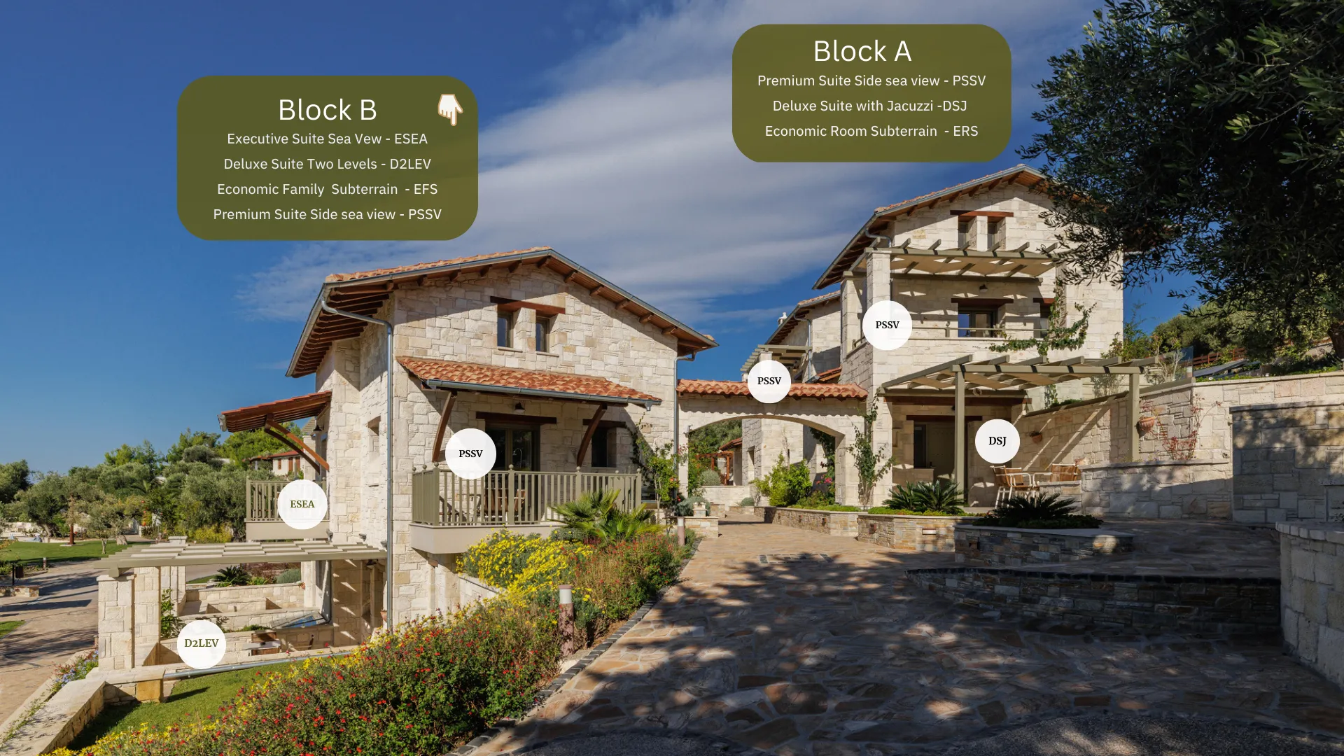 Dvospratni apartmani tipa „Executive“ mogu da prime do 4 osobe. Sa panoramskim pogledom na more, udobnim i svetlim dnevnim boravkom, ali i mekim i prijatnim tonovima boja, stvaraju savršen ambijent za odmor. Sastoje se od stilskog dnevnog boravka i potpuno opremljene kuhinje, dok unutrašnje stepenice vode do prostrane spavaće sobe. Sa njihove prelepe terase možete uživati u plavetnilu mora i maslinjacima koji ga okružuju.