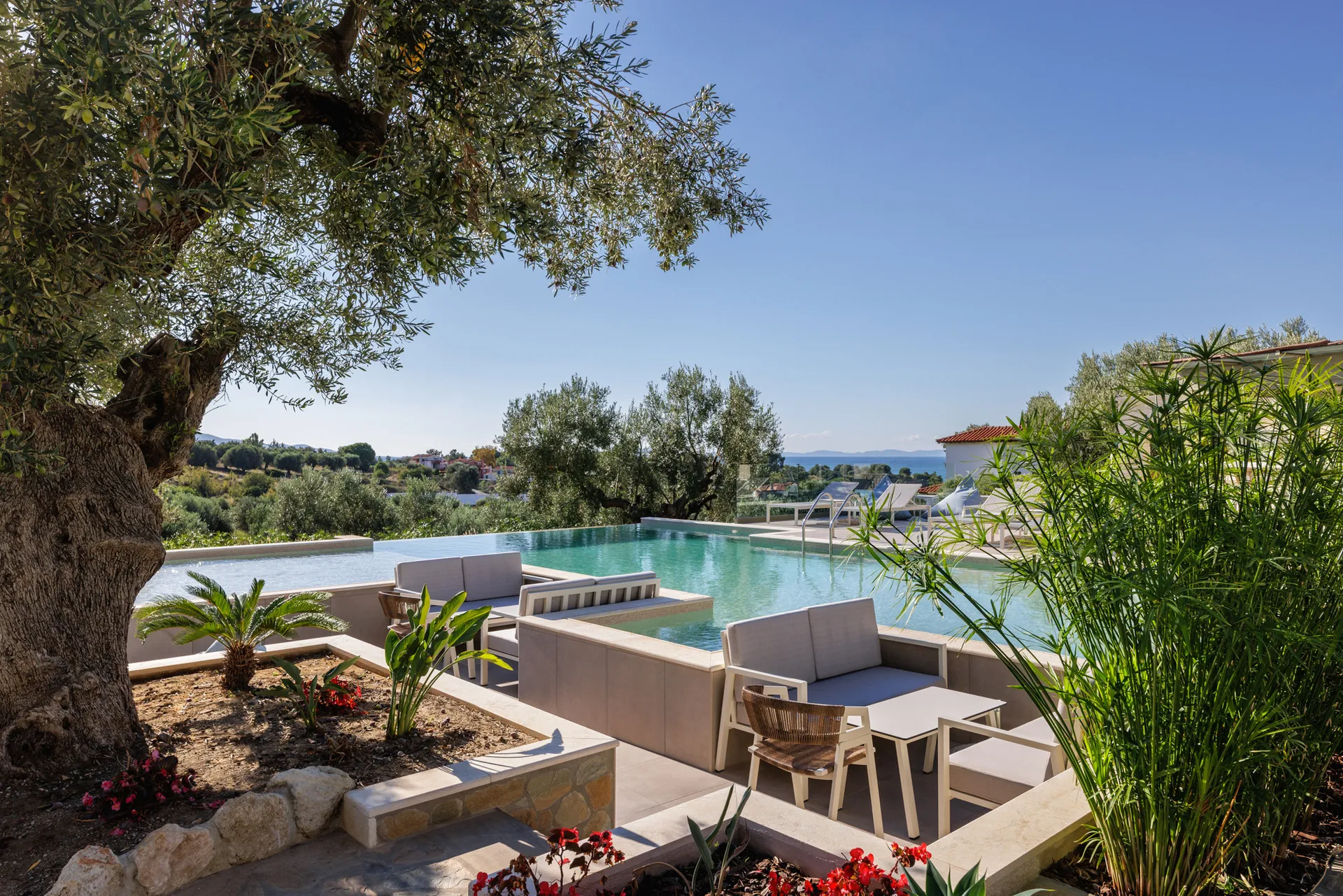 Uživajte u plivanju i kupanju u smaragdnoj vodi bazena i opustite se na ležaljci uživajući u suncu i pogledu na more.