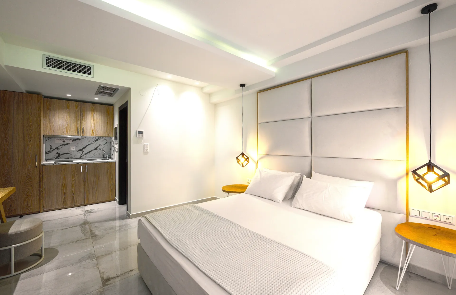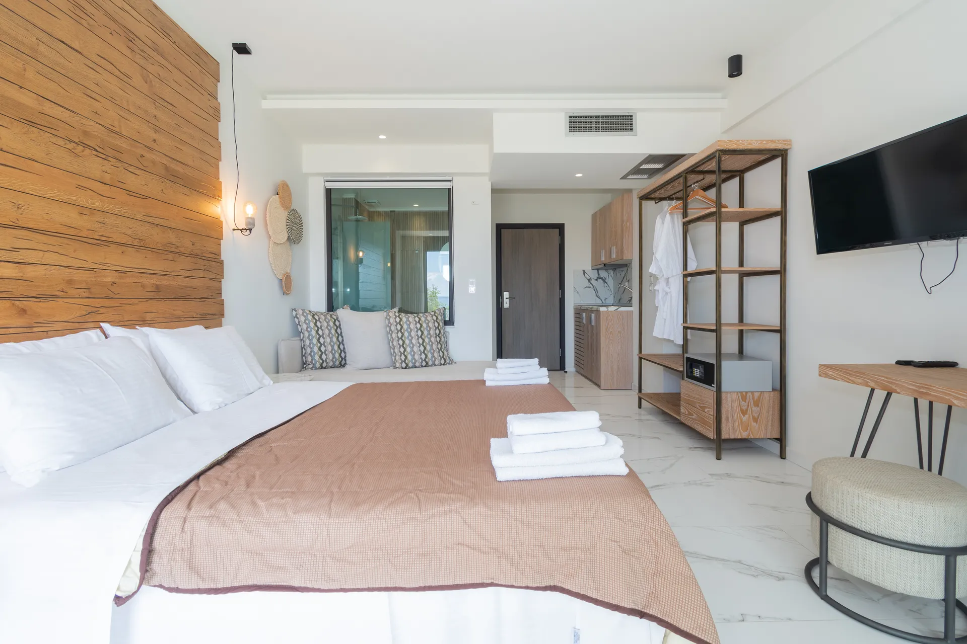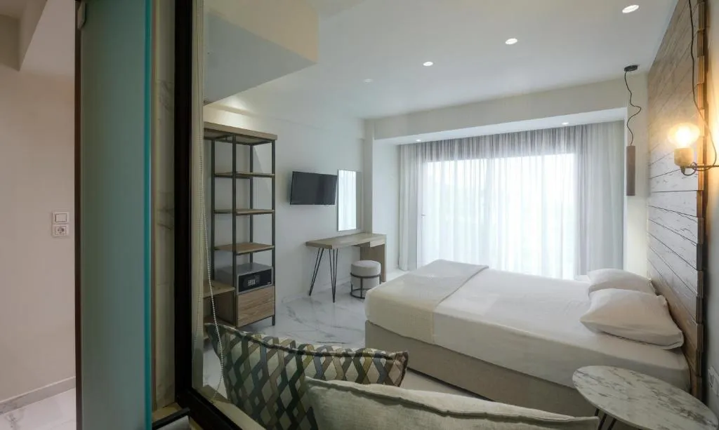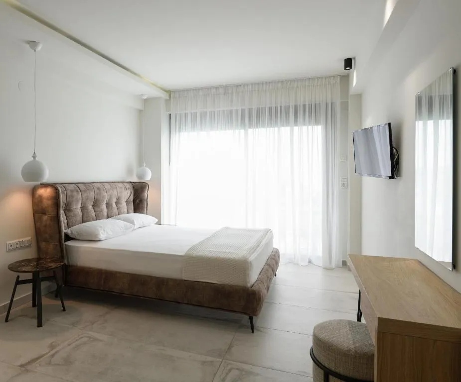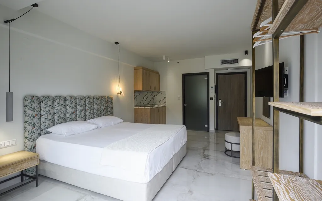 Deluks studio sa pogledom na more, naša dvokrevetna soba sa pogledom na more, oaza udobnosti i opuštanja, posebno dizajnirana za dve osobe. Ova soba nudi miran prostor gde možete da se odmorite i uživate u jedinstvenim zalascima sunca iznad prelepe plaže Marmaras.