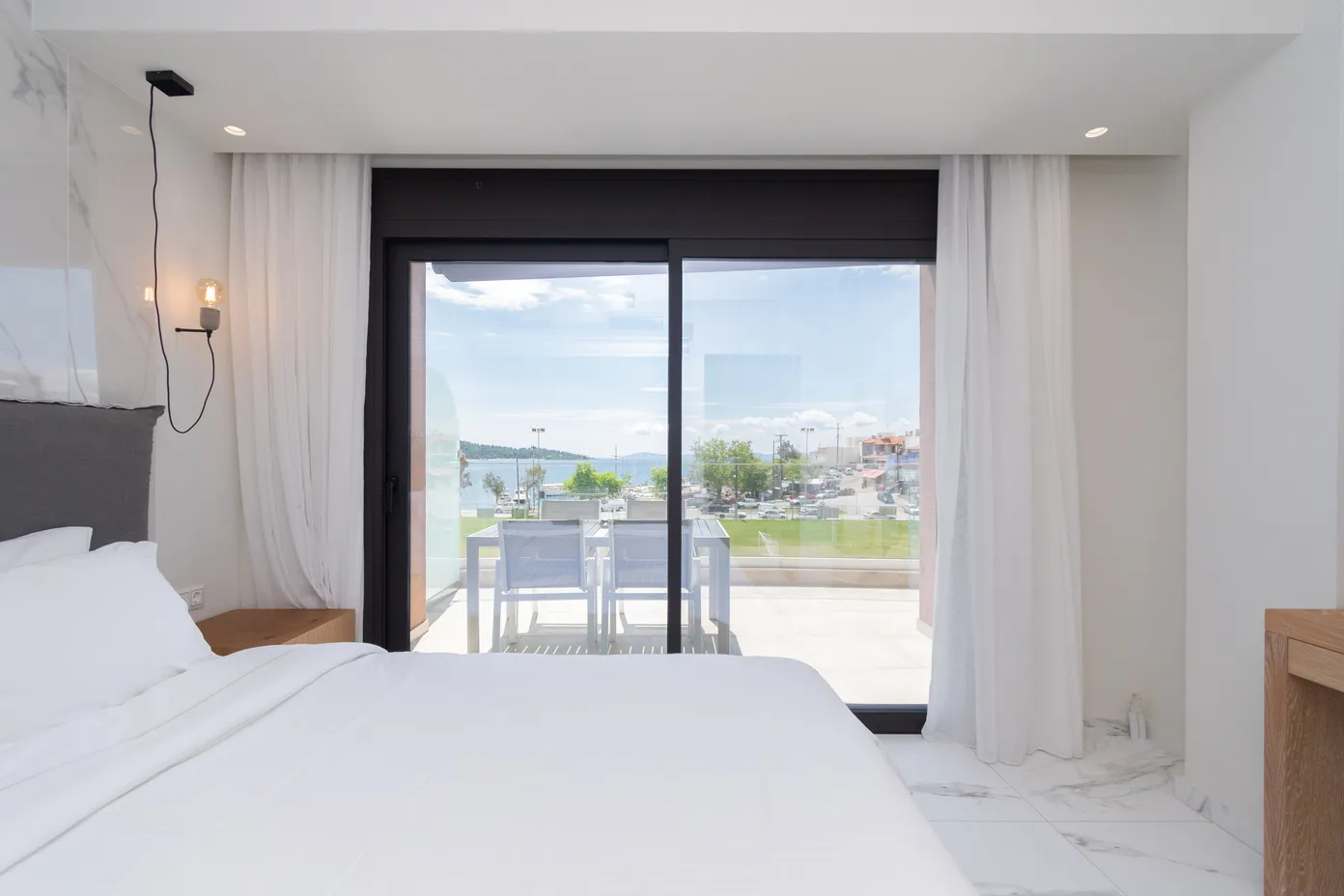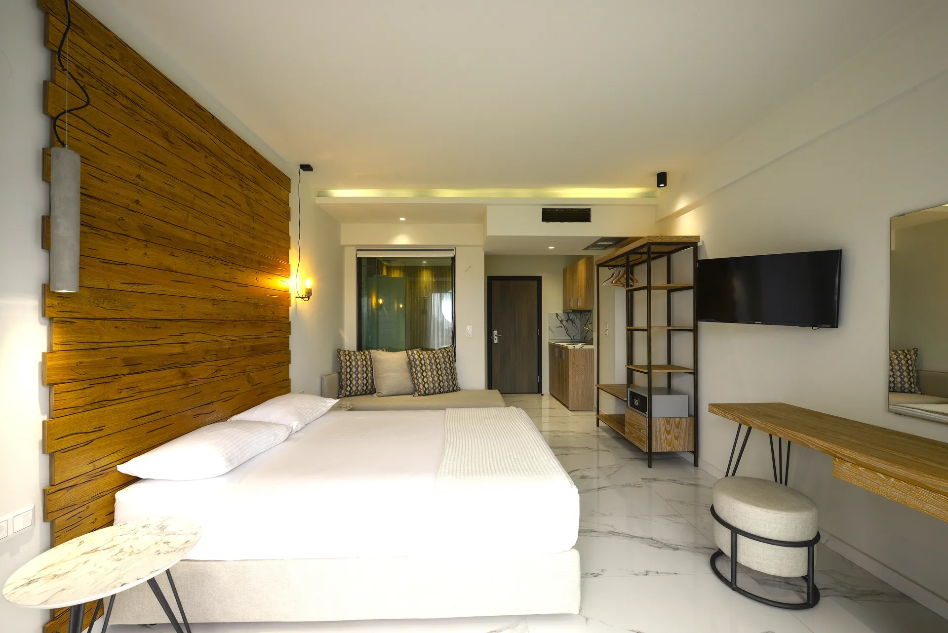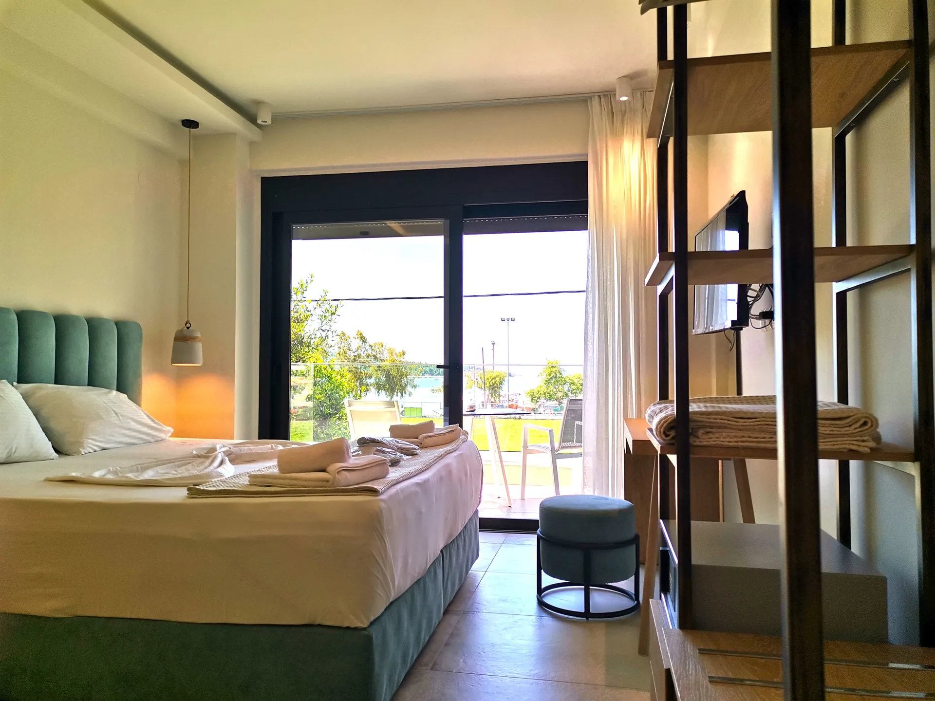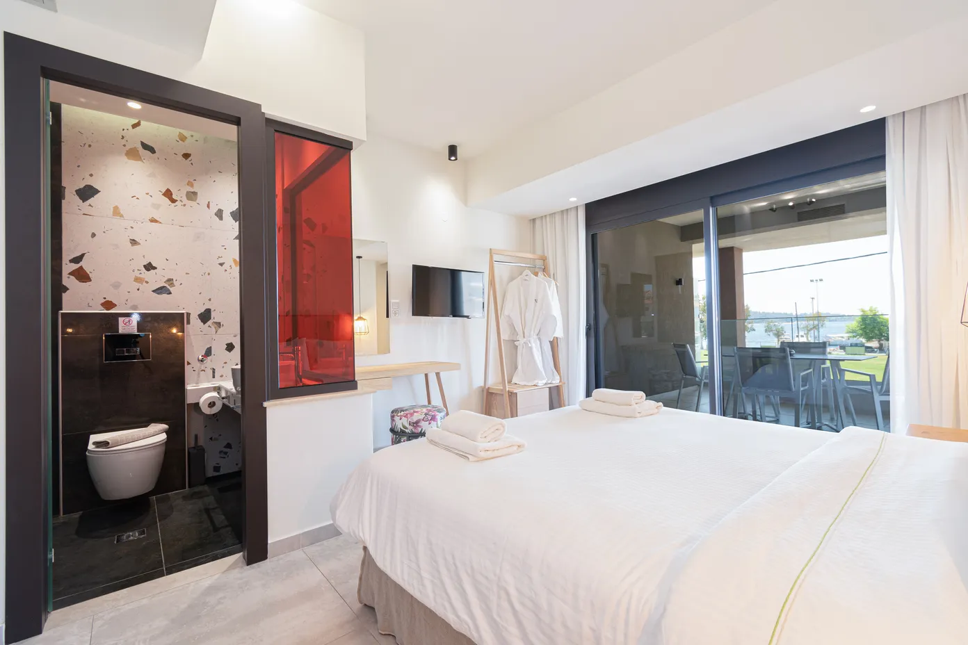 Junior apartmansa pogledom na more. Ove velike trokrevetne sobe imaju bračni krevet i ležaljku-sofu u istom prostoru. Dizajnirane sa jedinstvenim estetskim pristupom, nude apsolutnu udobnost.
