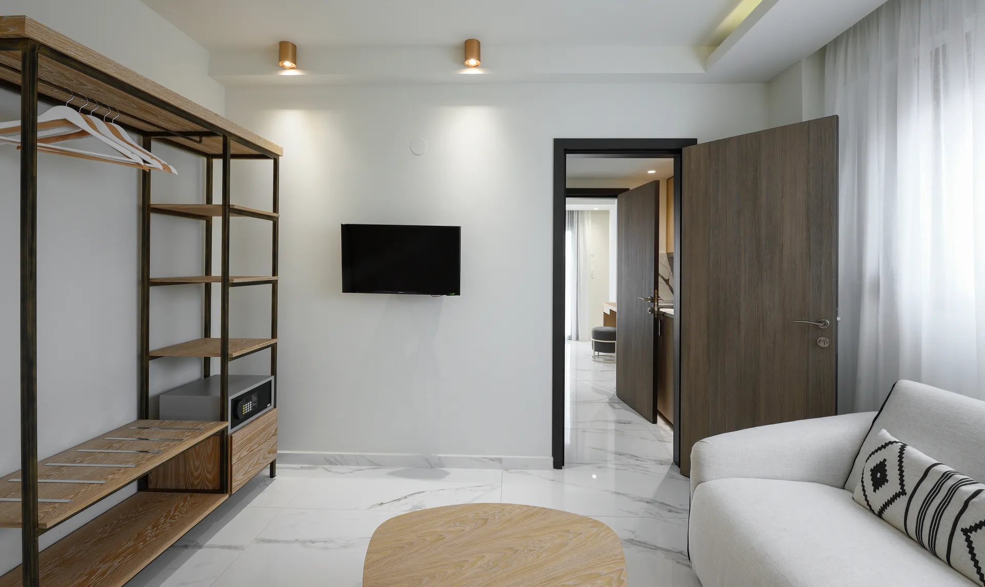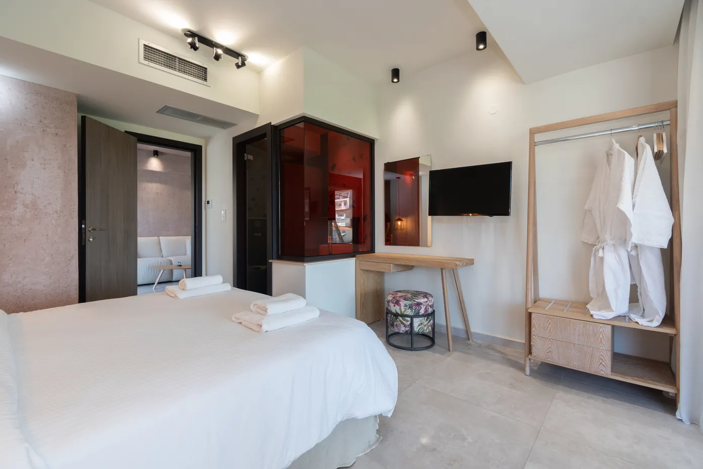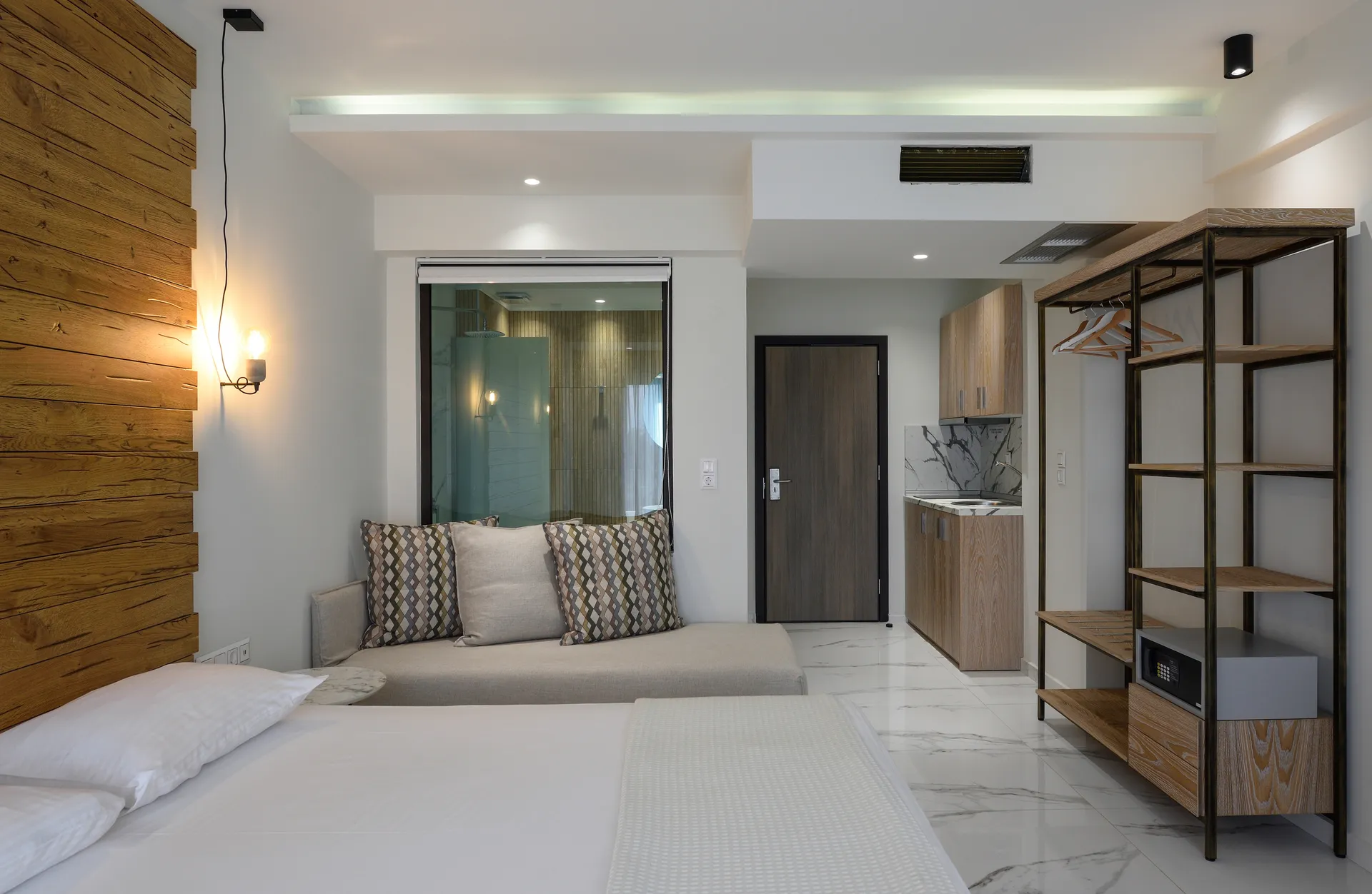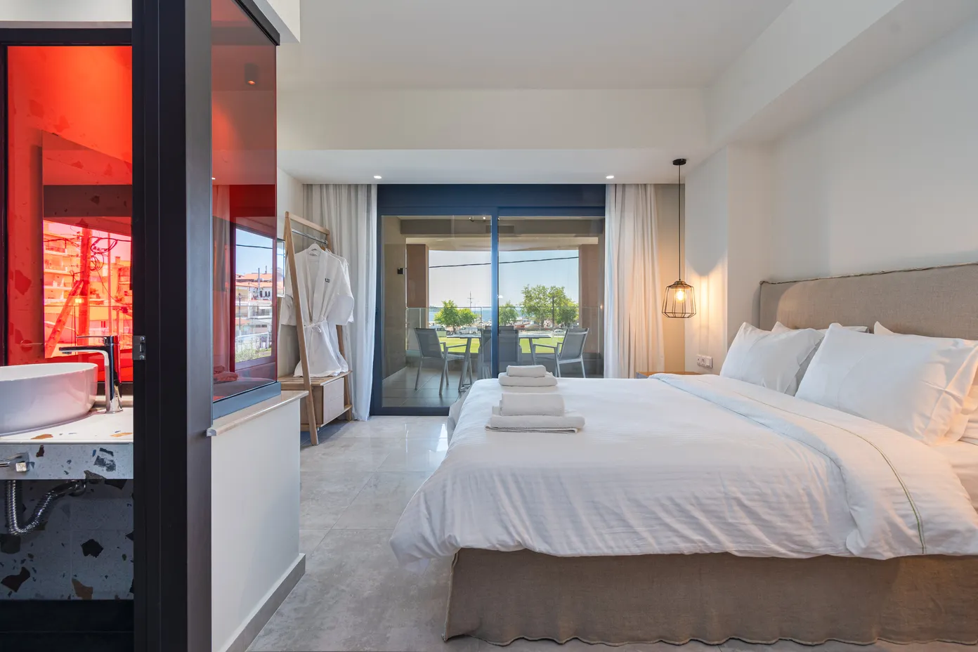 Junior apartmansa pogledom na more. Ove velike trokrevetne sobe imaju bračni krevet i ležaljku-sofu u istom prostoru. Dizajnirane sa jedinstvenim estetskim pristupom, nude apsolutnu udobnost.