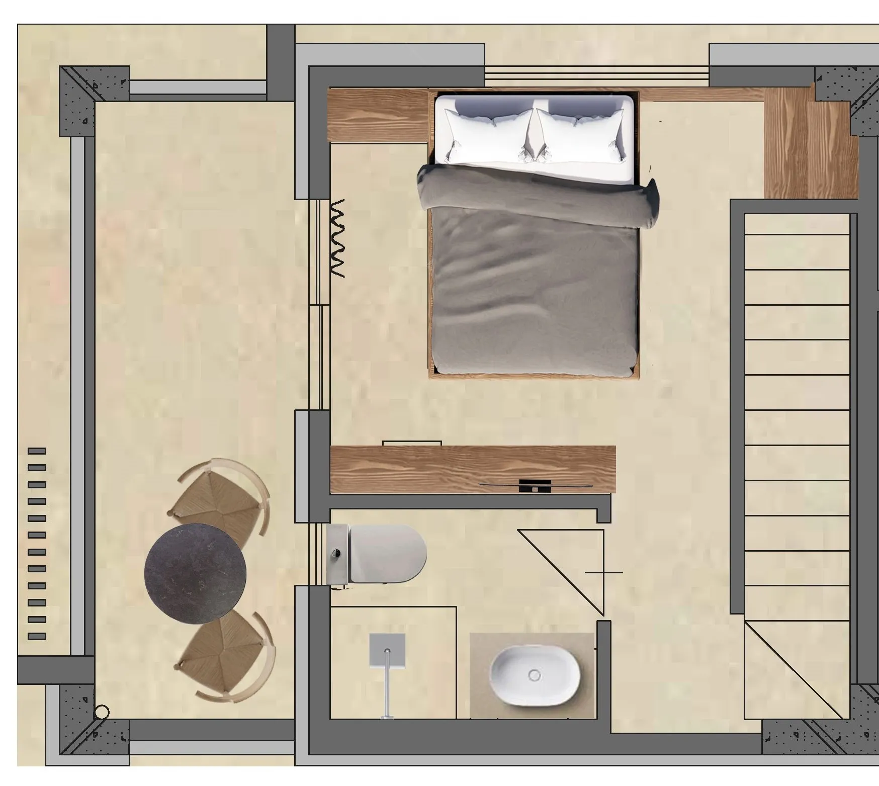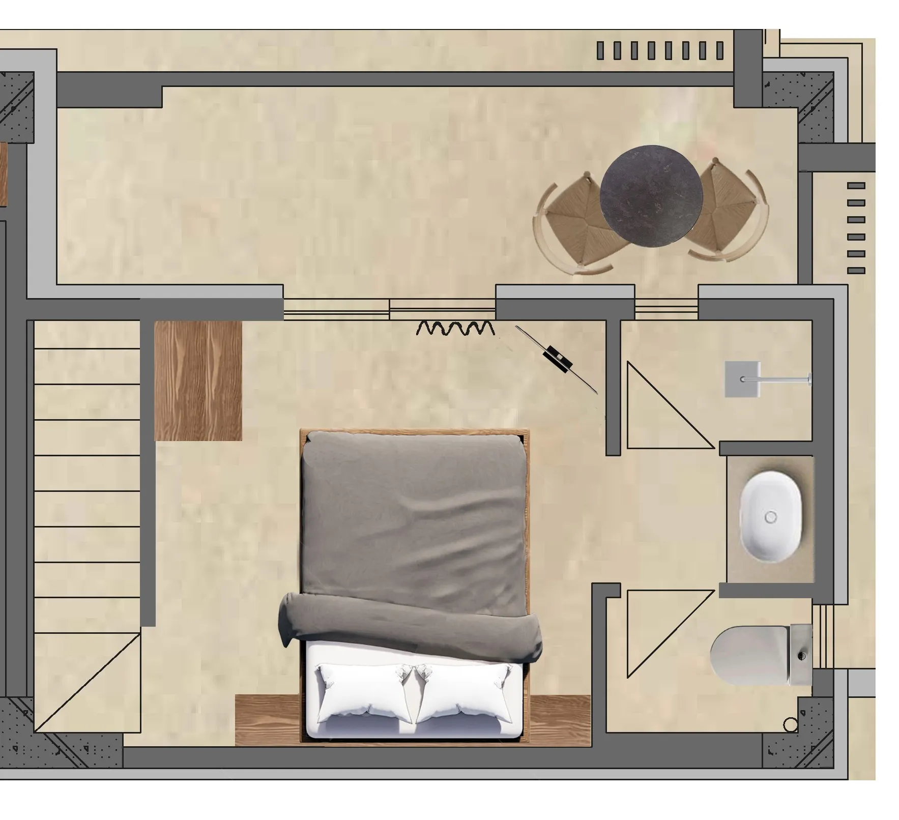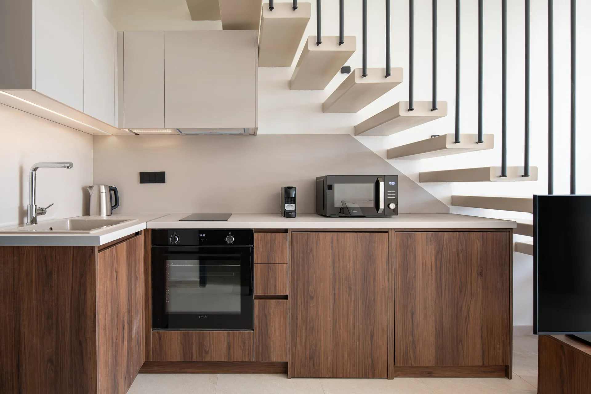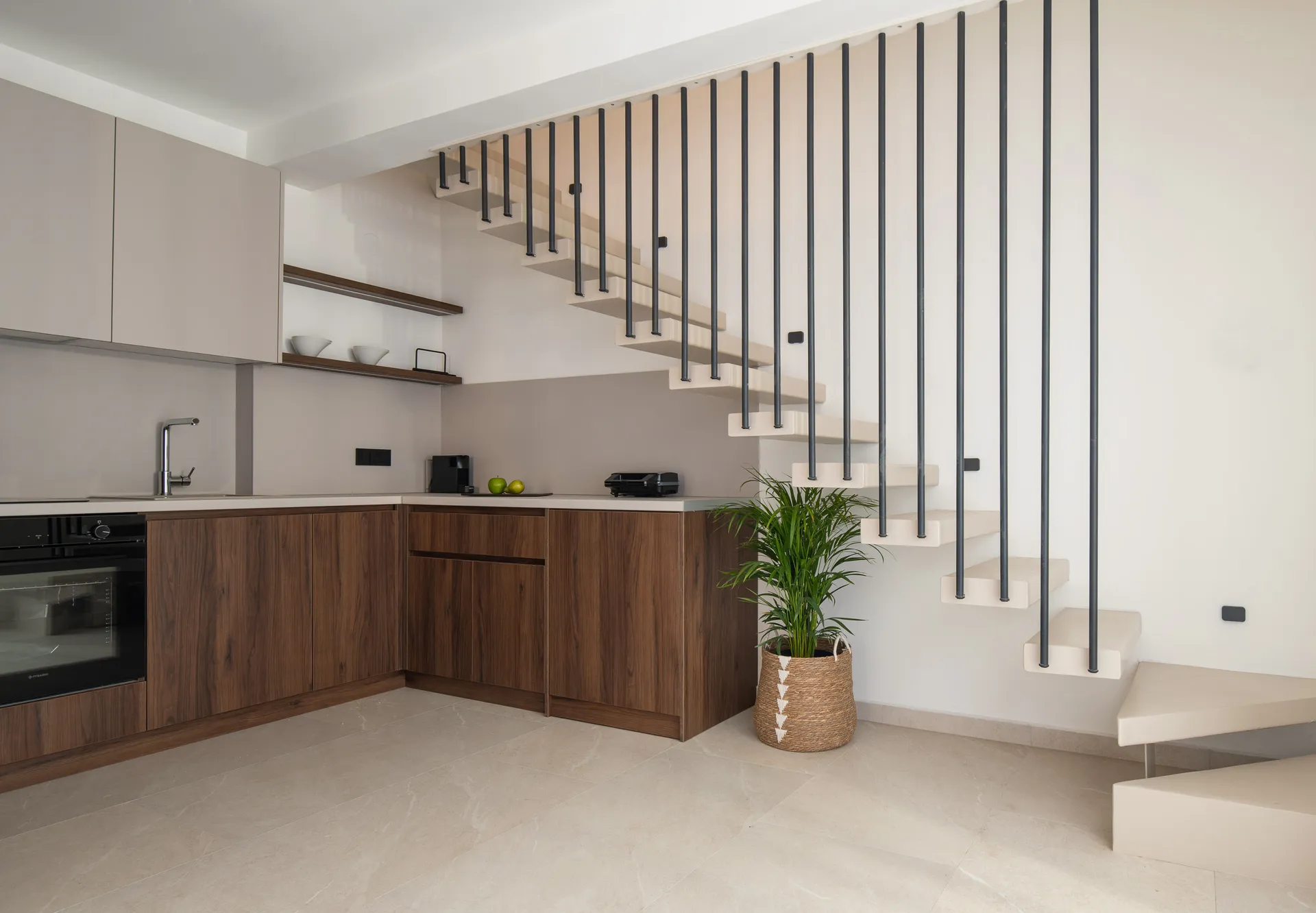 U prizemlju ćete pronaći udoban dnevni boravak sa sofom na razvlačenje (1,6 x 2 m) za smeštaj do dva gosta, potpuno opremljenu kuhinju sa aparatom za kafu Nespresso, električnim kuvalom i modernim aparatima, kao i stilsko kupatilo. Elegantno stepenište vodi do gornjeg sprata, gde vas čekaju prostrana spavaća soba sa bračnim krevetom (1,6 x 2 m), dodatno kupatilo i privatni balkon.