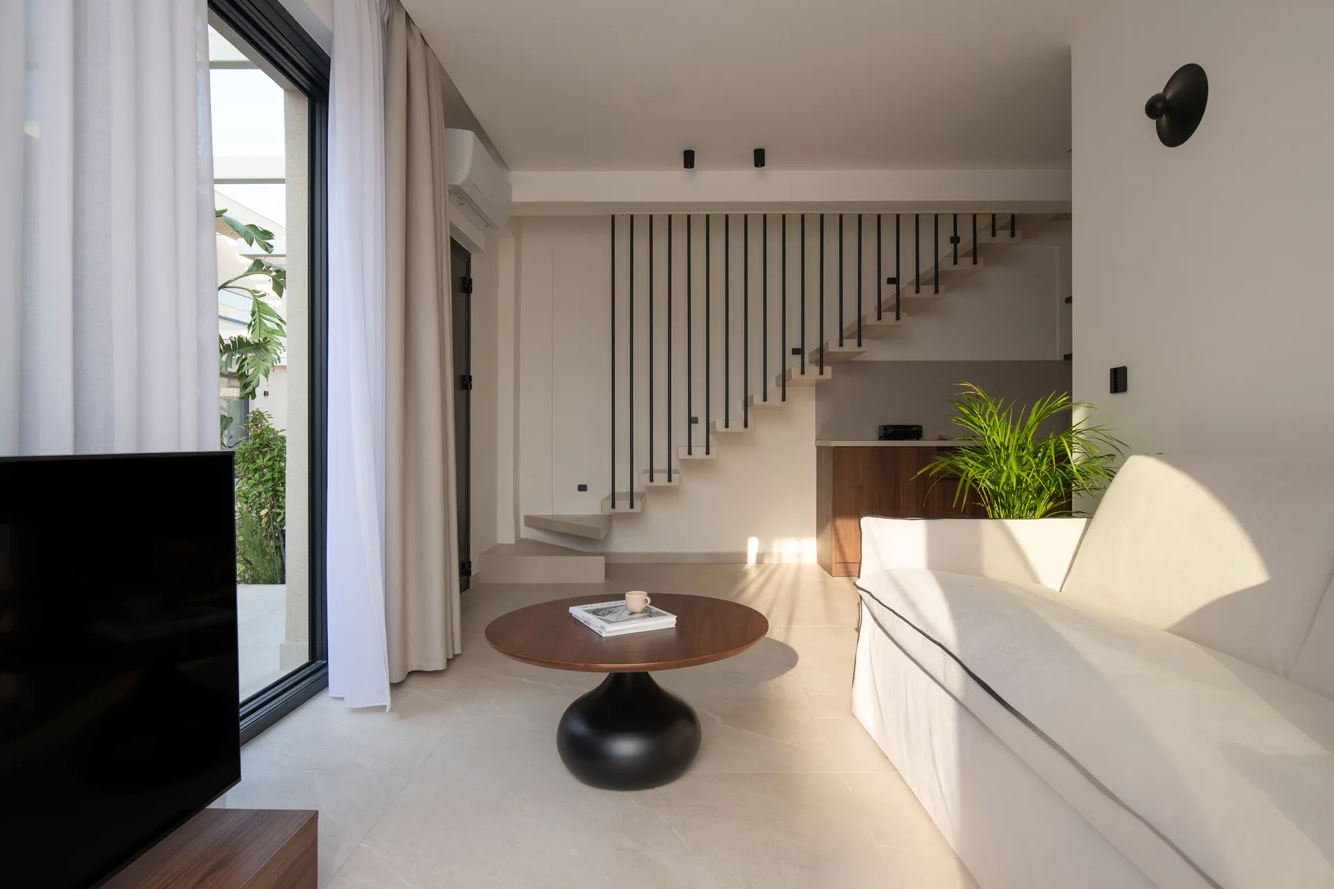 U prizemlju ćete pronaći sofisticirani dnevni boravak sa sofom na razvlačenje za dve osobe (1,6 x 2 m), potpuno opremljenu kuhinju sa aparatom za kafu Nespresso, električnim kuvalom, frižiderom i modernim aparatima, kao i stilsko kupatilo. Elegantno stepenište vodi do gornjeg sprata, gde se nalazi prostrana glavna spavaća soba sa bračnim krevetom (1,6 x 2 m), dodatno elegantno kupatilo i privatni balkon koji pružaju zadivljujući pogled na okolinu.