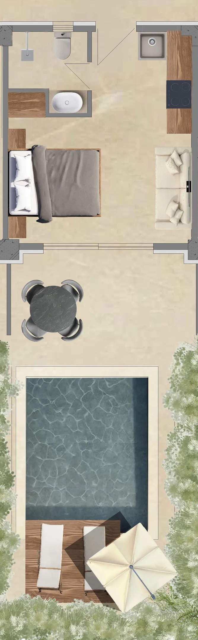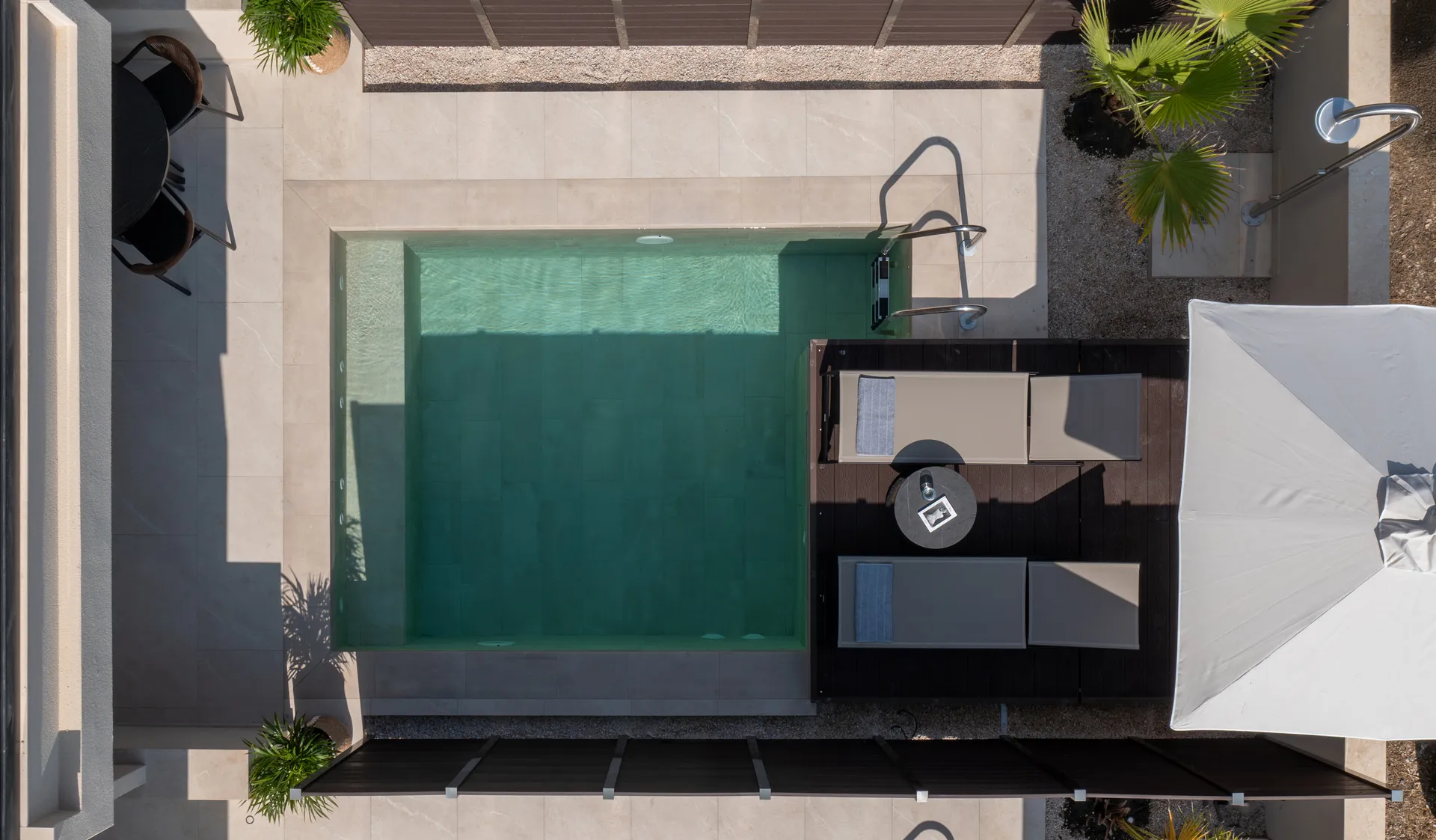 Vrhunac ovog apartmana je prostrani privatni spoljni prostor od 55 m², sa zapanjujućim privatnim bazenom i prelepo dizajniranom terasom sa stilskim baštenskim nameštajem – savršenim za sunčanje, opuštanje ili uživanje u mirnim trenucima u potpunoj privatnosti. Bez obzira da li tražite mirno bekstvo ili moderno pametno iskustvo života, Dupleks apartman | Privatni bazen obezbeđuje nezaboravan boravak.