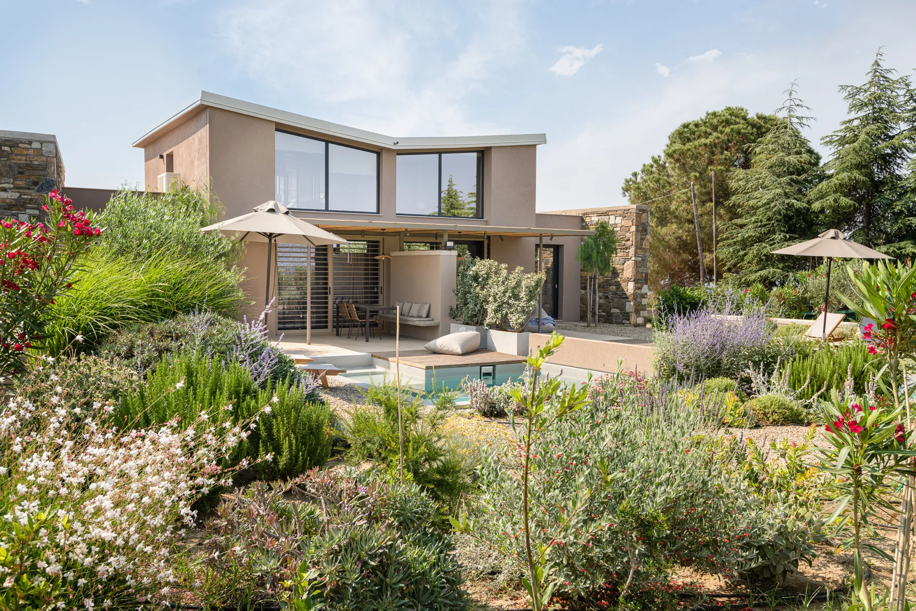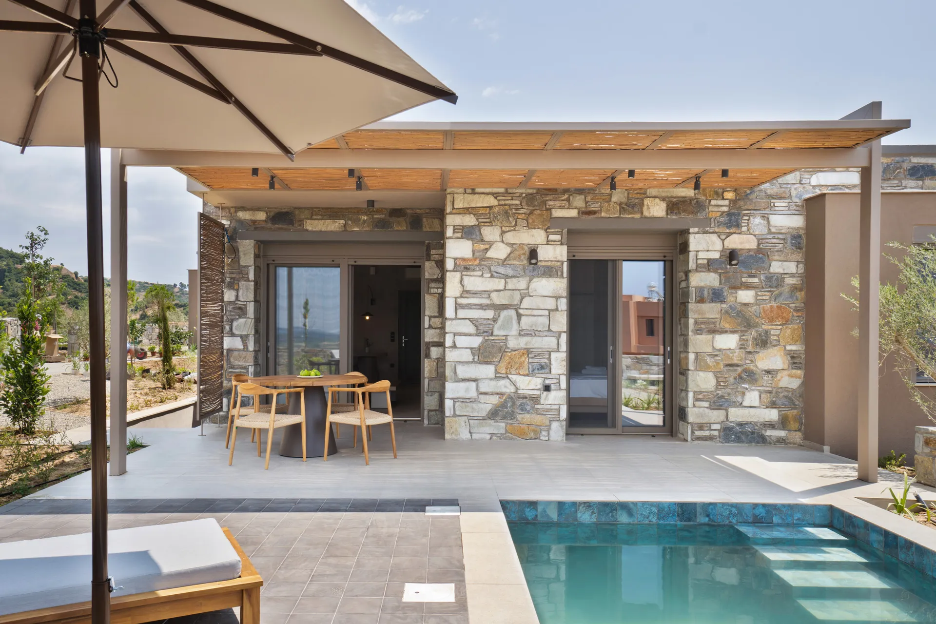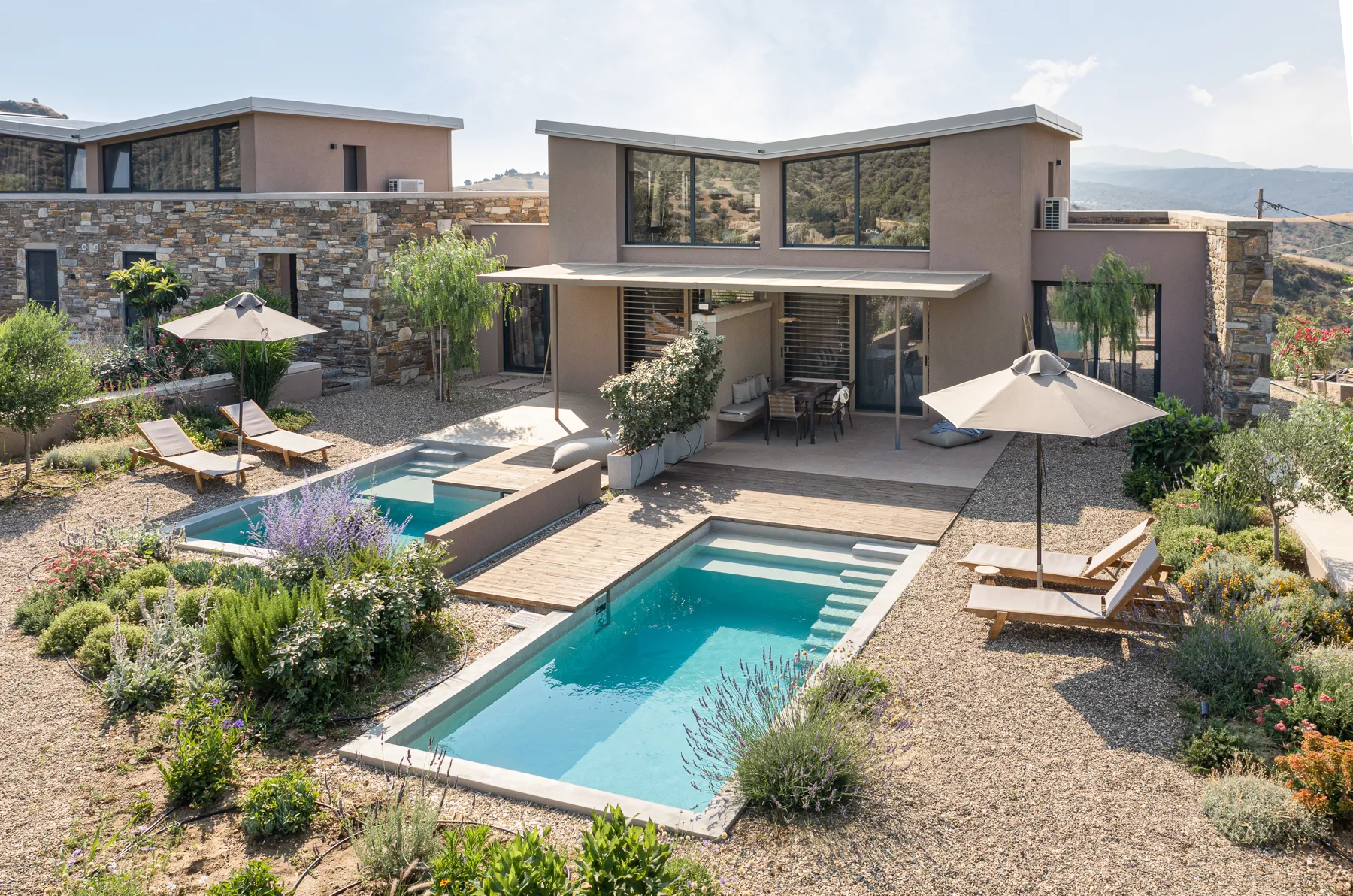 U mediteranskoj bašti, moderne kamene vile sa privatnim bazenom stvaraju opušteno i mirno okruženje.