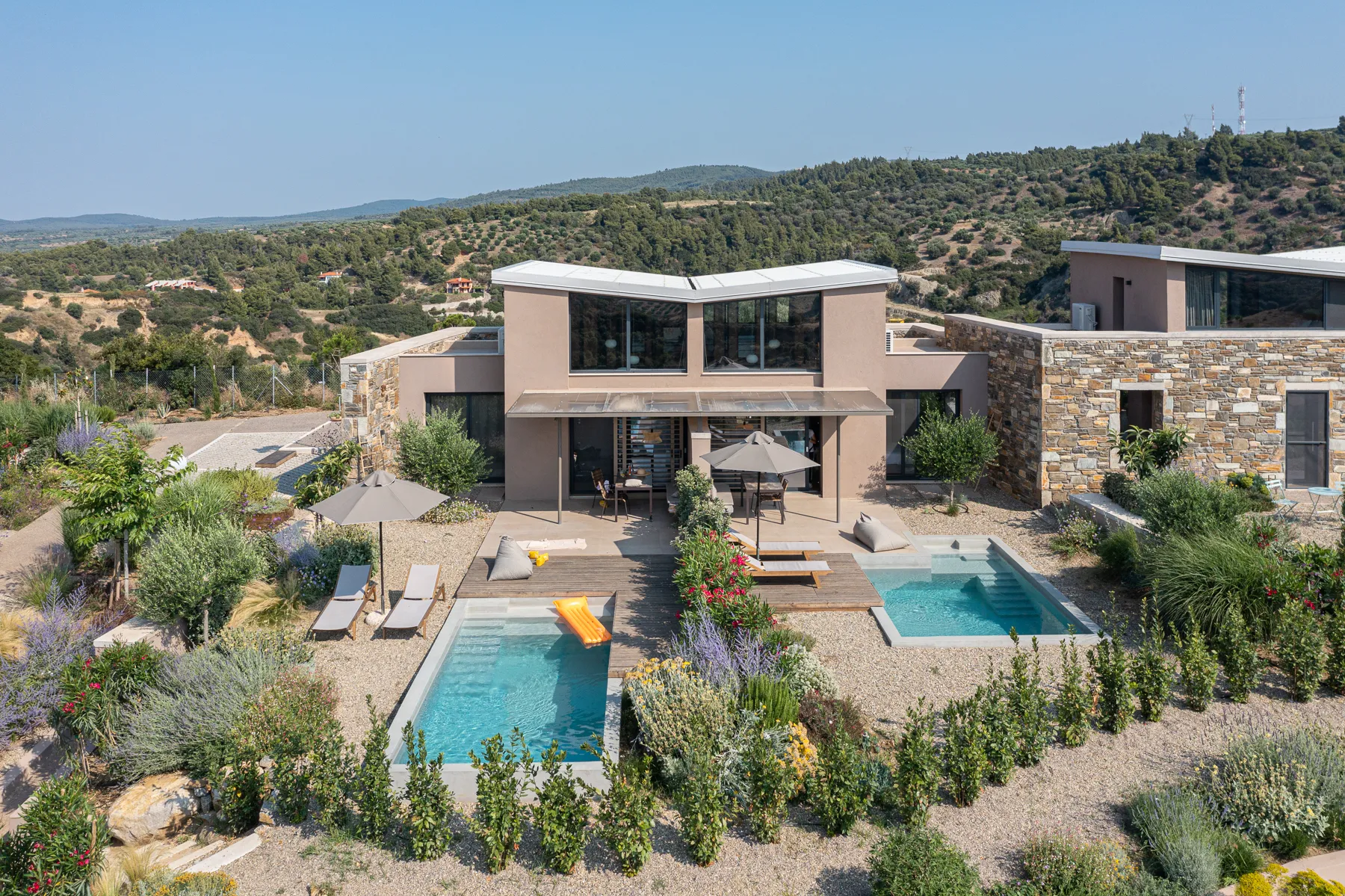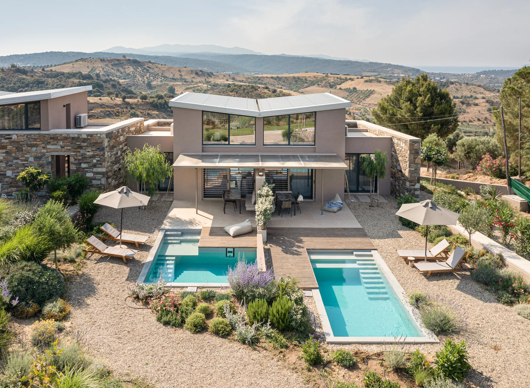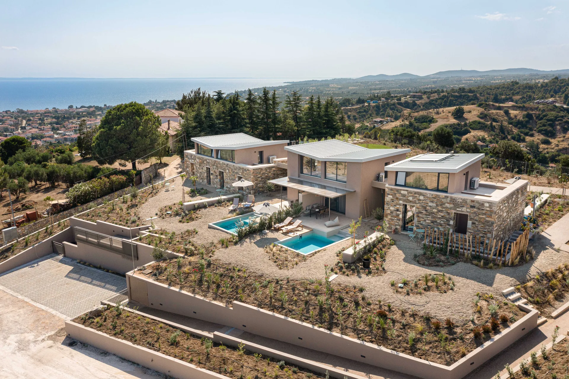 Smešteni na vrhu bujnog brda u šarmantnom selu Nikiti, Halkidiki, naša 2 kompleksa sastoje se od 18 izvrsnih kamenih vila koje nude zadivljujući panoramski pogled na more, valovite planine i zadivljujuće zalaske sunca. Okružena mirnom mediteranskom baštom, svaka vila je pažljivo dizajnirana sa privatnim bazenom, spajajući savremenu eleganciju sa dubokom vezom sa prirodom.