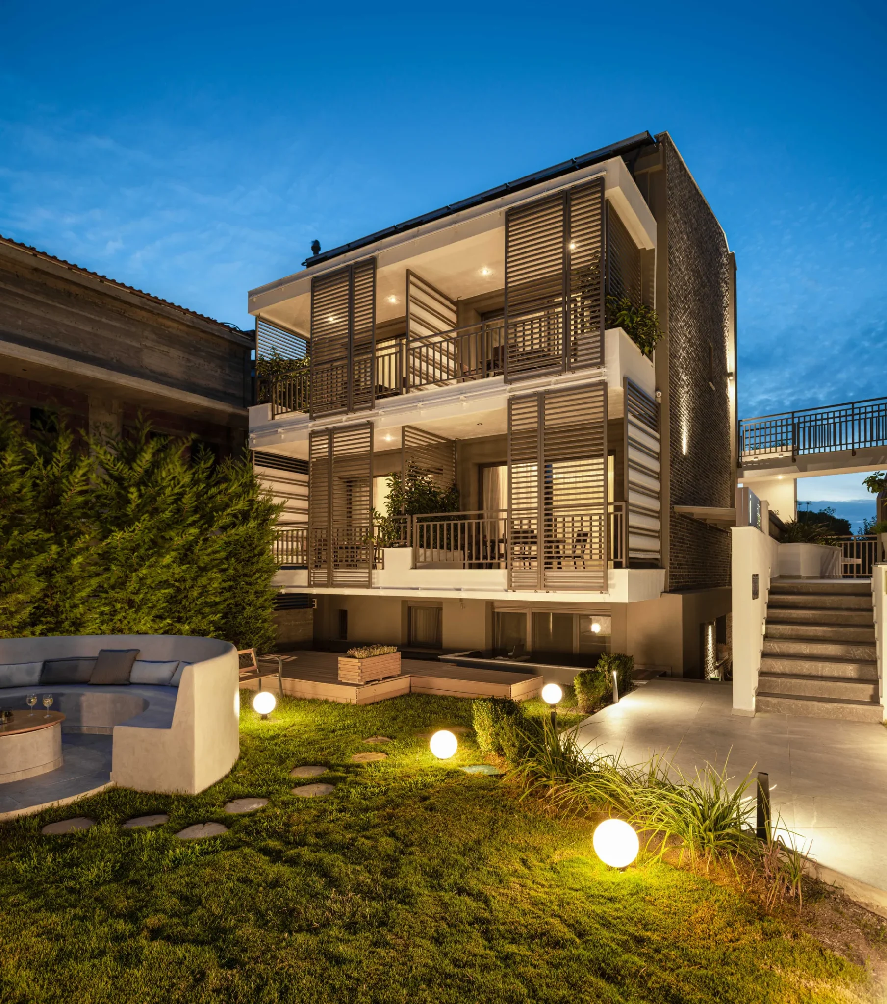Elegantni mezonet sa zemljanim stilom nudi divan boravak. Novodizajnirane, udobne sobe sa pogledom na baštu, idealne za smeštaj do 4 osobe, jer se sastoje od bračnog kreveta veličine „king-size“ sa dušecima „Coco-Mat“ i dva tipa jastuka i sofe koja se trenutno pretvara u bračni krevet veličine „king-size“, sa nezavisnim dušecima sa oprugama. Dva WC-a i dva kupatila. Jedan WC i odvojeni tuš sa efektom kiše sa sedištem, a drugi sa WC-om i odvojenim sistemom za masažu vodom na bočnom zidu, idealan za korišćenje kao tuš sa efektom kiše ili kao terapijska masaža vodom. Udobni balkoni sa trpezarijskim stolom sa pogledom na baštu i fontanu vodopada. Dvospratni smeštaj, gornji prizemlje i poluprizemlje.