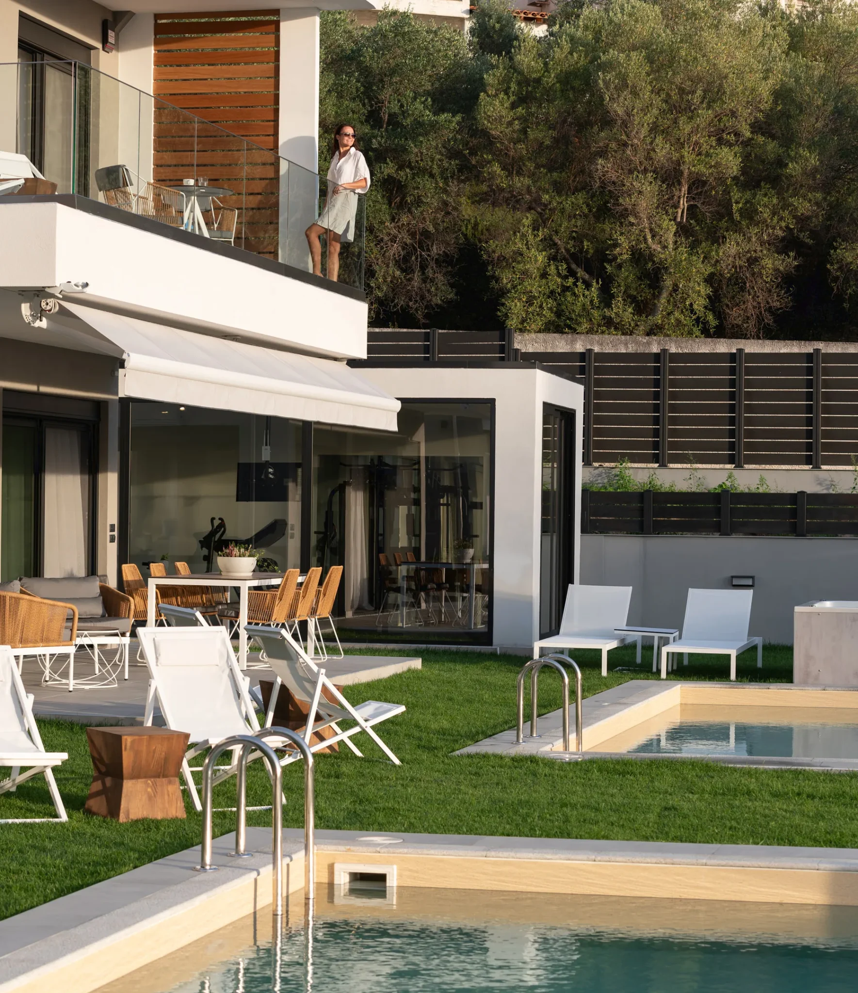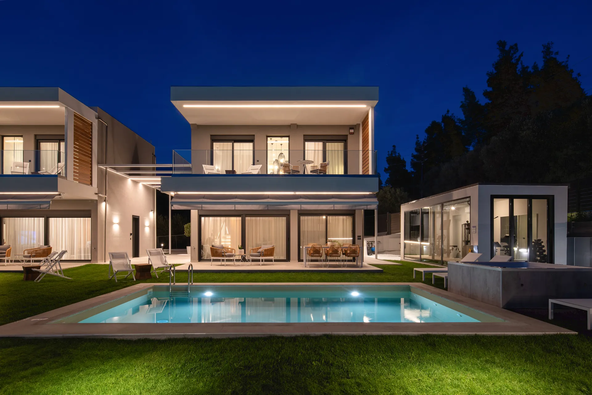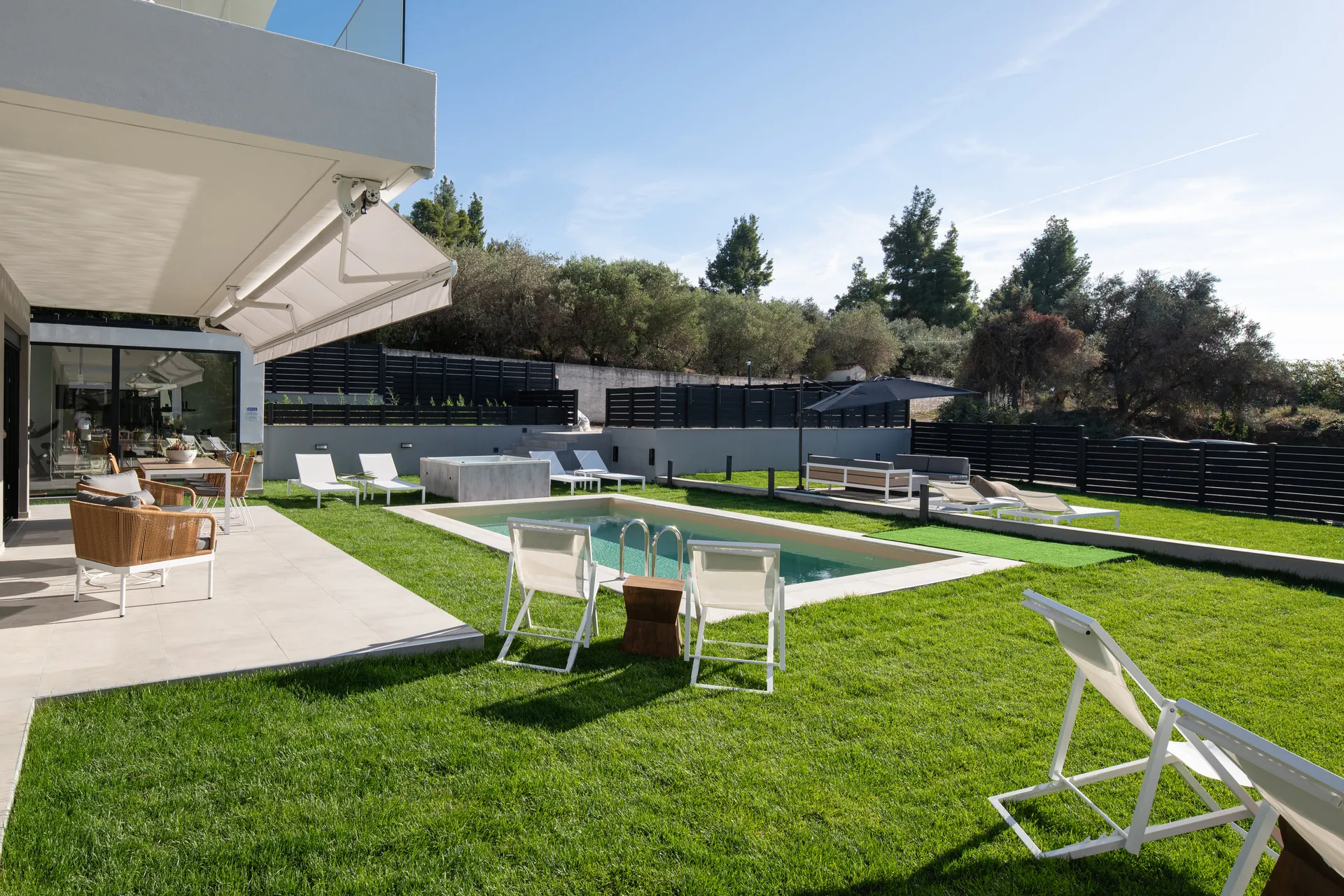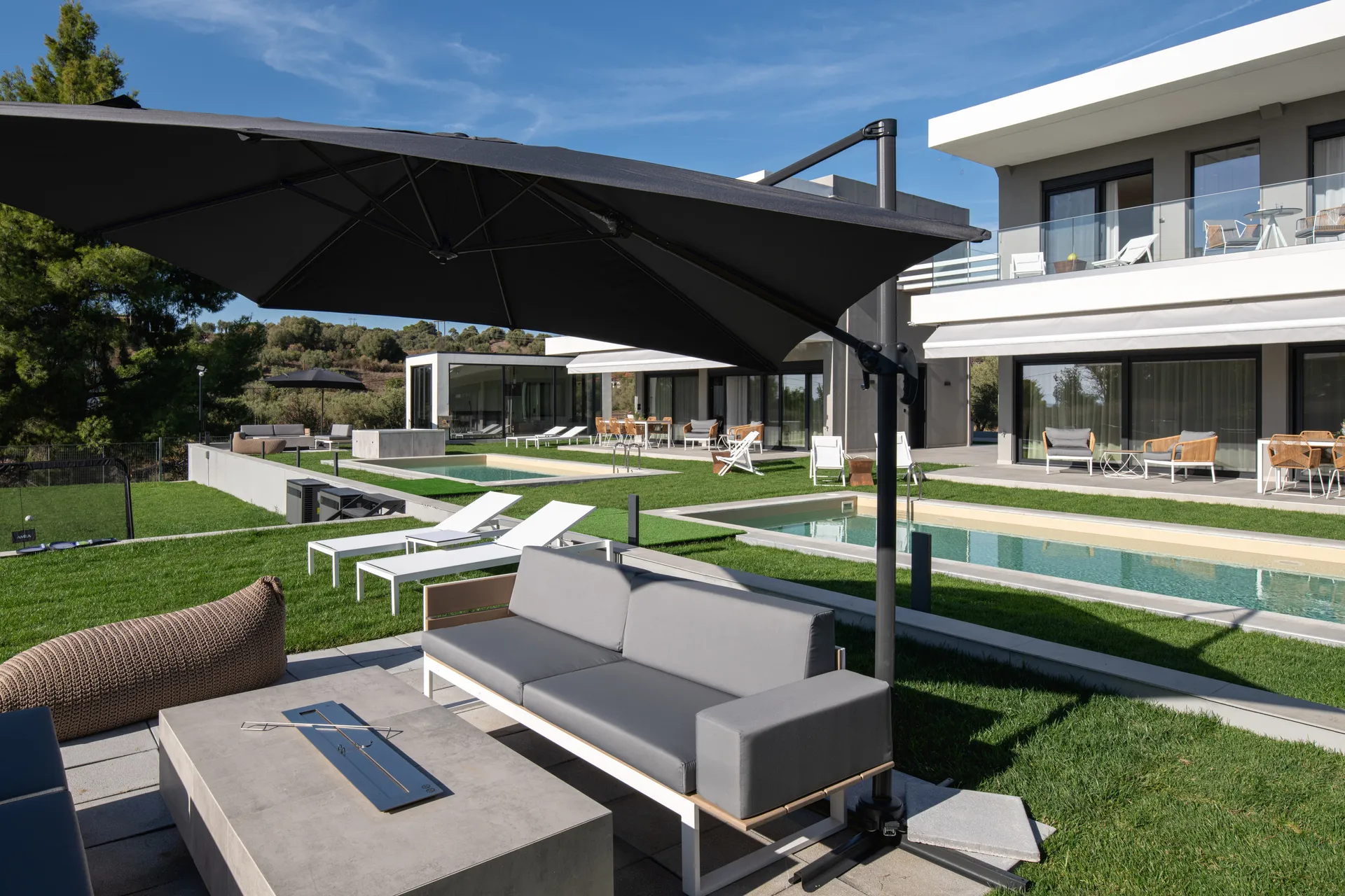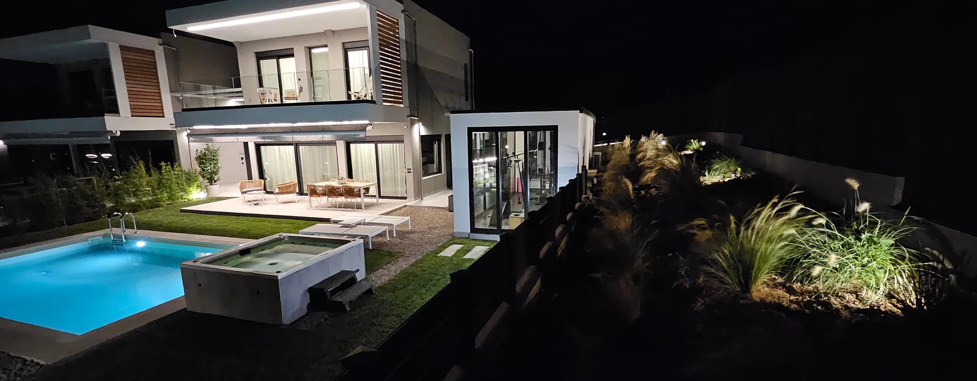 Besplatan bežični internet, privatni bazen sa umerenom temperaturom 28 m², UV, ležaljke, đakuzi za 5 osoba, privatna teretana 21 m² sa opremom za snagu i aerobik i TV sa ravnim ekranom, tuš, privatna bašta do 700 m² sa cvećem i travnjakom, dnevna soba sa baštenskim kaminom na bioetanol, besplatno mesto sa travnjakom za fudbal sa golom.
