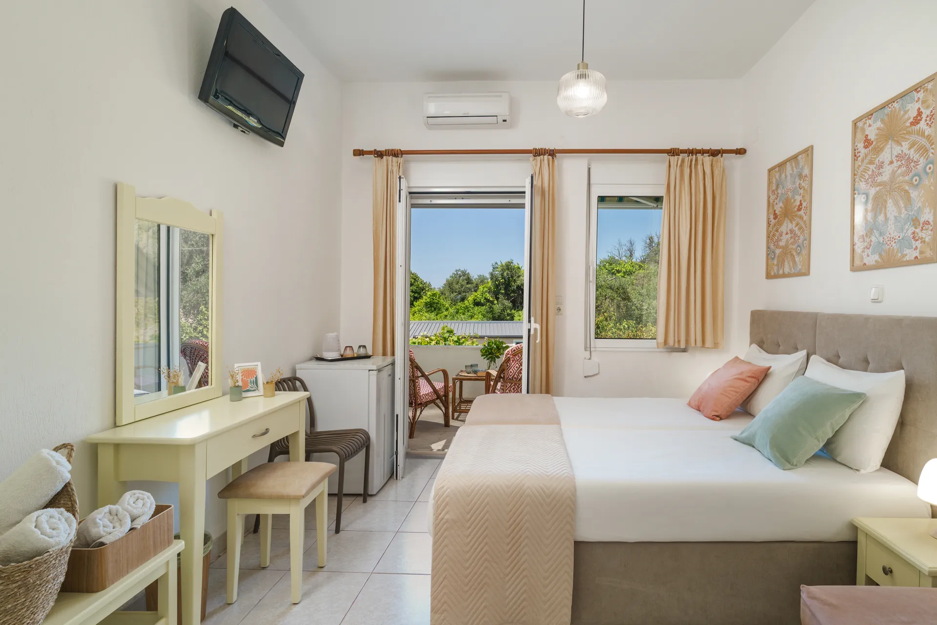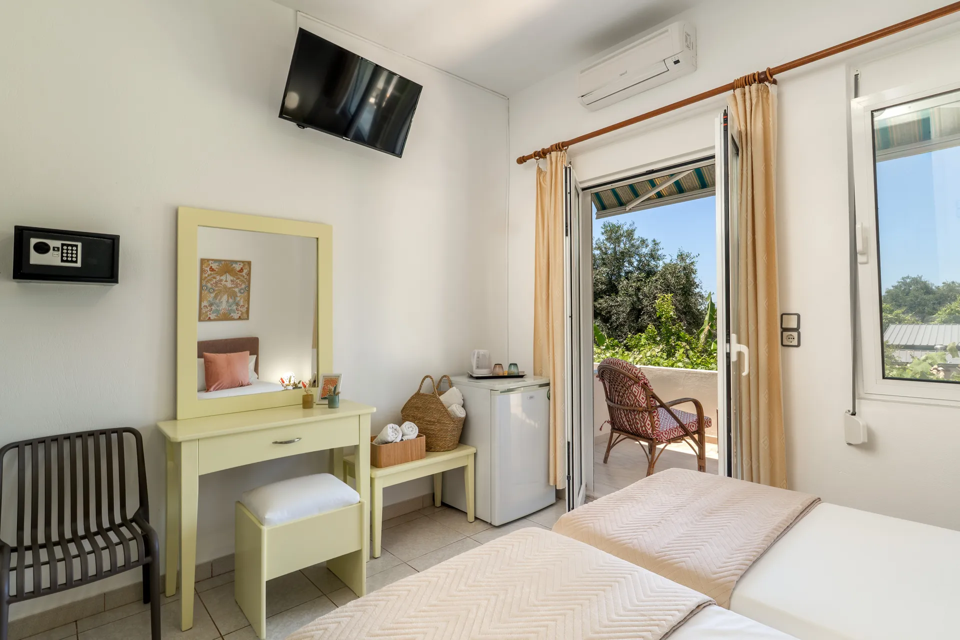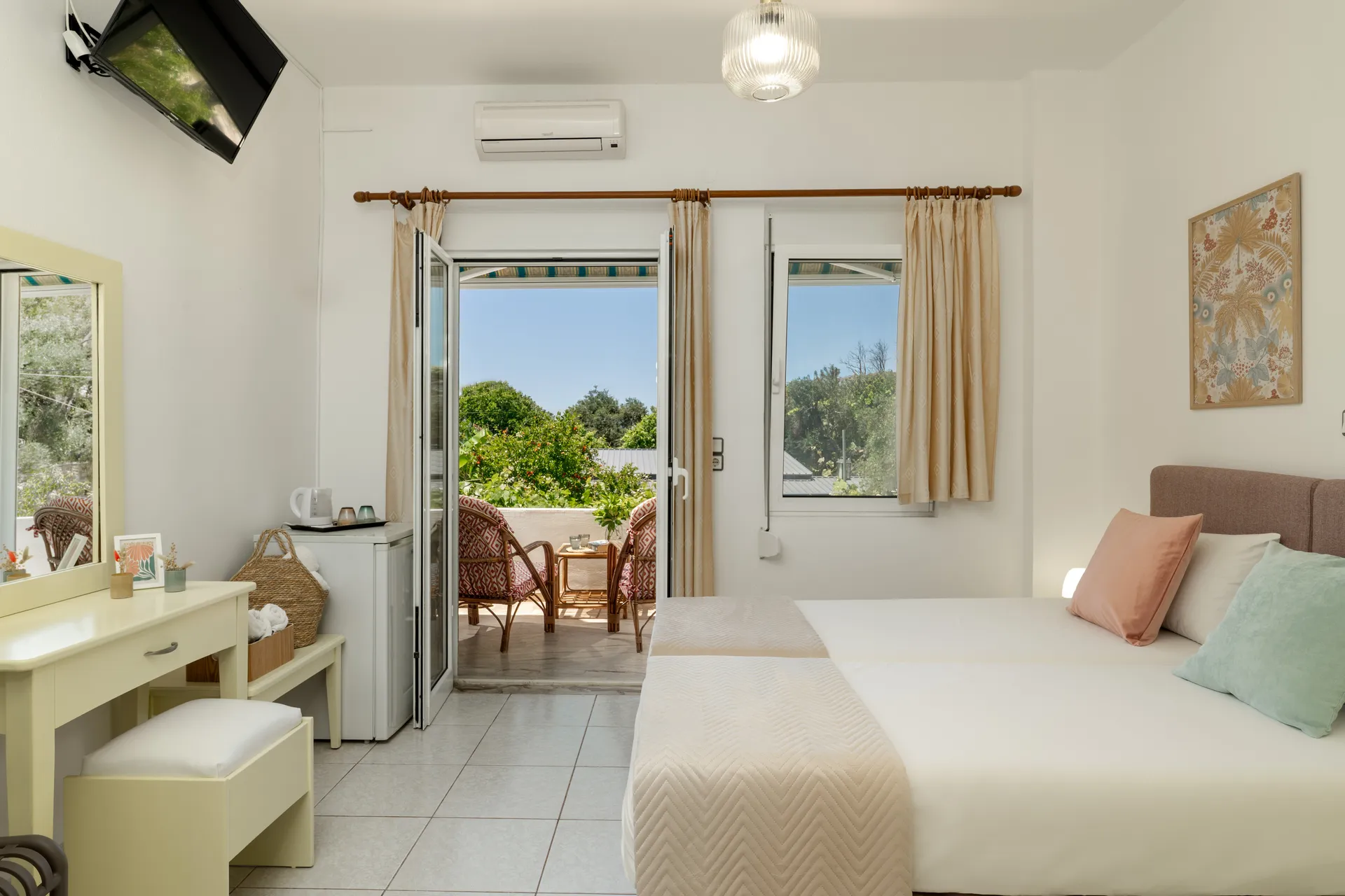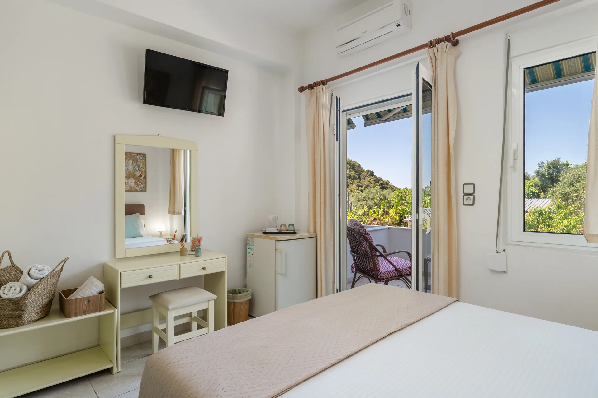 Svaka soba ima privatni balkon, TV ravnog ekrana, besplatan Wi-Fi i mini frižider. Neke sobe nude pogled na more ili baštu. Svakodnevno čišćenje je obezbeđeno kako bi se osigurao prijatan boravak.