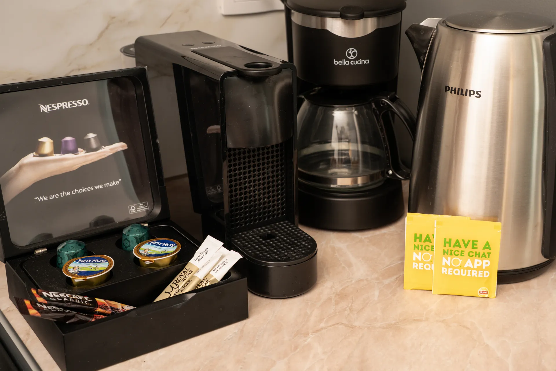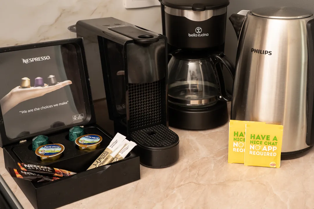 Otvoreni dnevni boravak prirodno se uliva u dobro opremljenu kuhinju – sa aparatom za Nespreso, aparatom za kafu i kuvalom za spore jutarnje uspone – i udobnu sofu koja vas poziva da se opustite nakon dana istraživanja.