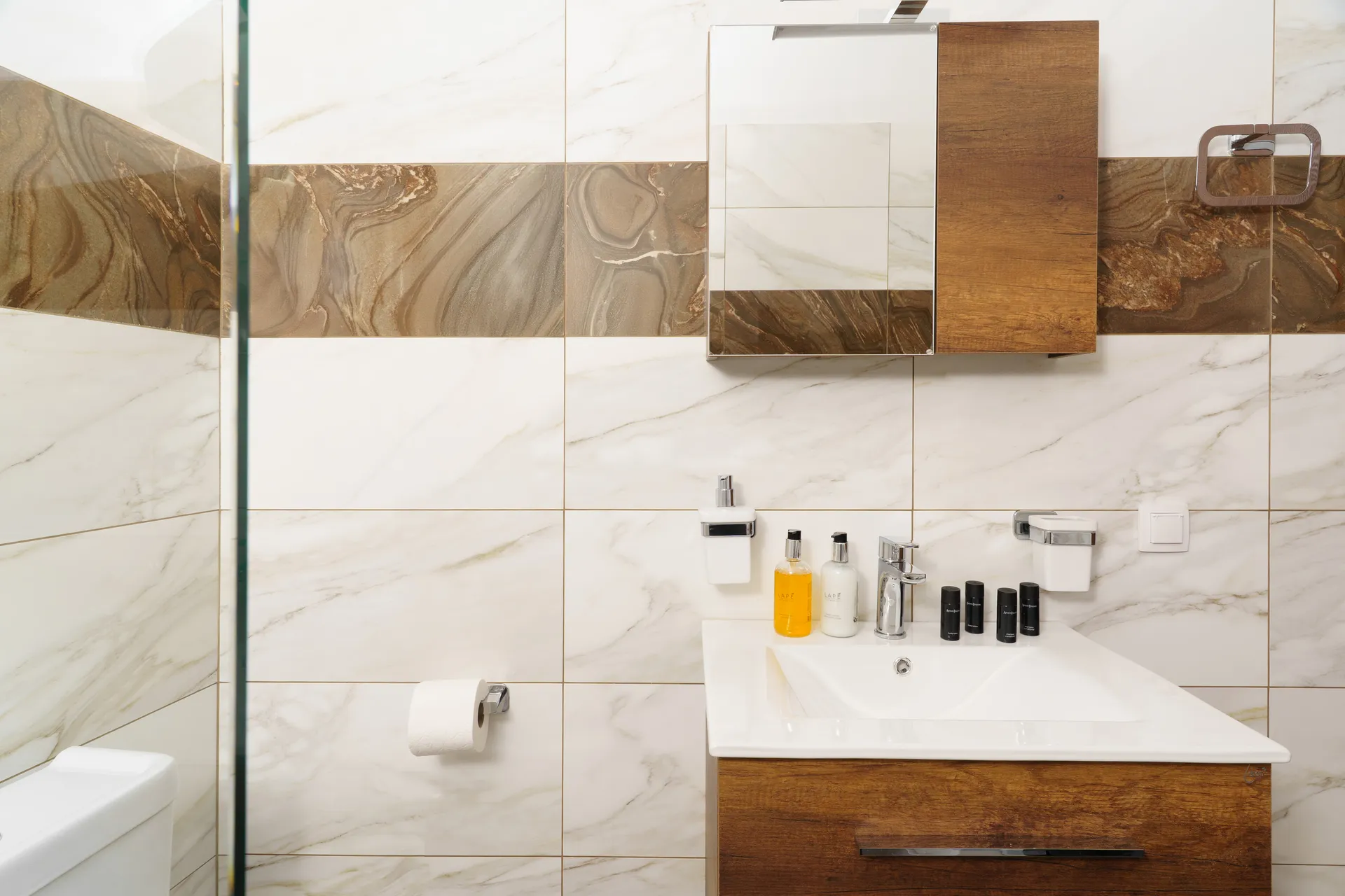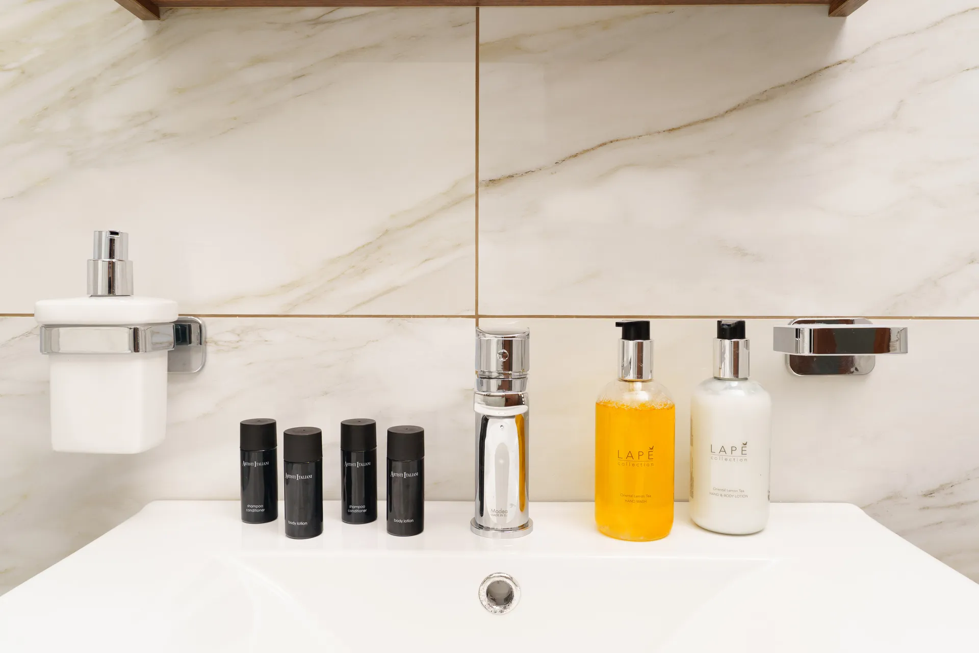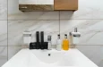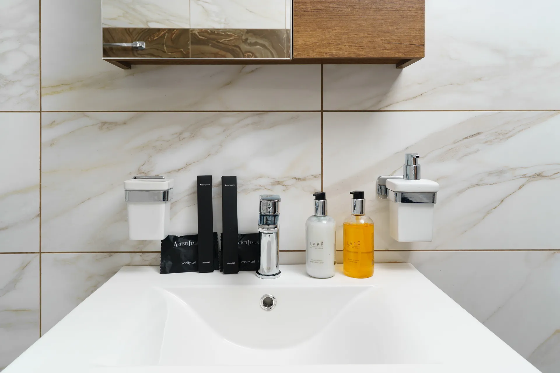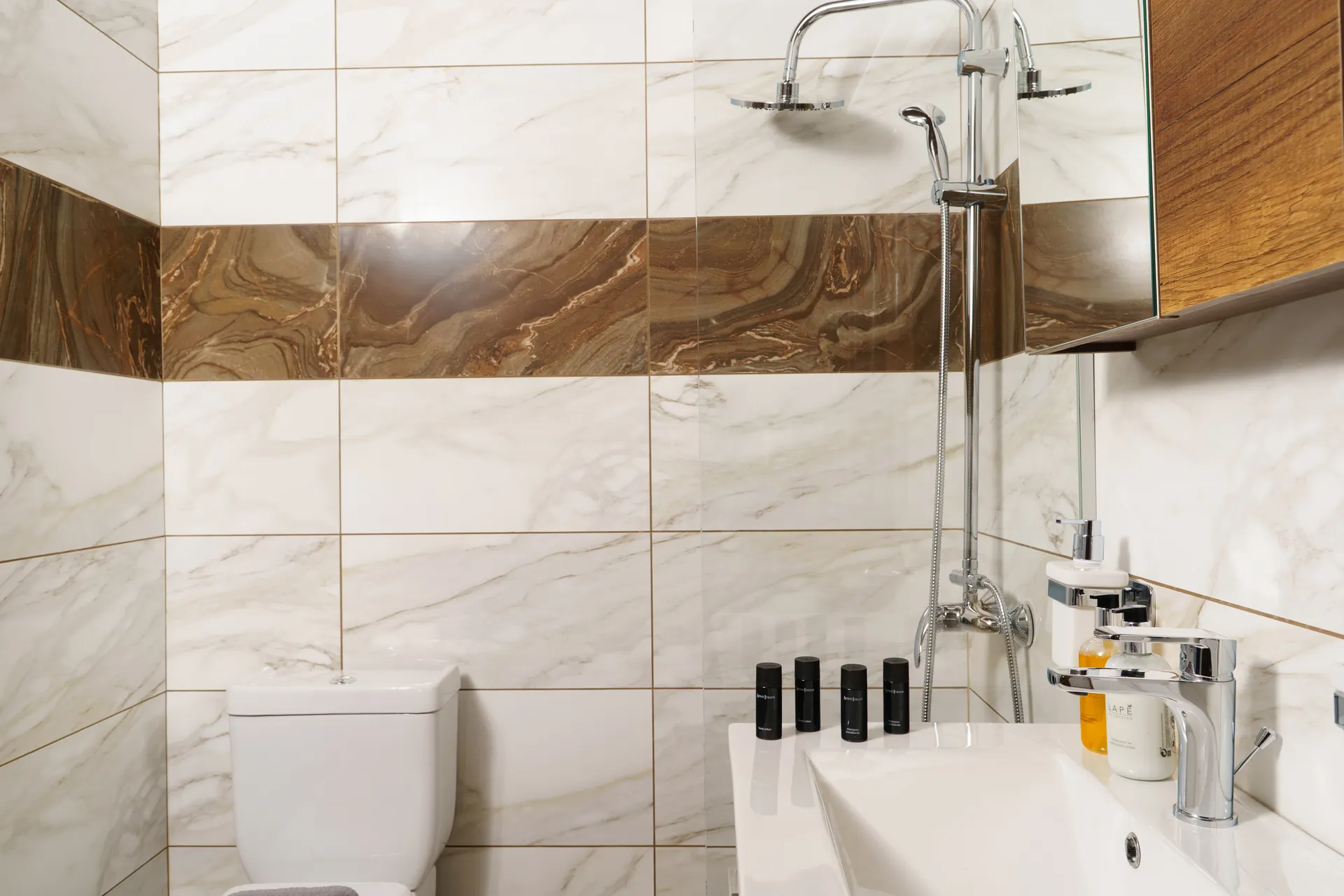 Studio ima kupatilo sa elegantnim pločicama sa efektom mermera, tušem sa efektom kiše i izborom besplatnih toaletnih potrepština, što obezbeđuje opuštenu i bezbrižnu rutinu za sve goste.