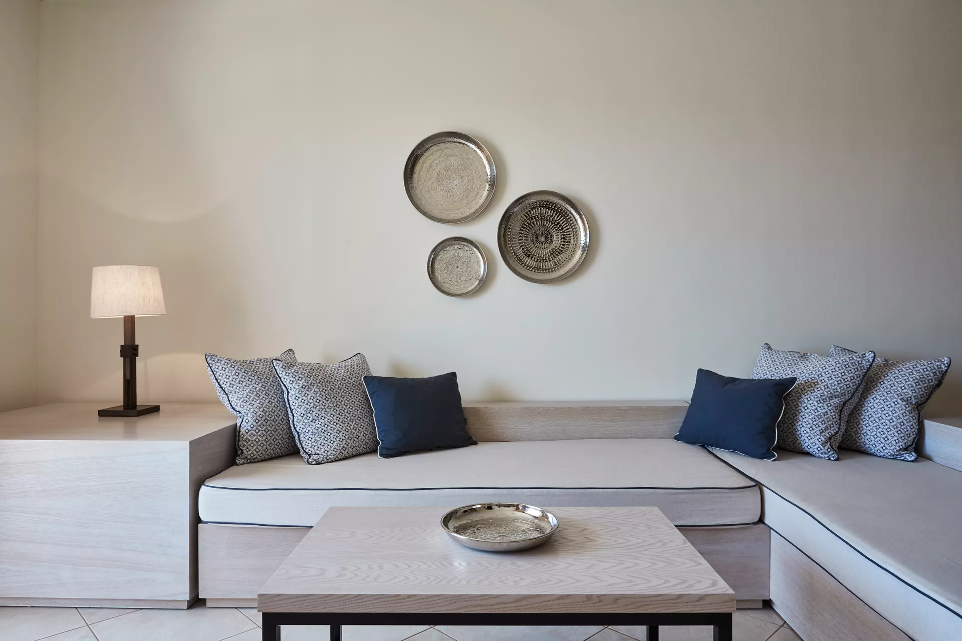 Three Bedroom Skiathos Living Sea View Ovaj mezonet se sastoji od dve spavaće sobe sa bračnim krevetom i privatnim balkonom ili prozorom sa pogledom na more i jedne spavaće sobe sa dva odvojena kreveta. Ova soba takođe ima dva kupatila sa tušem, kuhinju i prostor za sedenje sa sofom.