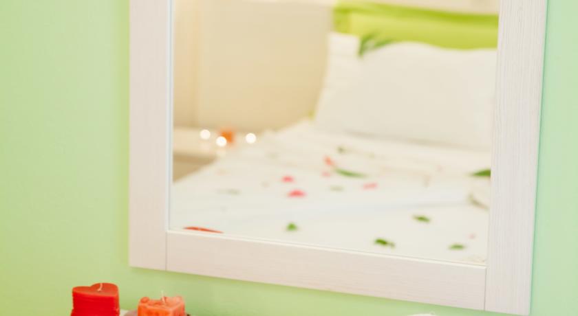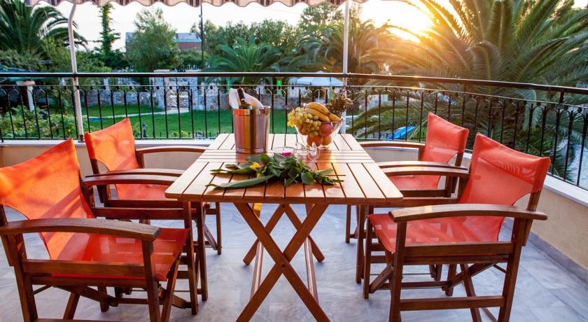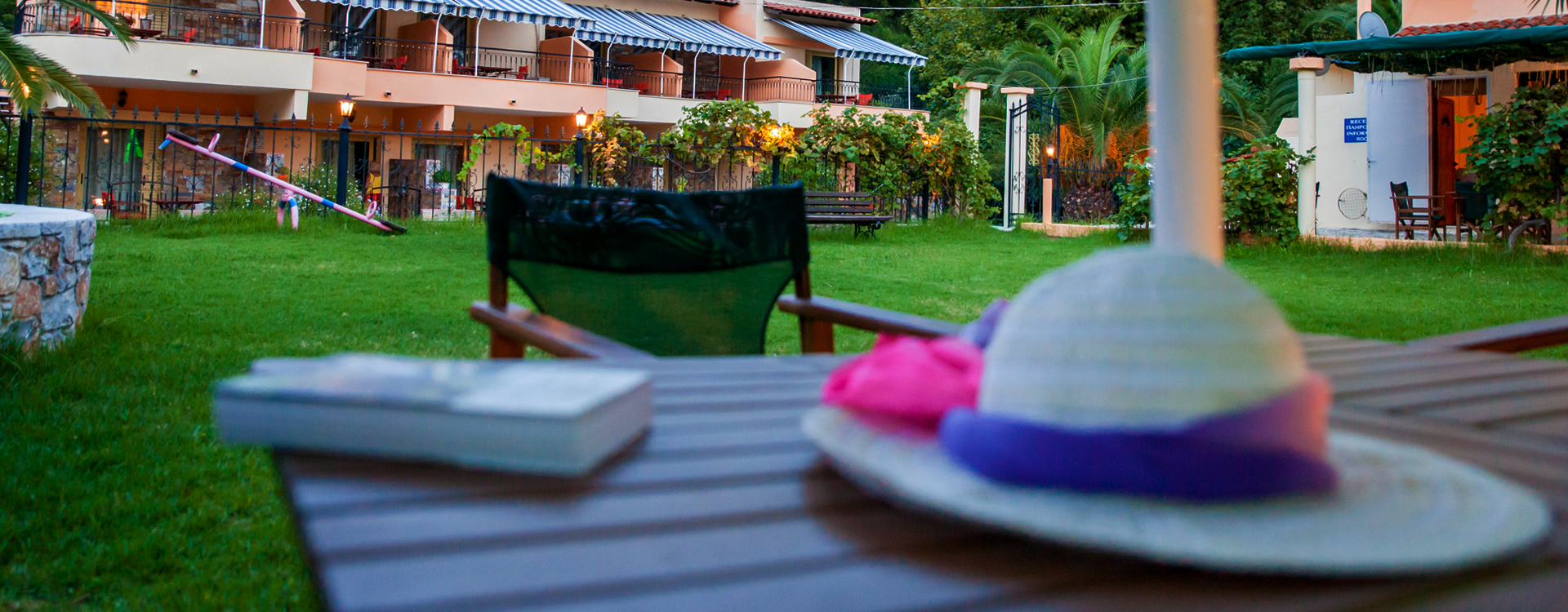 Svaki studio-apartman ima dva ulaza, napred i nazad, sa velikom natkrivenom verandom-balkonom, opremljenom udobnim setom nameštaja za verandu. Svi apartmani pružaju magičan panoramski pogled: sa prednje strane na cveće i palme u šarenoj bašti, sa zadnje strane na zelenu šumu visokih borova u planini.