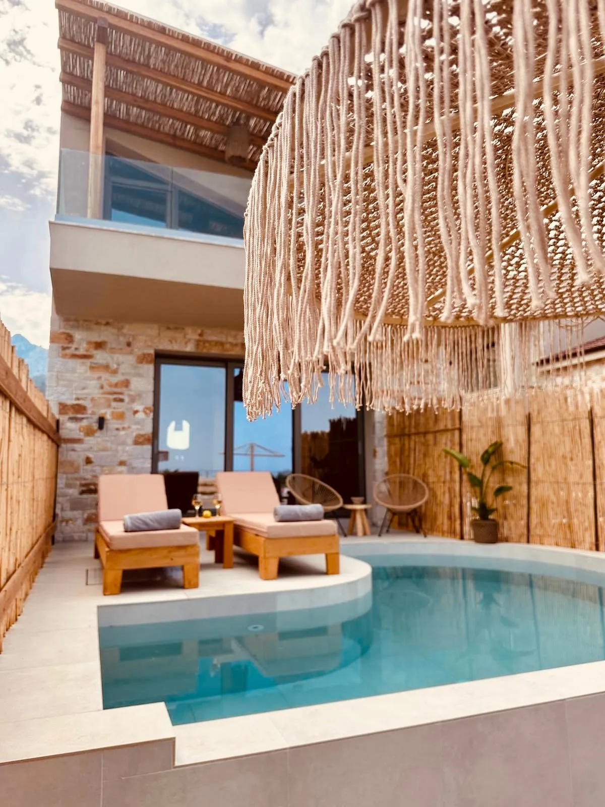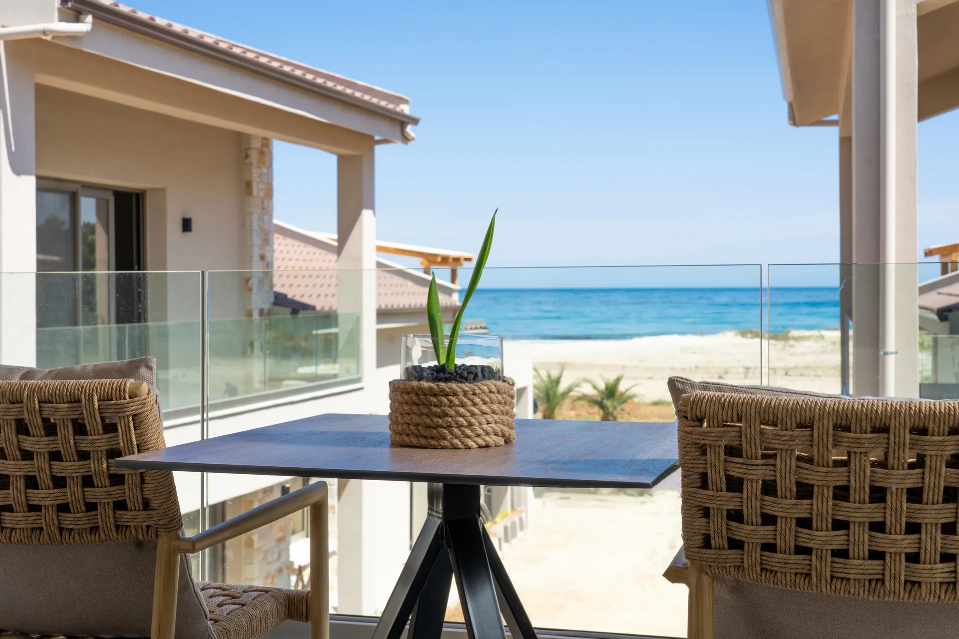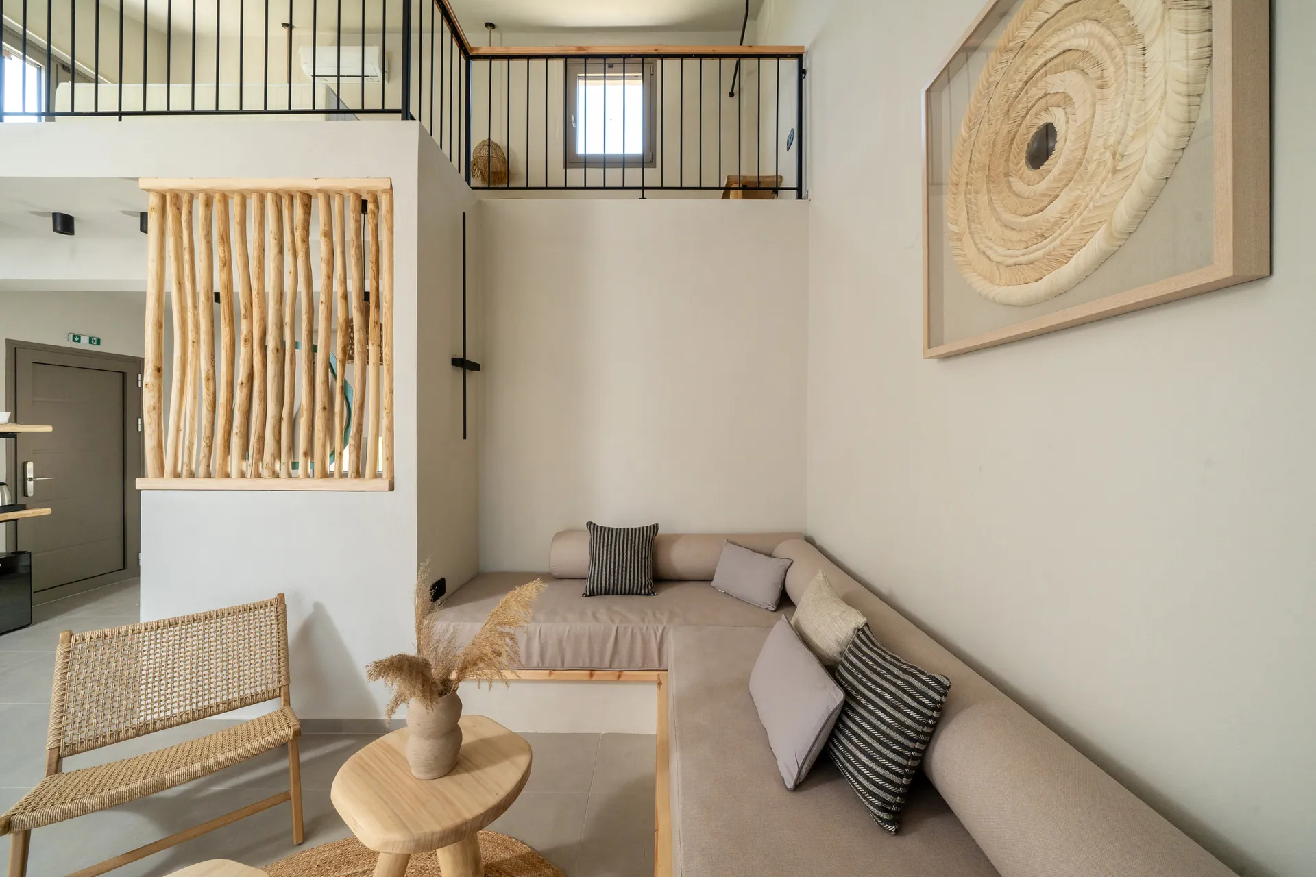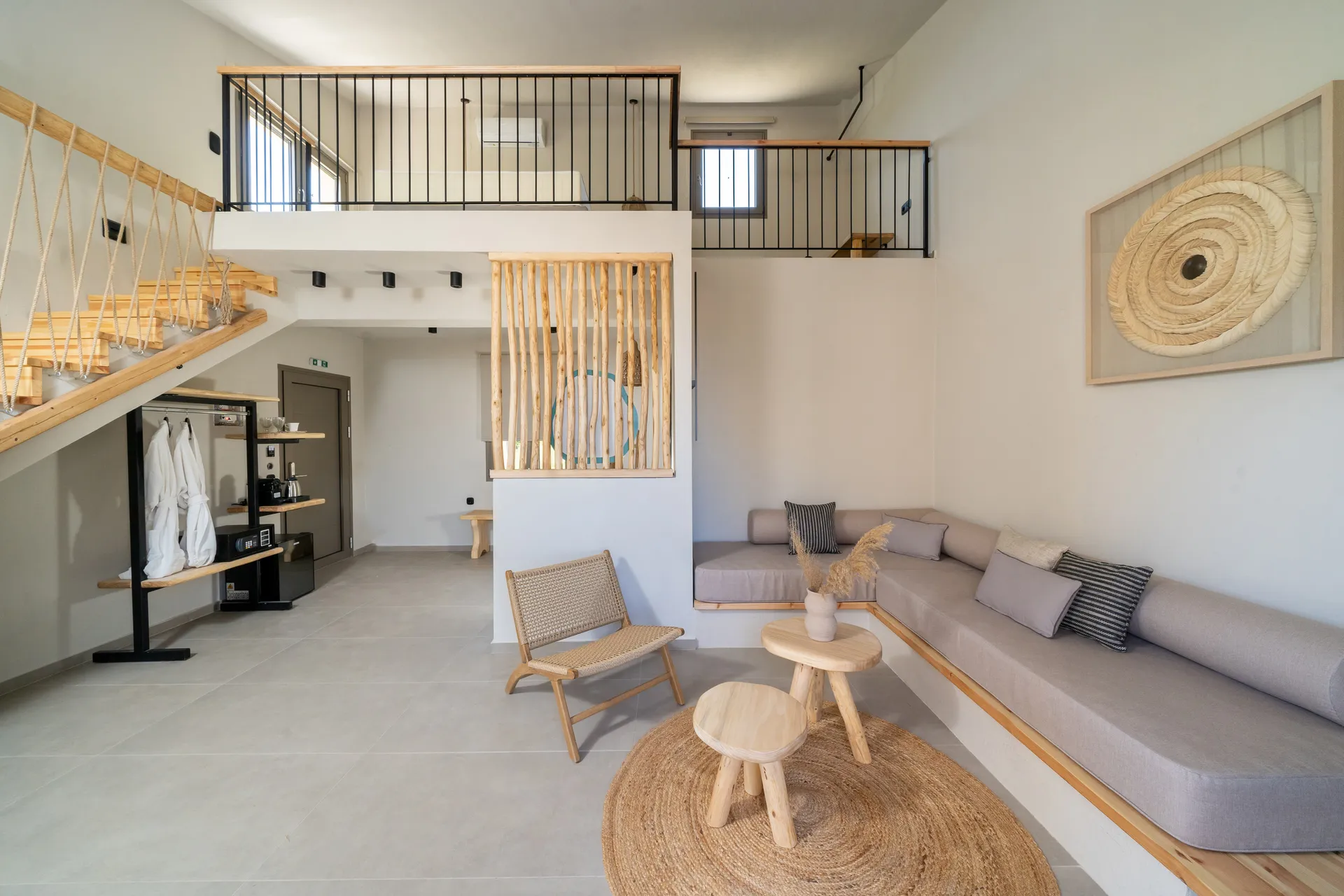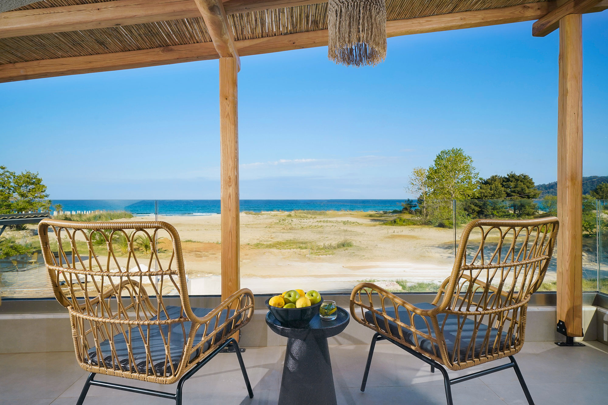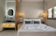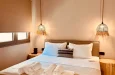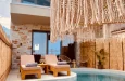 Naši elegantni dvospratni apartmani, površine 44 m2, nalaze se u prvom planu odmarališta, odmah iza centralnog bazena. Ovi dvospratni apartmani pružaju gostima najlepši pogled na Egejsko more, kombinujući jedinstvene smaragdne nijanse vode sa zemljanom atmosferom i boho-minimalističkom estetikom. Svaki apartman je obložen prirodnim materijalima kao što su kamen, drvo, bambus, ima dve spavaće sobe sa bračnim krevetima na različitim nivoima i dnevnu sobu. Takođe, prostrani balkon na gornjem spratu omogućava gostima da se opuste i uživaju u kombinaciji zadivljujućeg pogleda na duboko plavo more i zlatnu plažu, morskog povetarca, nezaboravnog pejzaža i očaravajućeg izlaska sunca. Apartman u prizemlju ima privatni otvoreni bazen koji će vas ogrnuti osvežavajućom vodom i neprekidnim pogledom na plavo Egejsko more.