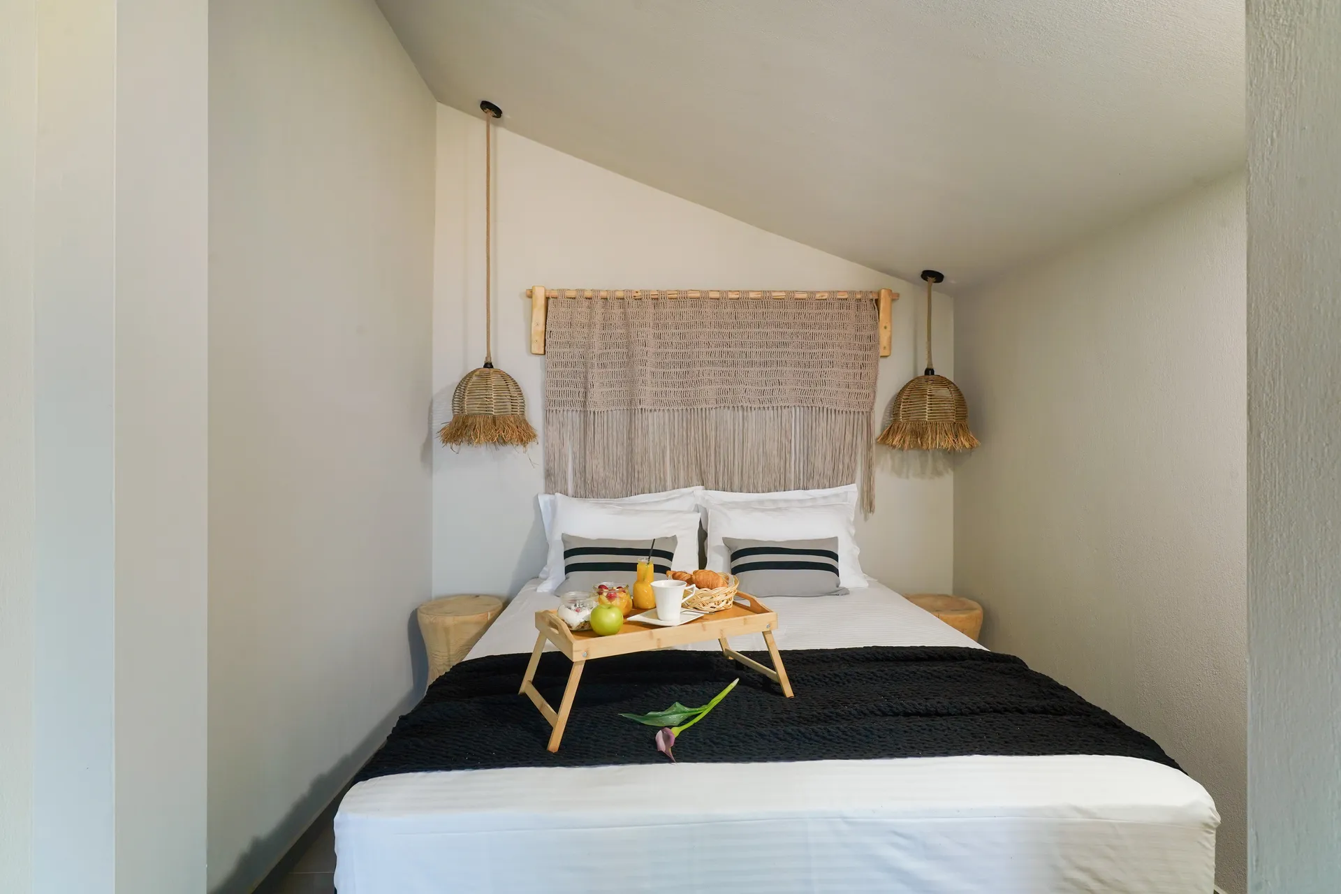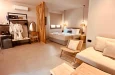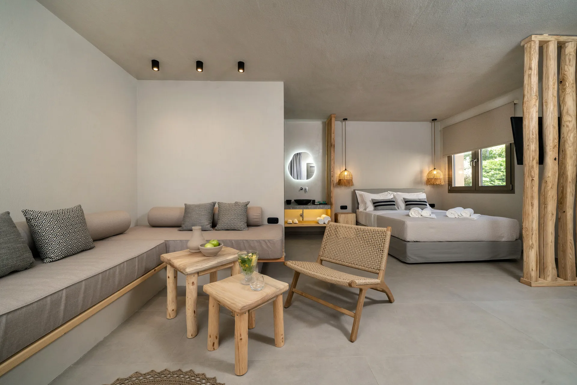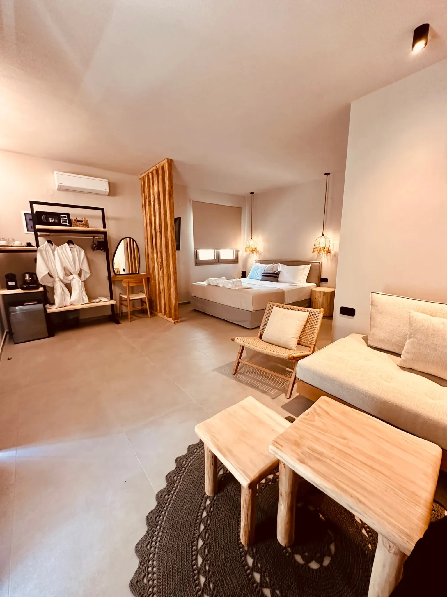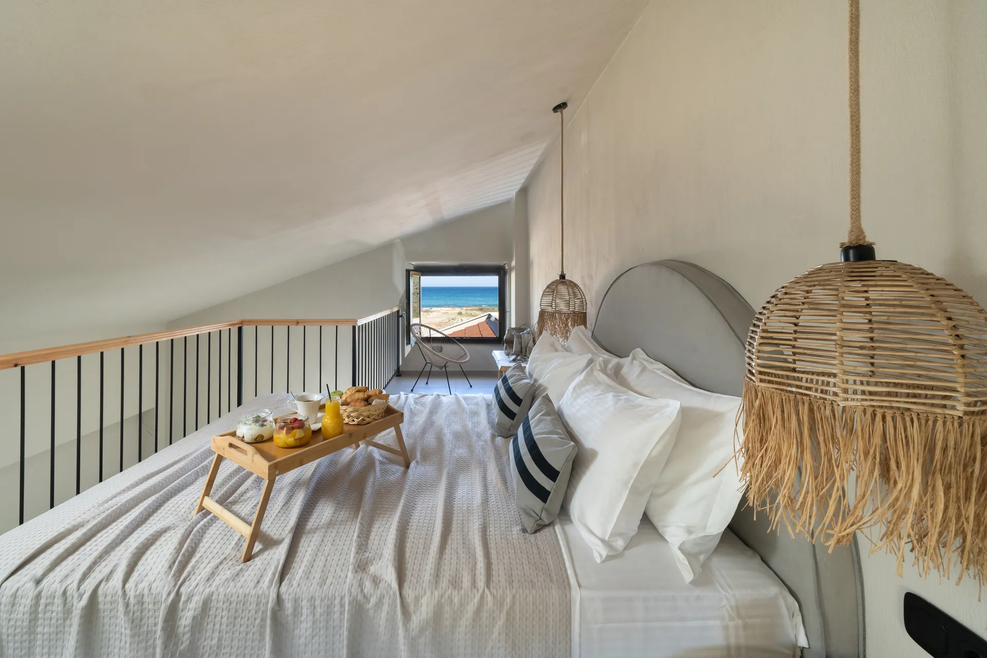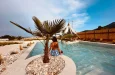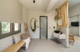 Naši elegantni dvospratni apartmani, površine 44 m2, nalaze se u prvom planu odmarališta, odmah iza centralnog bazena. Ovi dvospratni apartmani pružaju gostima najlepši pogled na Egejsko more, kombinujući jedinstvene smaragdne nijanse vode sa zemljanom atmosferom i boho-minimalističkom estetikom. Svaki apartman je obložen prirodnim materijalima kao što su kamen, drvo, bambus, ima dve spavaće sobe sa bračnim krevetima na različitim nivoima i dnevnu sobu. Takođe, prostrani balkon na gornjem spratu omogućava gostima da se opuste i uživaju u kombinaciji zadivljujućeg pogleda na duboko plavo more i zlatnu plažu, morskog povetarca, nezaboravnog pejzaža i očaravajućeg izlaska sunca. Apartman u prizemlju ima privatni otvoreni bazen koji će vas ogrnuti osvežavajućom vodom i neprekidnim pogledom na plavo Egejsko more.
