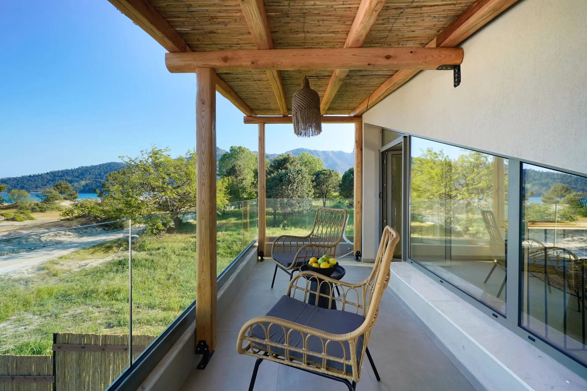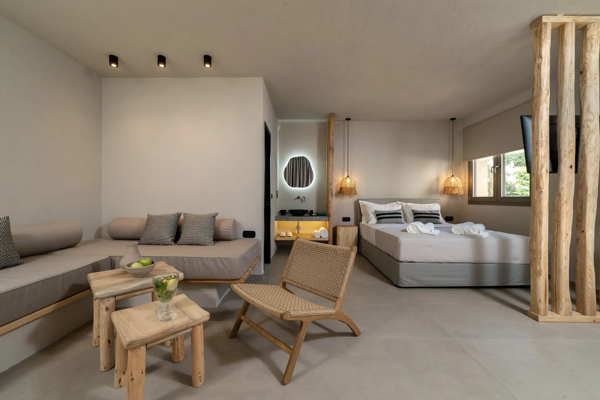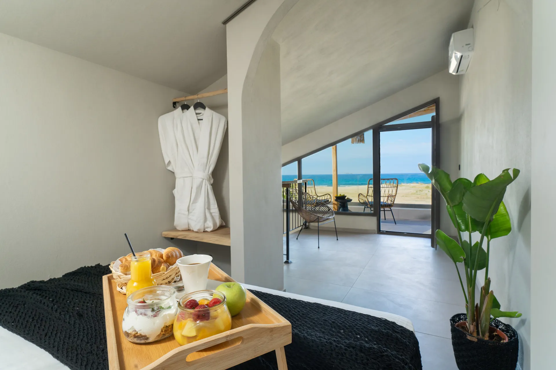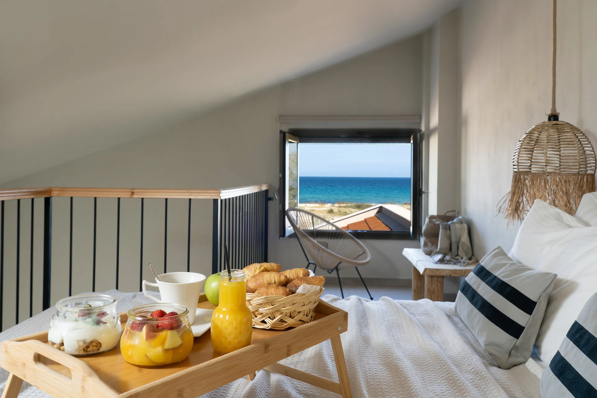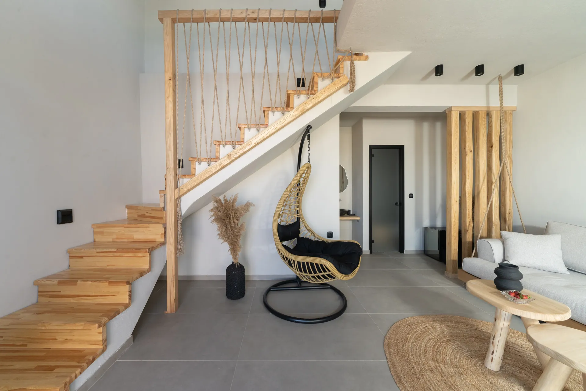 Naši elegantni dvospratni apartmani, površine 44 m2, nalaze se u prvom planu odmarališta, odmah iza centralnog bazena. Ovi dvospratni apartmani pružaju gostima najlepši pogled na Egejsko more, kombinujući jedinstvene smaragdne nijanse vode sa zemljanom atmosferom i boho-minimalističkom estetikom. Svaki apartman je obložen prirodnim materijalima kao što su kamen, drvo, bambus, ima dve spavaće sobe sa bračnim krevetima na različitim nivoima i dnevnu sobu. Takođe, prostrani balkon na gornjem spratu omogućava gostima da se opuste i uživaju u kombinaciji zadivljujućeg pogleda na duboko plavo more i zlatnu plažu, morskog povetarca, nezaboravnog pejzaža i očaravajućeg izlaska sunca. Apartman u prizemlju ima privatni otvoreni bazen koji će vas ogrnuti osvežavajućom vodom i neprekidnim pogledom na plavo Egejsko more.