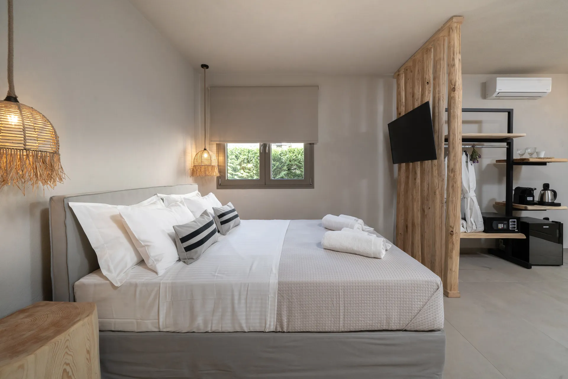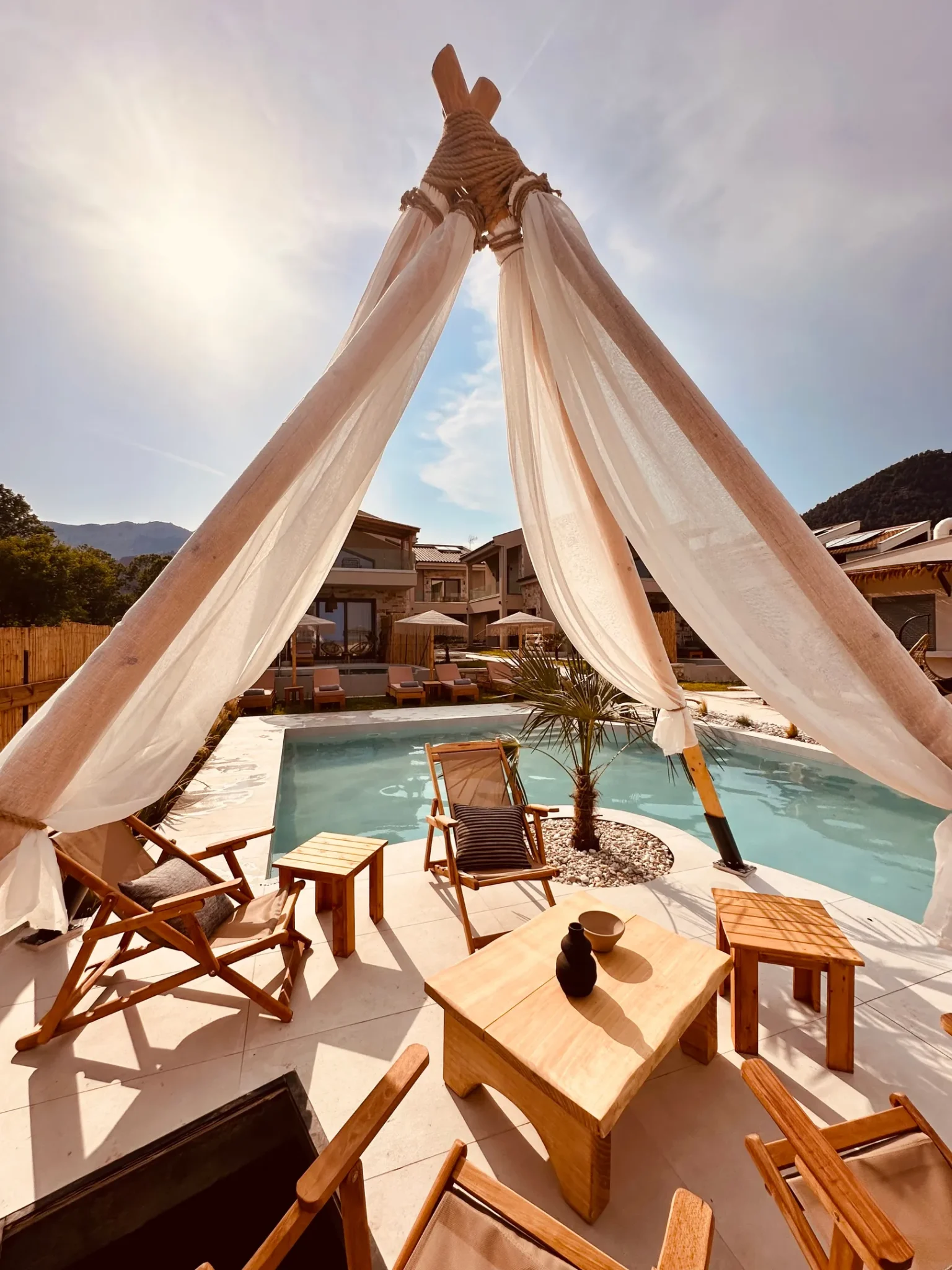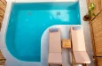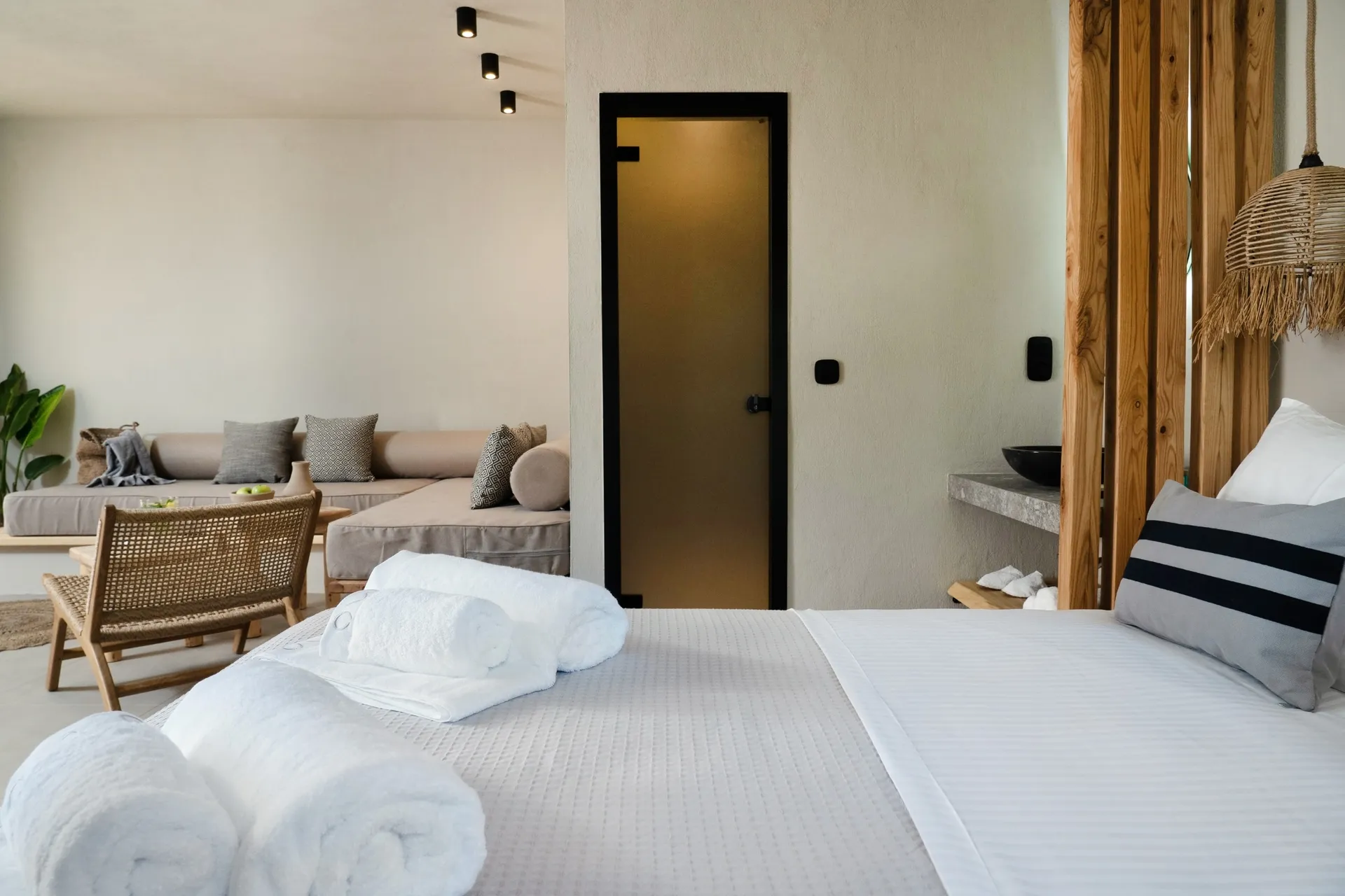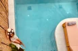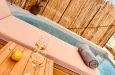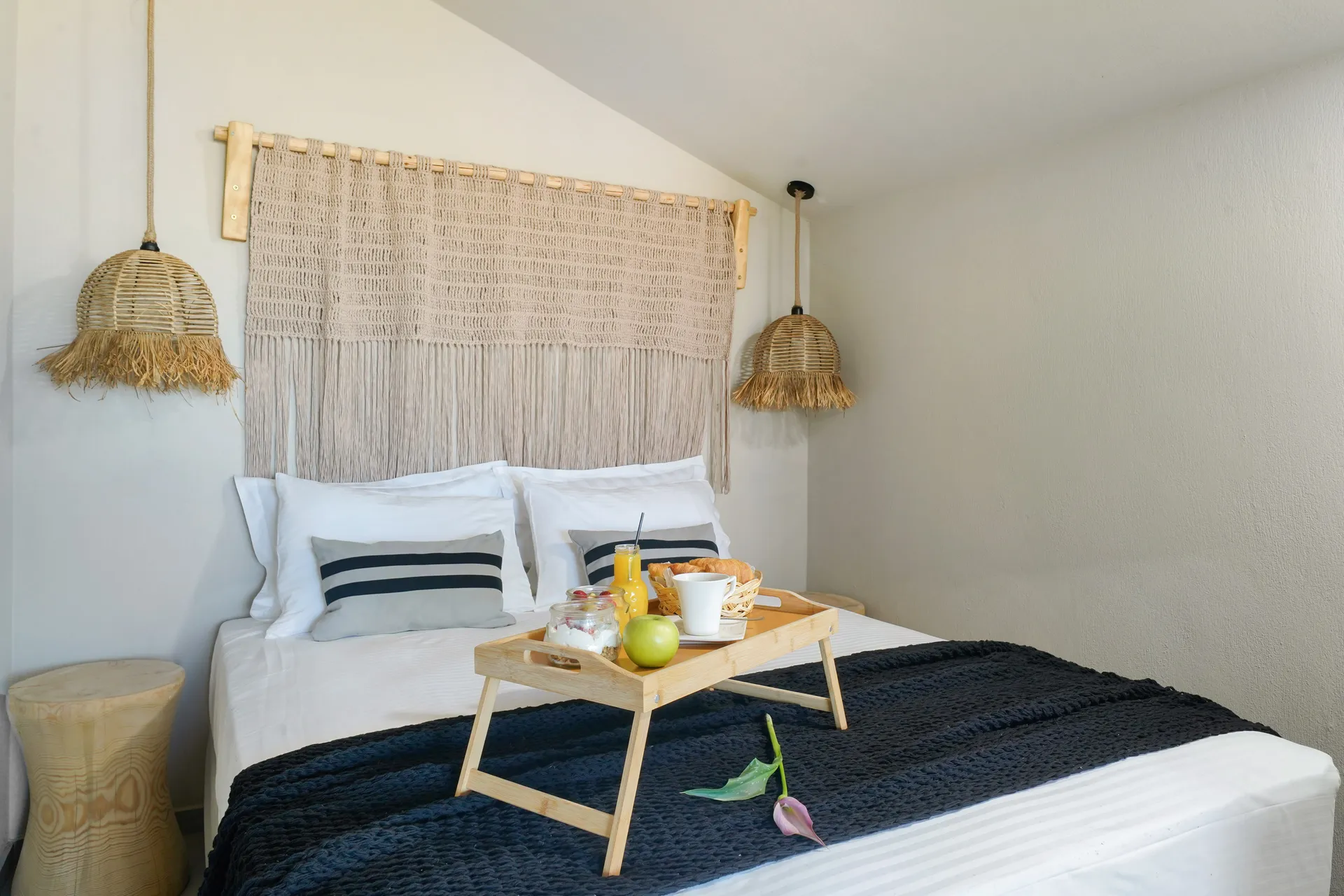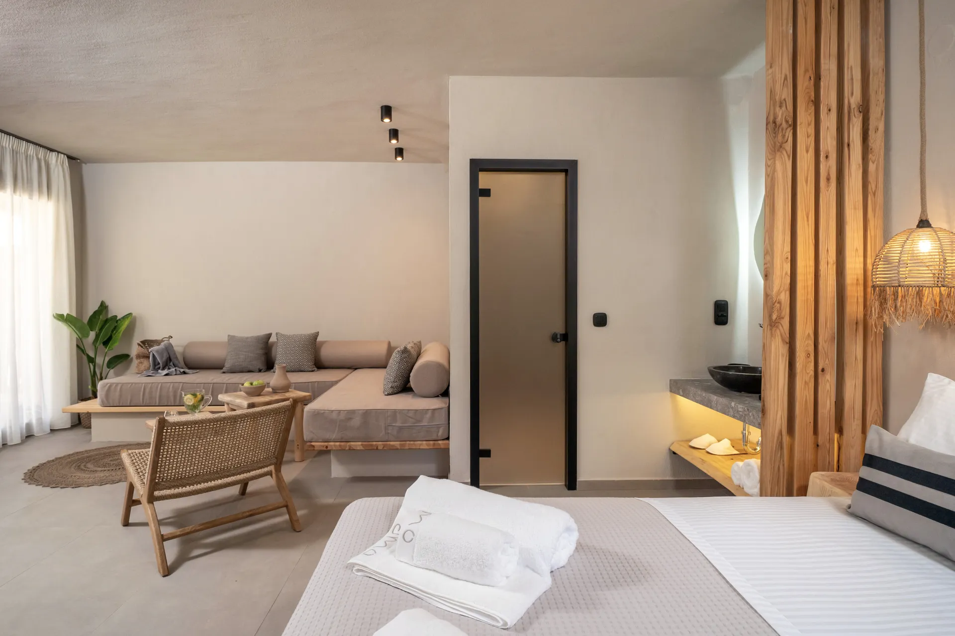 Naši elegantni dvospratni apartmani, površine 44 m2, nalaze se u prvom planu odmarališta, odmah iza centralnog bazena. Ovi dvospratni apartmani pružaju gostima najlepši pogled na Egejsko more, kombinujući jedinstvene smaragdne nijanse vode sa zemljanom atmosferom i boho-minimalističkom estetikom. Svaki apartman je obložen prirodnim materijalima kao što su kamen, drvo, bambus, ima dve spavaće sobe sa bračnim krevetima na različitim nivoima i dnevnu sobu. Takođe, prostrani balkon na gornjem spratu omogućava gostima da se opuste i uživaju u kombinaciji zadivljujućeg pogleda na duboko plavo more i zlatnu plažu, morskog povetarca, nezaboravnog pejzaža i očaravajućeg izlaska sunca. Apartman u prizemlju ima privatni otvoreni bazen koji će vas ogrnuti osvežavajućom vodom i neprekidnim pogledom na plavo Egejsko more.