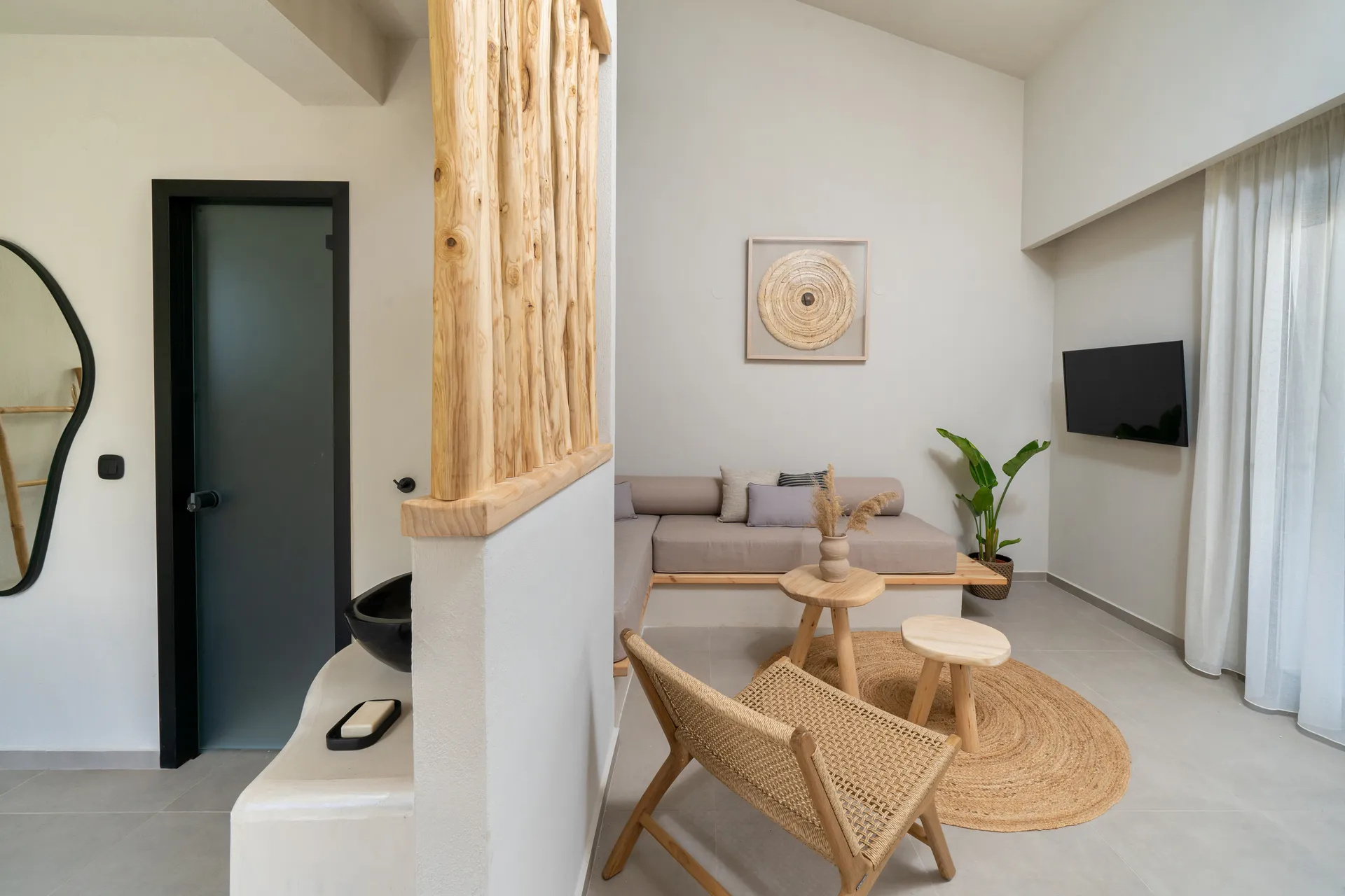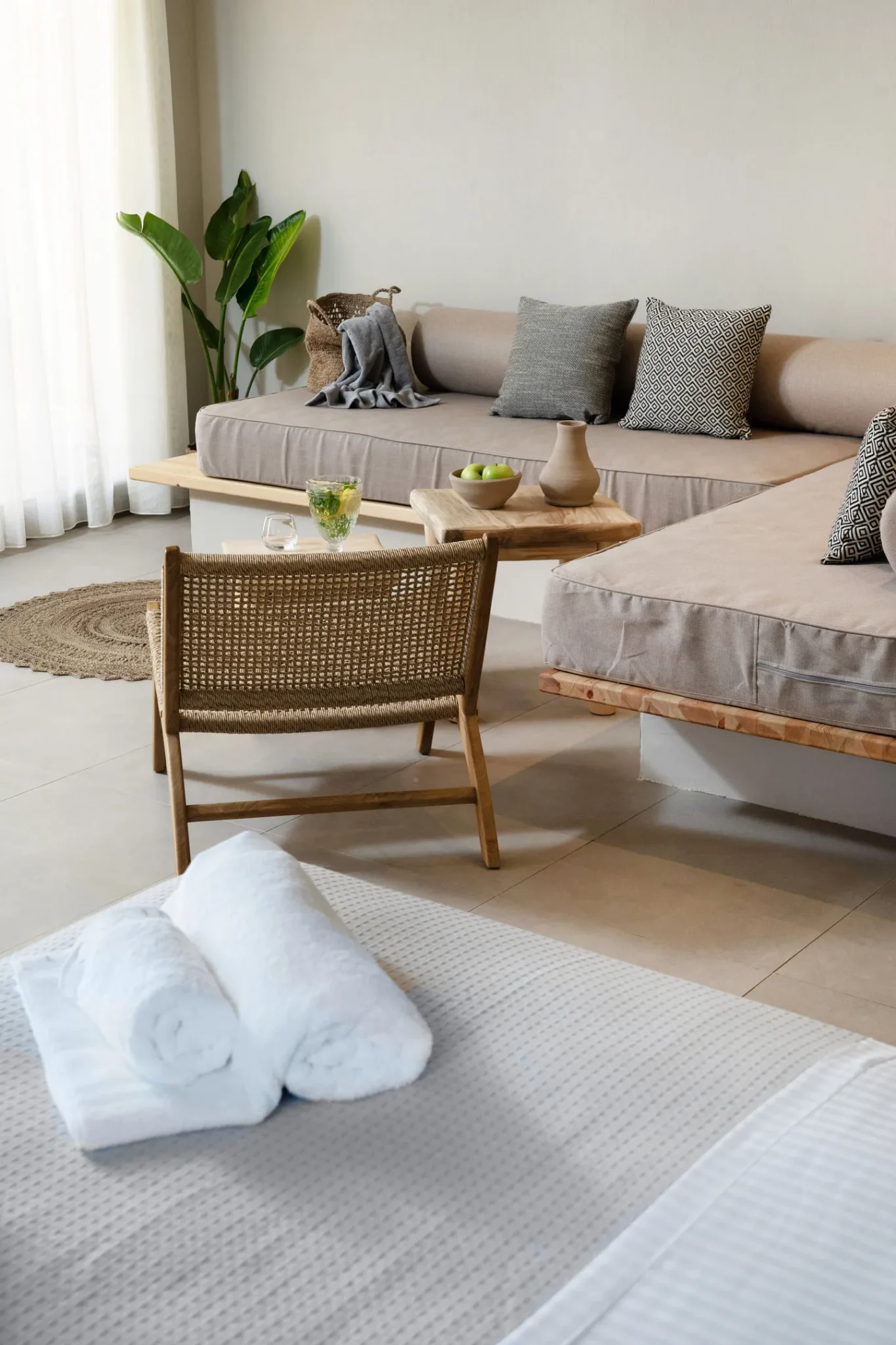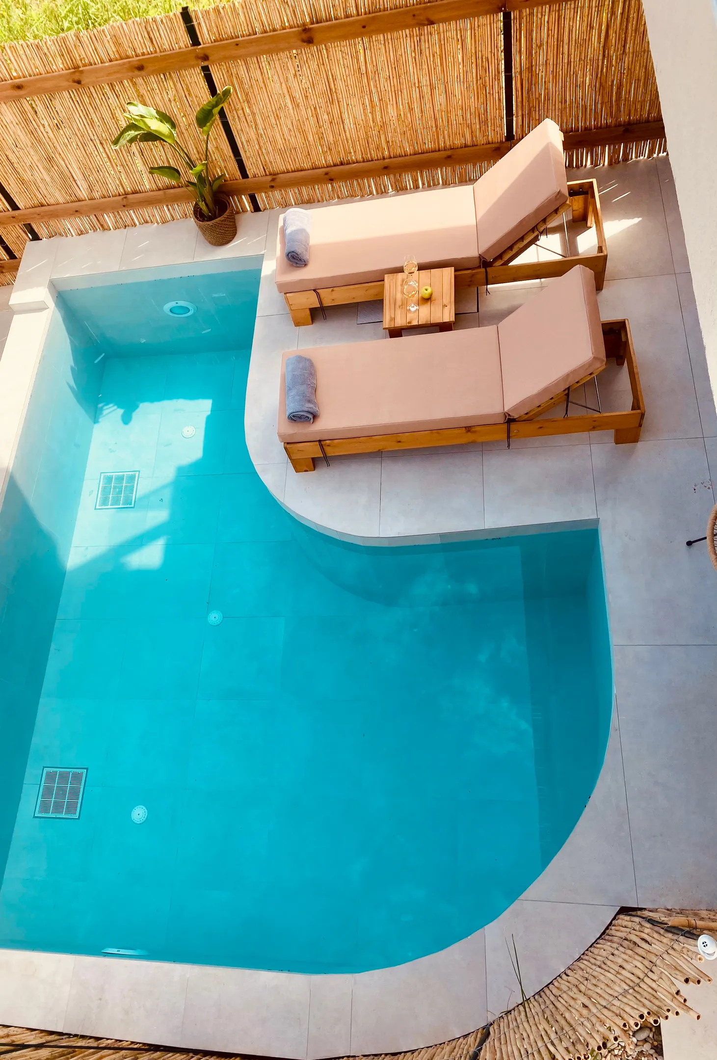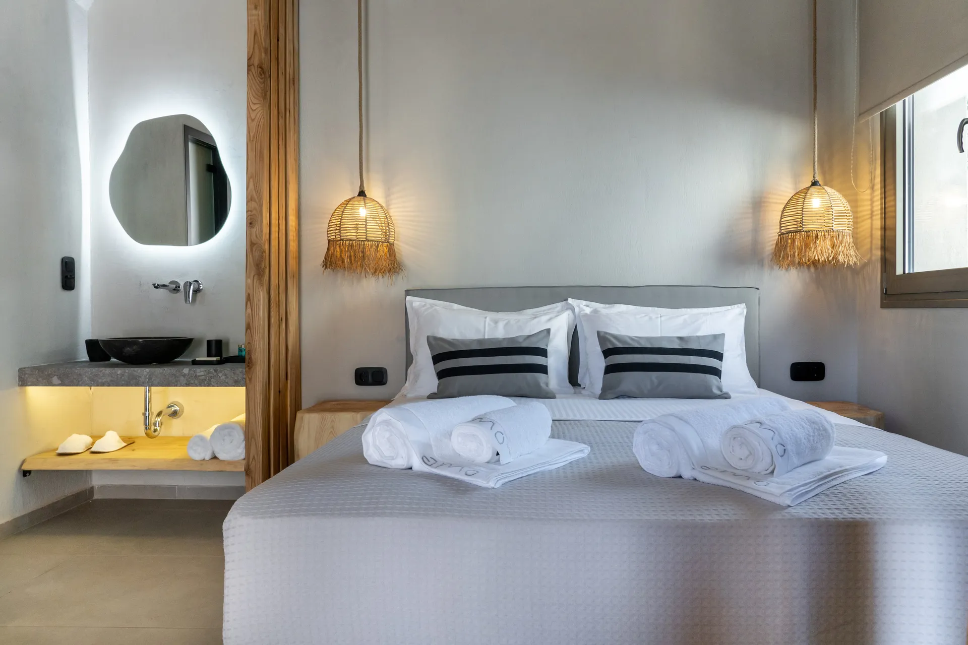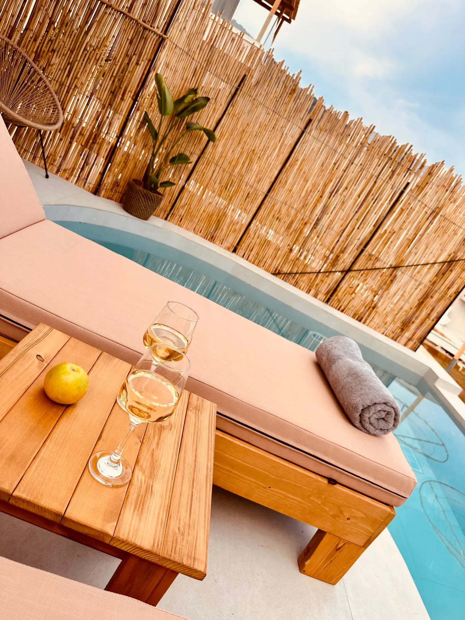 Naši elegantni dvospratni apartmani, površine 44 m2, nalaze se u prvom planu odmarališta, odmah iza centralnog bazena. Ovi dvospratni apartmani pružaju gostima najlepši pogled na Egejsko more, kombinujući jedinstvene smaragdne nijanse vode sa zemljanom atmosferom i boho-minimalističkom estetikom. Svaki apartman je obložen prirodnim materijalima kao što su kamen, drvo, bambus, ima dve spavaće sobe sa bračnim krevetima na različitim nivoima i dnevnu sobu. Takođe, prostrani balkon na gornjem spratu omogućava gostima da se opuste i uživaju u kombinaciji zadivljujućeg pogleda na duboko plavo more i zlatnu plažu, morskog povetarca, nezaboravnog pejzaža i očaravajućeg izlaska sunca. Apartman u prizemlju ima privatni otvoreni bazen koji će vas ogrnuti osvežavajućom vodom i neprekidnim pogledom na plavo Egejsko more.