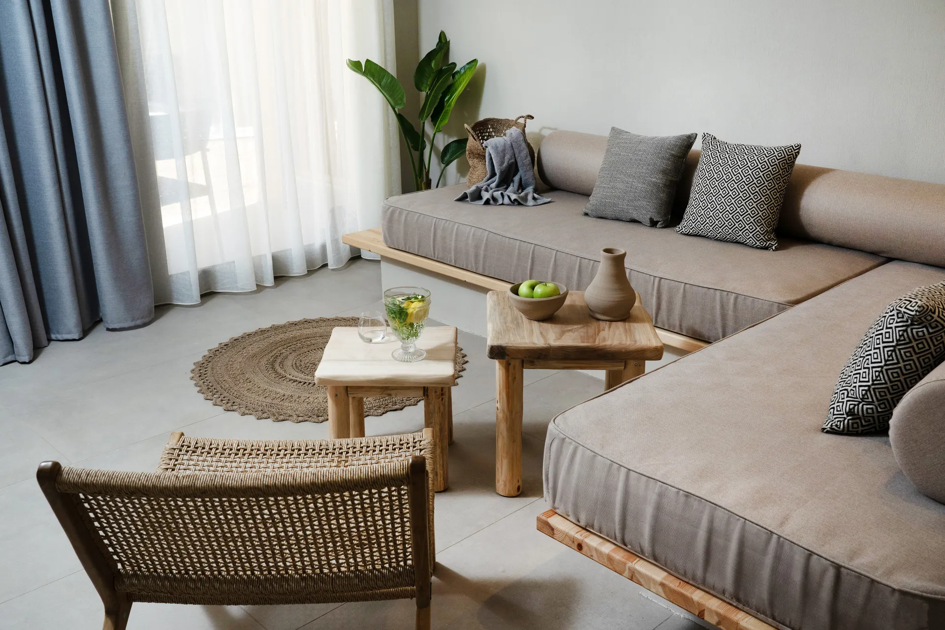 Ovi prijatni apartmani u prizemlju prve i druge zgrade, sa 32 m2 površine, pružaju opuštajući boravak sa pristupom bašti sa privatne terase, a blizina i pristup moru vam omogućavaju da uživate u morskom povetarcu i zapljuskivanju talasa o obalu. Svaki apartman, elegantno dekorisan mekim kombinacijama zemljanih boja, sadrži bračni krevet i sofu koja se rasklapa u dva odvojena kreveta, što omogućava smeštaj do 4 osobe za vaše opuštajuće i bezbrižne trenutke.