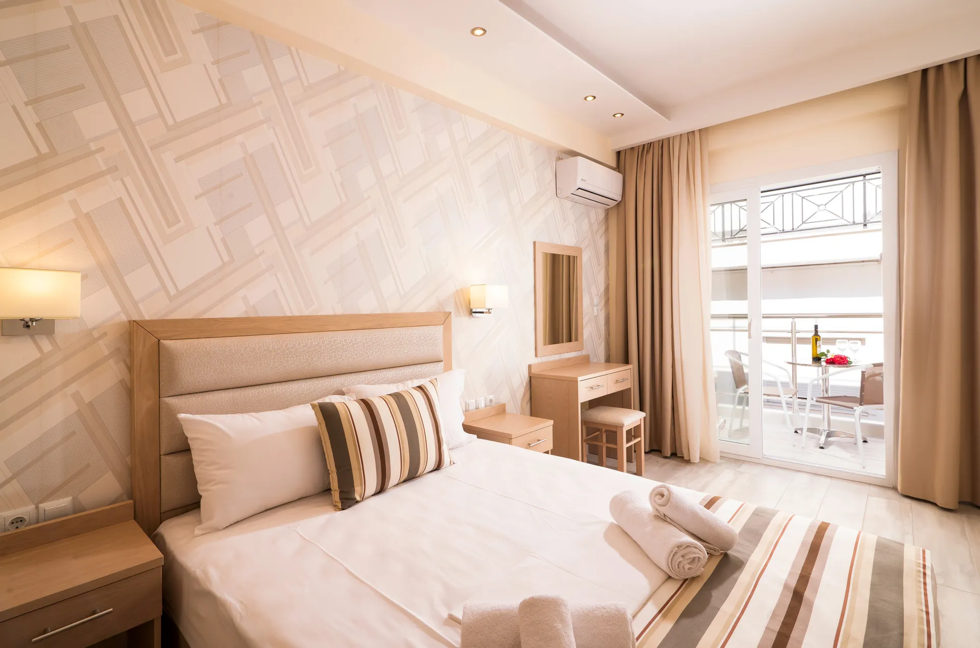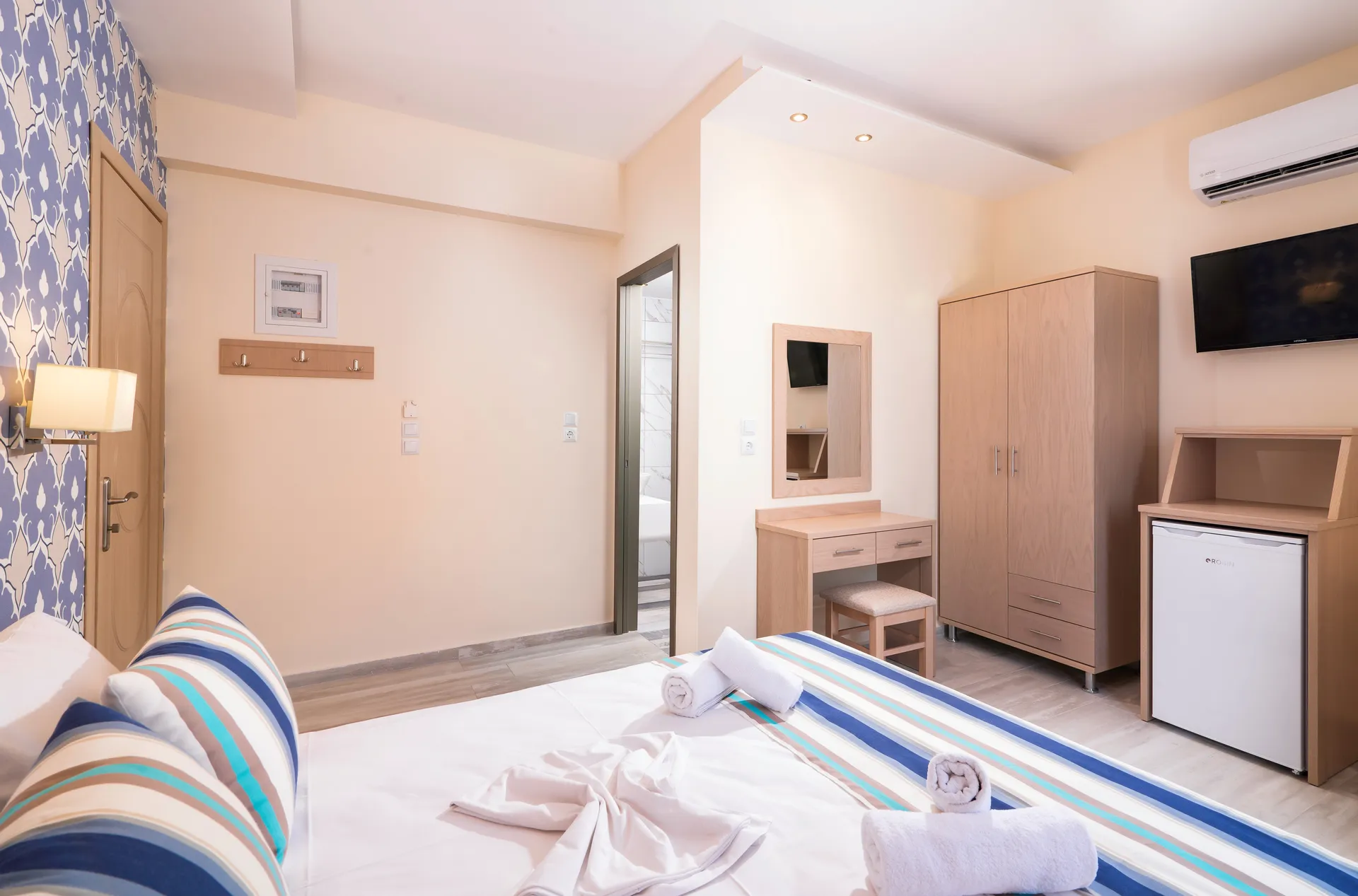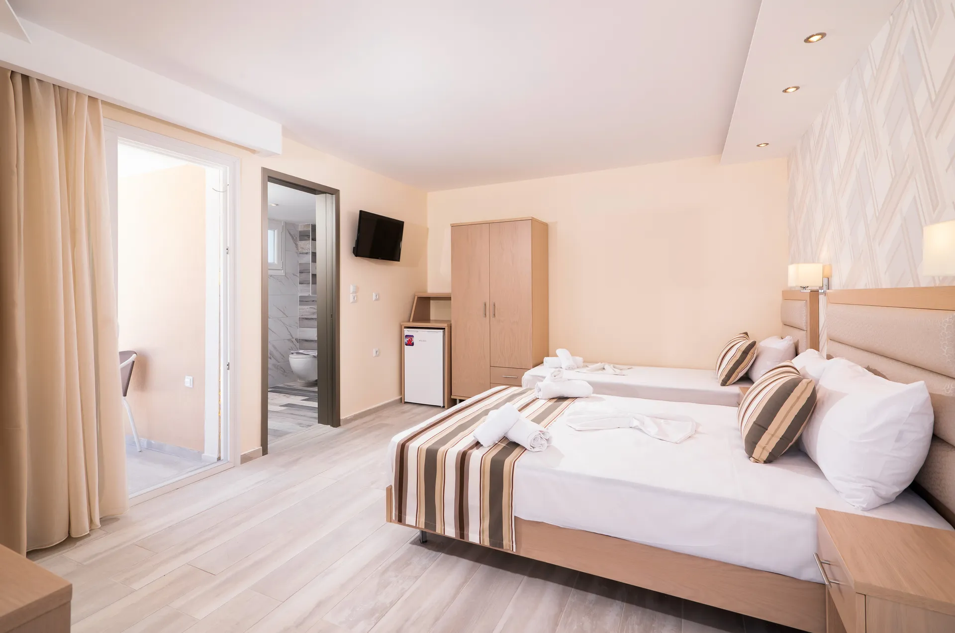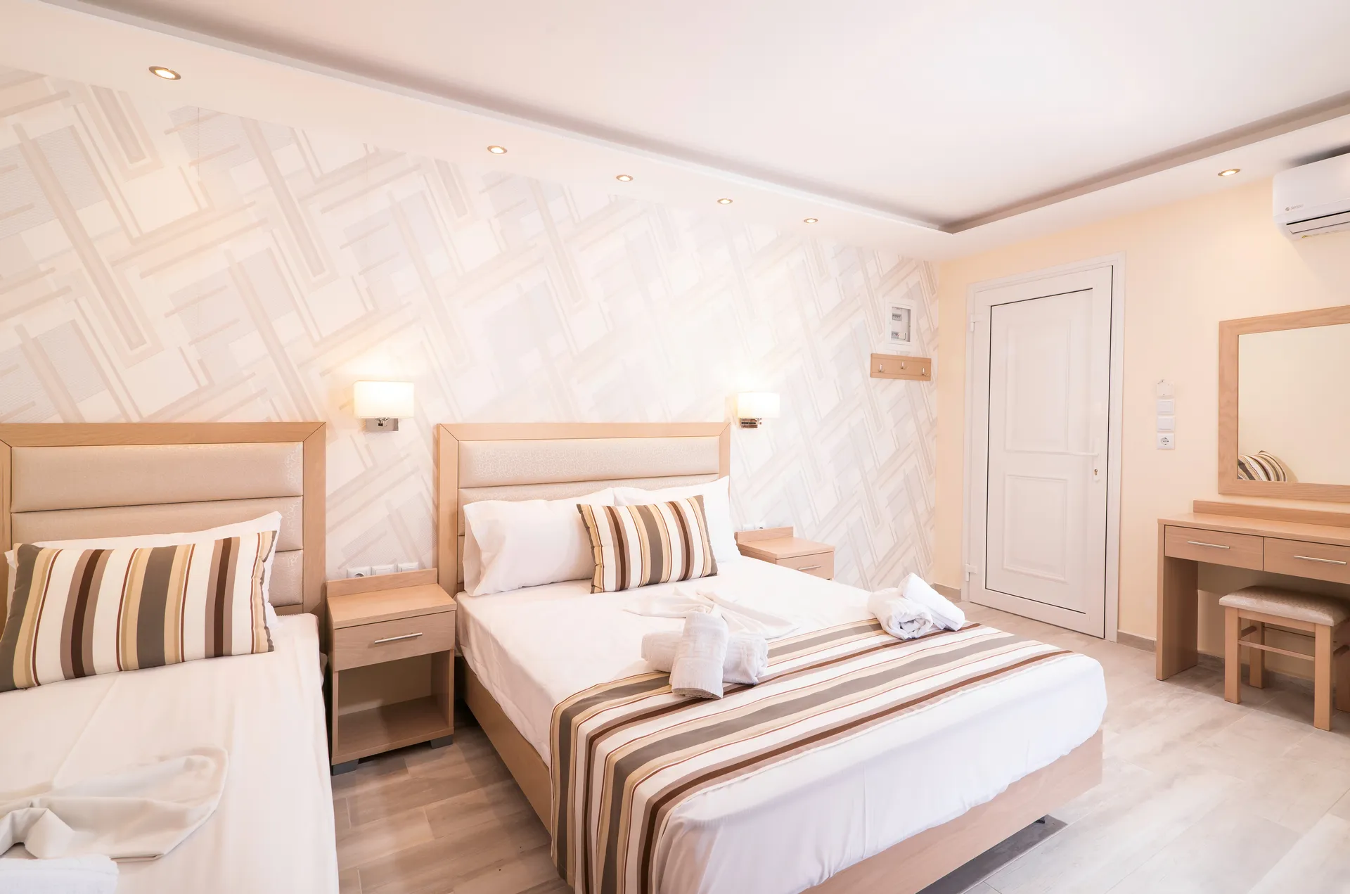 Ova soba je prelepo uređena i idealna je za porodice ili grupe prijatelja, jer može da primi do tri osobe, dva gosta mogu da se smeste u bračnom krevetu, a jedan u krevetu za jednu osobu. Soba takođe sadrži garderober, mini frižider, moderno kupatilo sa tušem i sve potrebne sadržaje koji će vaš boravak učiniti udobnim. Na kraju, soba ima direktan pristup prostranom nameštenom balkonu sa prelepim pogledom na more, gde se možete opustiti.