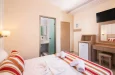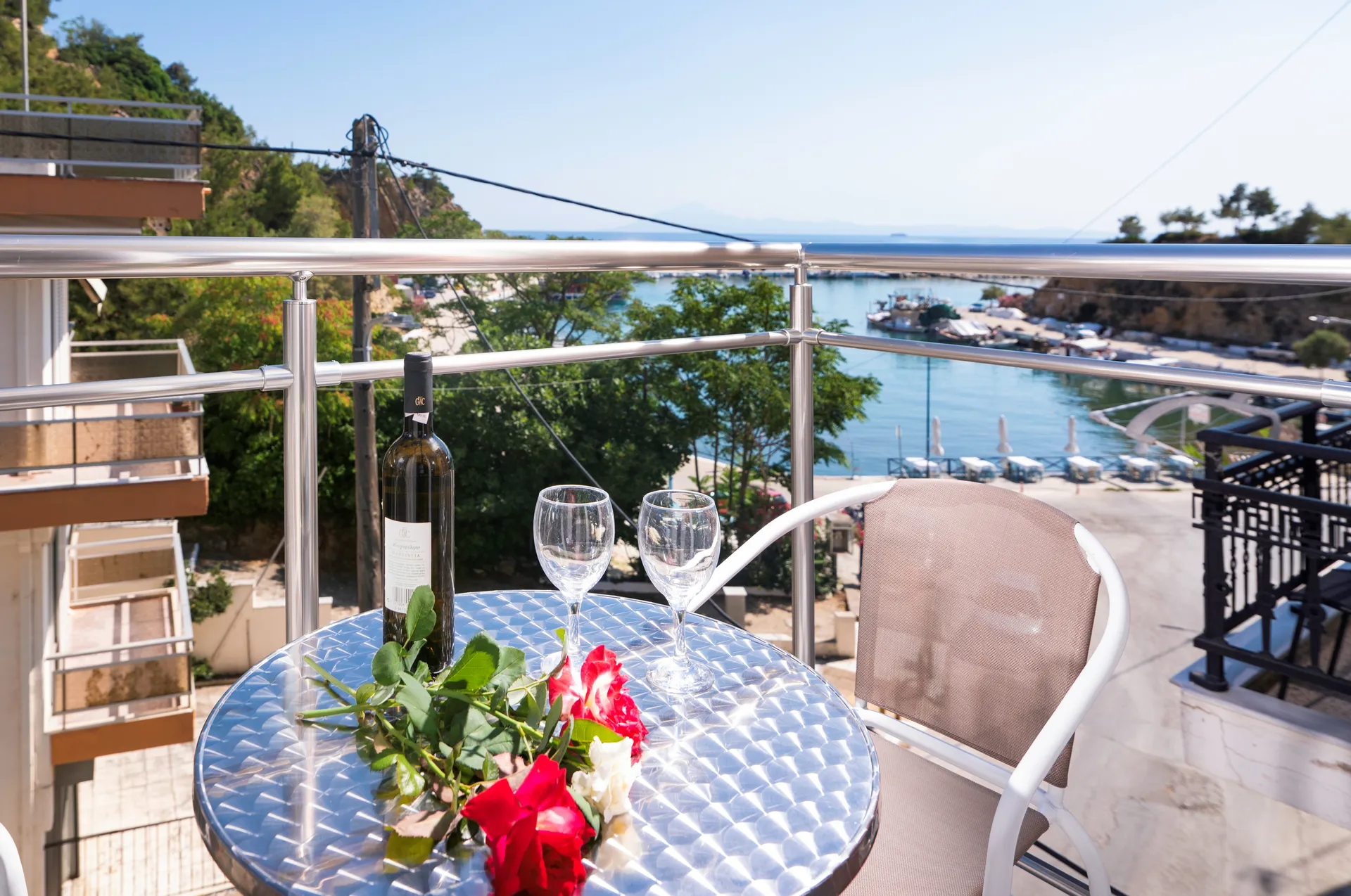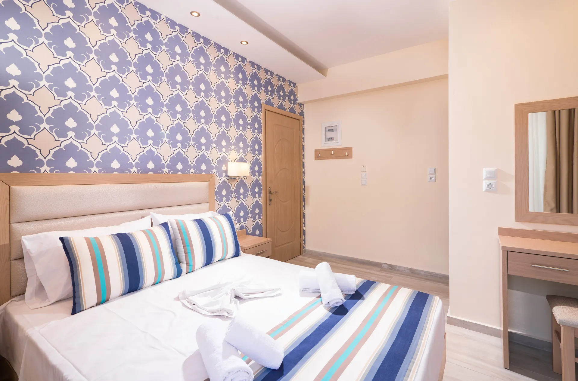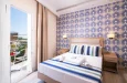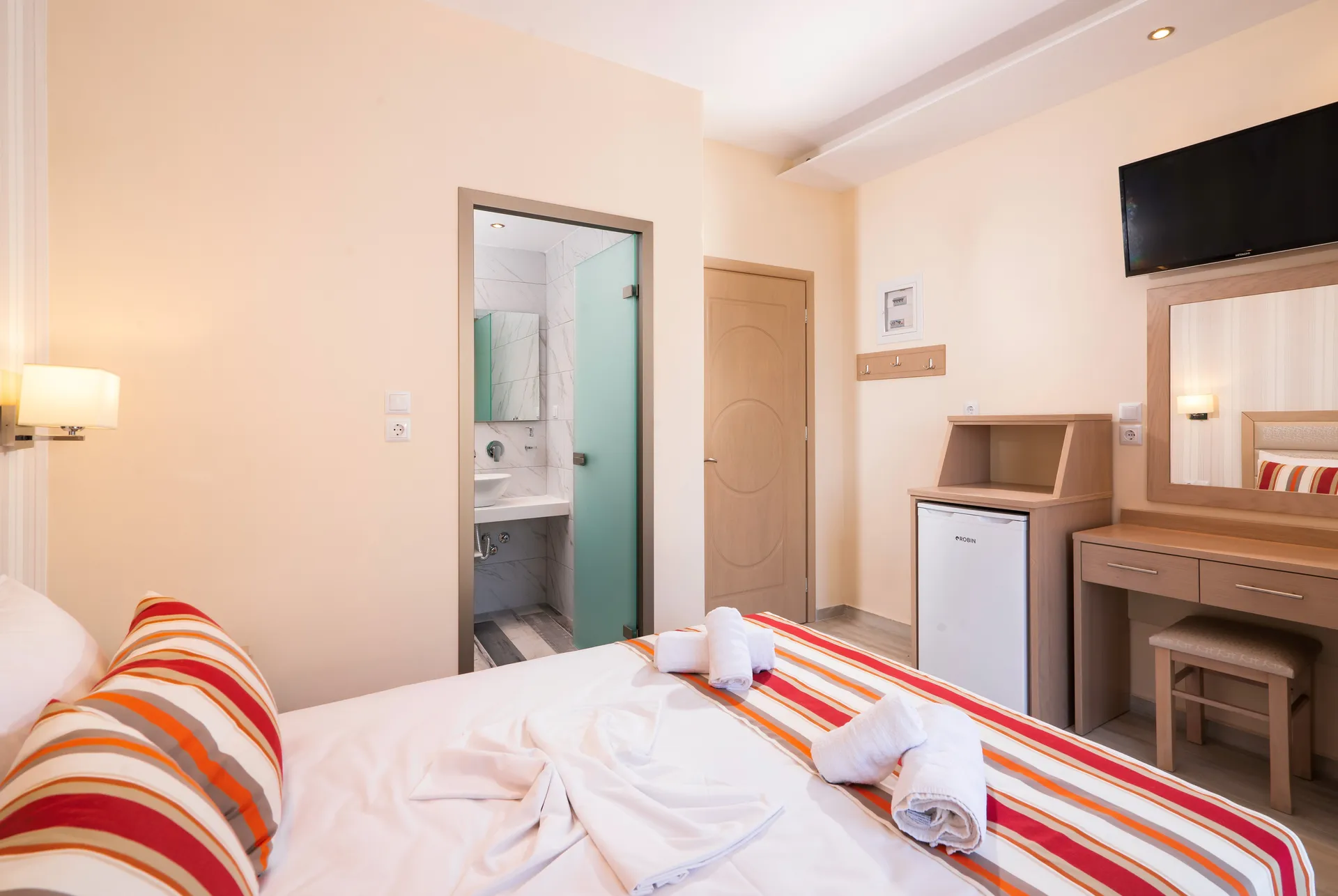 Ova soba je prelepo uređena i idealna je za porodice ili grupe prijatelja, jer može da primi do tri osobe, dva gosta mogu da se smeste u bračnom krevetu, a jedan u krevetu za jednu osobu. Soba takođe sadrži garderober, mini frižider, moderno kupatilo sa tušem i sve potrebne sadržaje koji će vaš boravak učiniti udobnim. Na kraju, soba ima direktan pristup prostranom nameštenom balkonu sa prelepim pogledom na more, gde se možete opustiti.