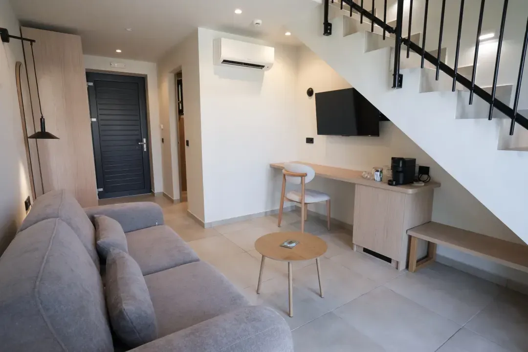 Stilski kutak smešten na gornjem spratu, sa zadivljujućim pogledom na more i bazen. Dizajniran za smeštaj do 4 osobe, ovaj prostrani potkrovni apartman spaja opuštenu udobnost sa modernim stilom, što ga čini savršenim za porodice ili prijatelje koji traže živopisno i spokojno bekstvo.
