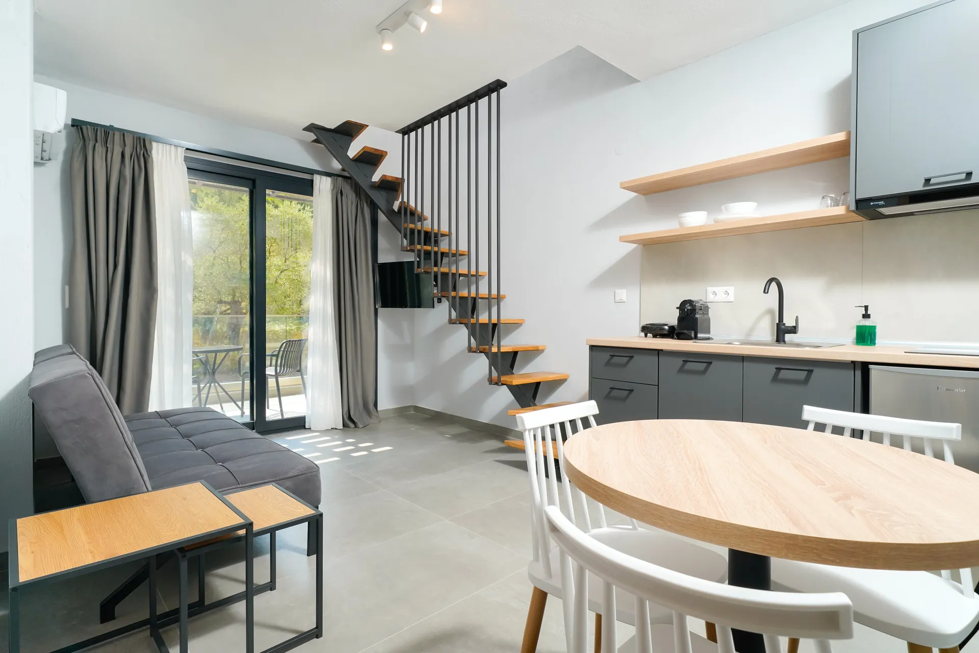 Deluxe Suite Opustite se u našem prostranom deluks apartmanu sa privatnim ulazom, koji sadrži spavaću sobu otvorenog plana, udoban prostor za sedenje sa sofom na razvlačenje i moderno kupatilo sa tušem. Drugi bračni krevet nalazi se u otvorenom prostoru za spavanje na gornjem nivou, do kojeg se može doći unutrašnjim stepeništem. Iako je uzdignut i nezavisan od dnevnog boravka, ovaj prostor nije odvojen vratima koja se zatvaraju. Tu je i potpuno opremljena kuhinja. Uživajte u udobnostima klima uređaja, televizora ravnog ekrana, mini-bara i pribora za pripremu čaja i kafe, dok se opuštate i uživate u spokojnom pogledu na baštu iz vašeg apartmana.