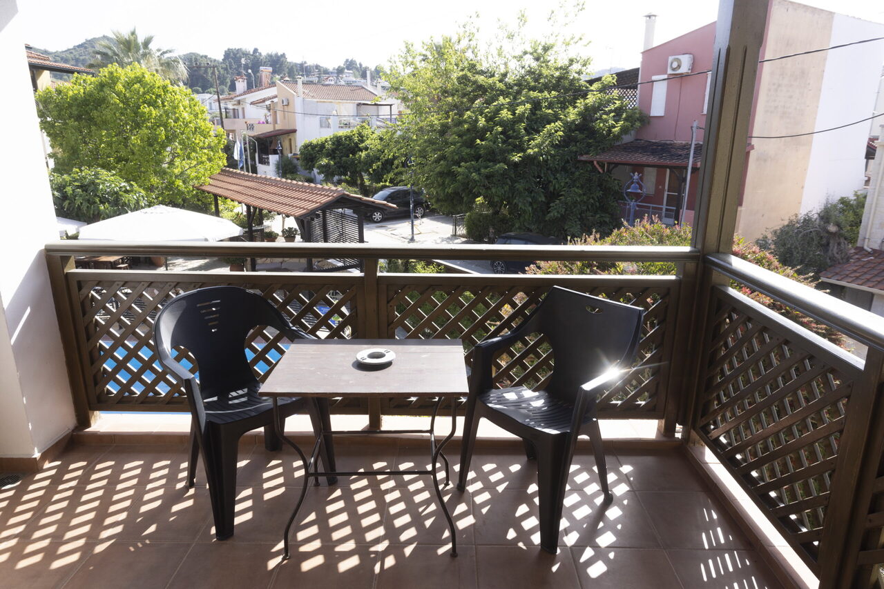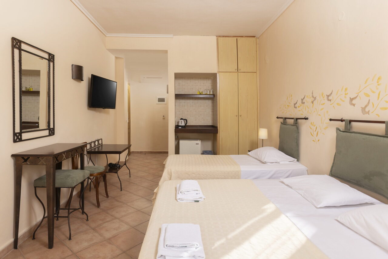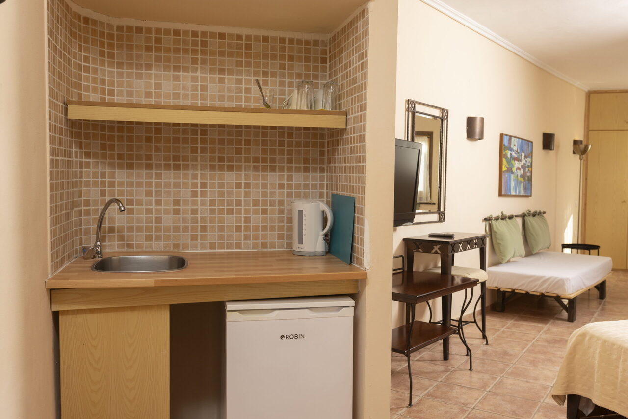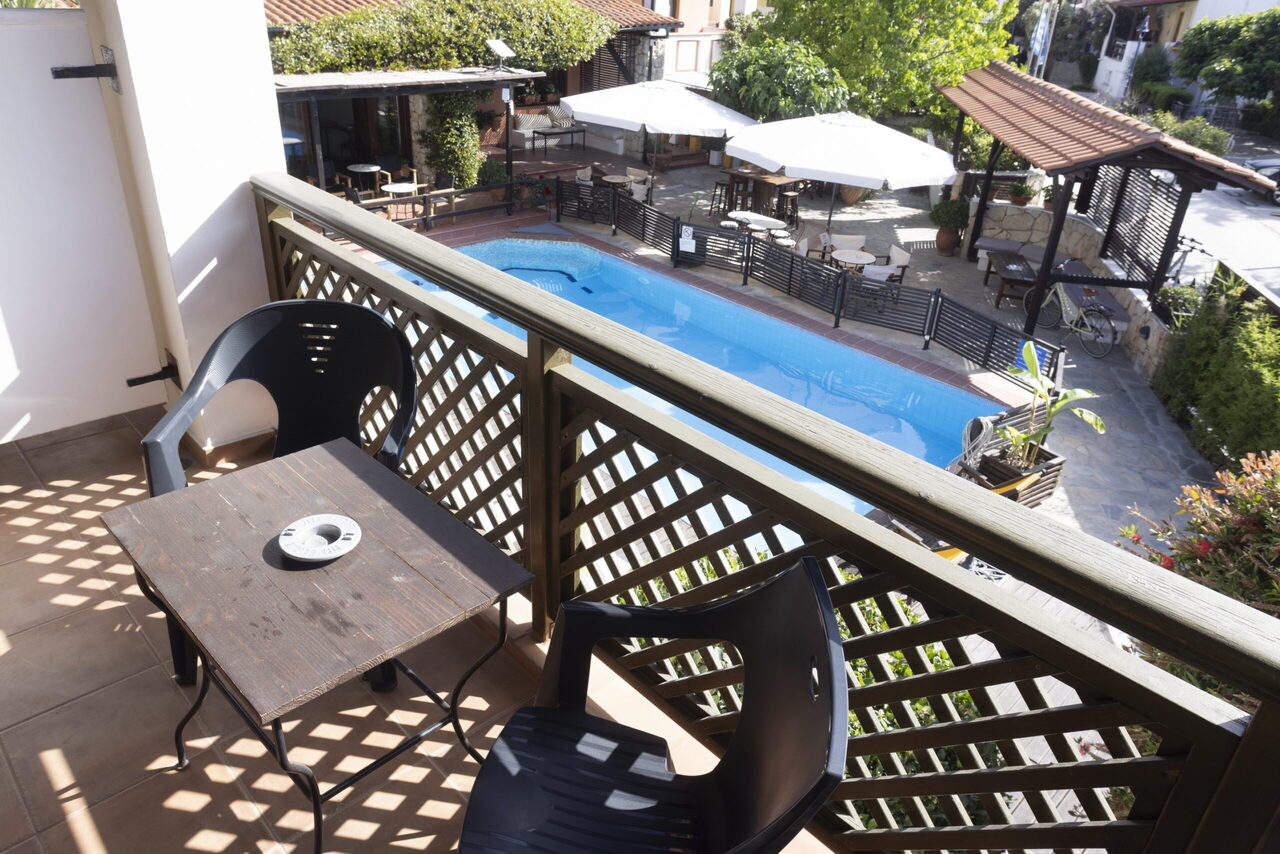 Ovaj studio na gornjem spratu ima 2 jednokrevetna kreveta i 1 bračni krevetima sa pogledom na bazen ili baštu sa svog privatnog balkona ili terase. Pod je od pločica/mermera. Dostupni su klima uređaj, frižider, TV, električno kuvalo, sušilica za odeću, peškiri, ormar ili plakari, spoljni nameštaj.