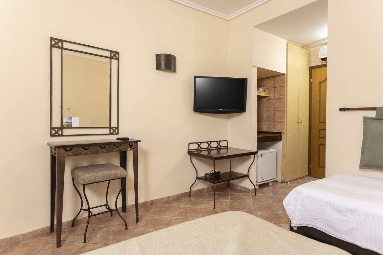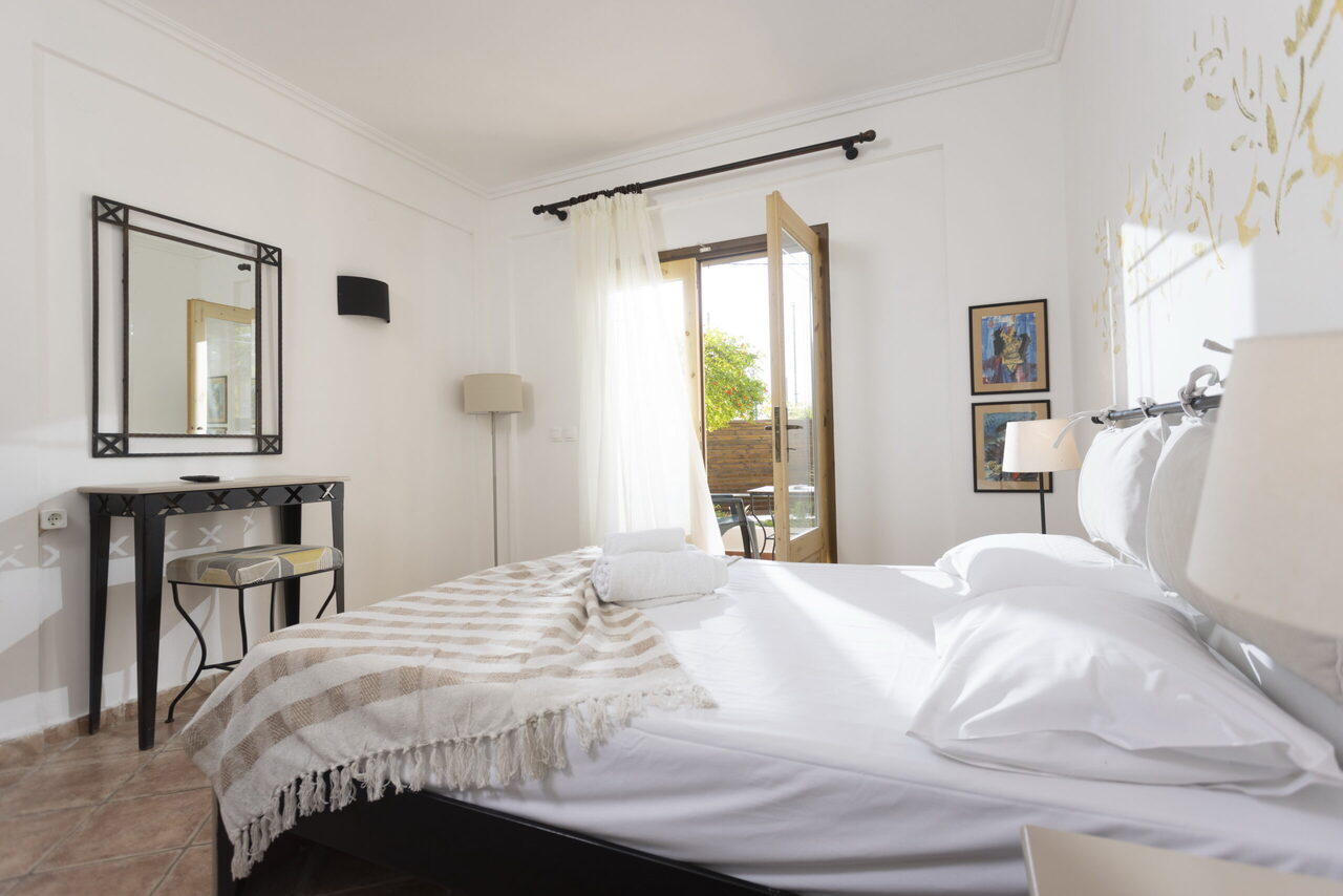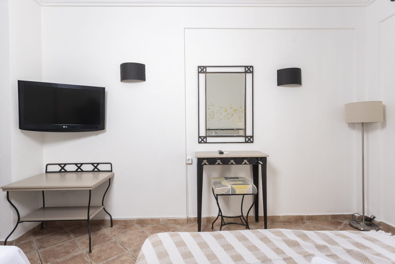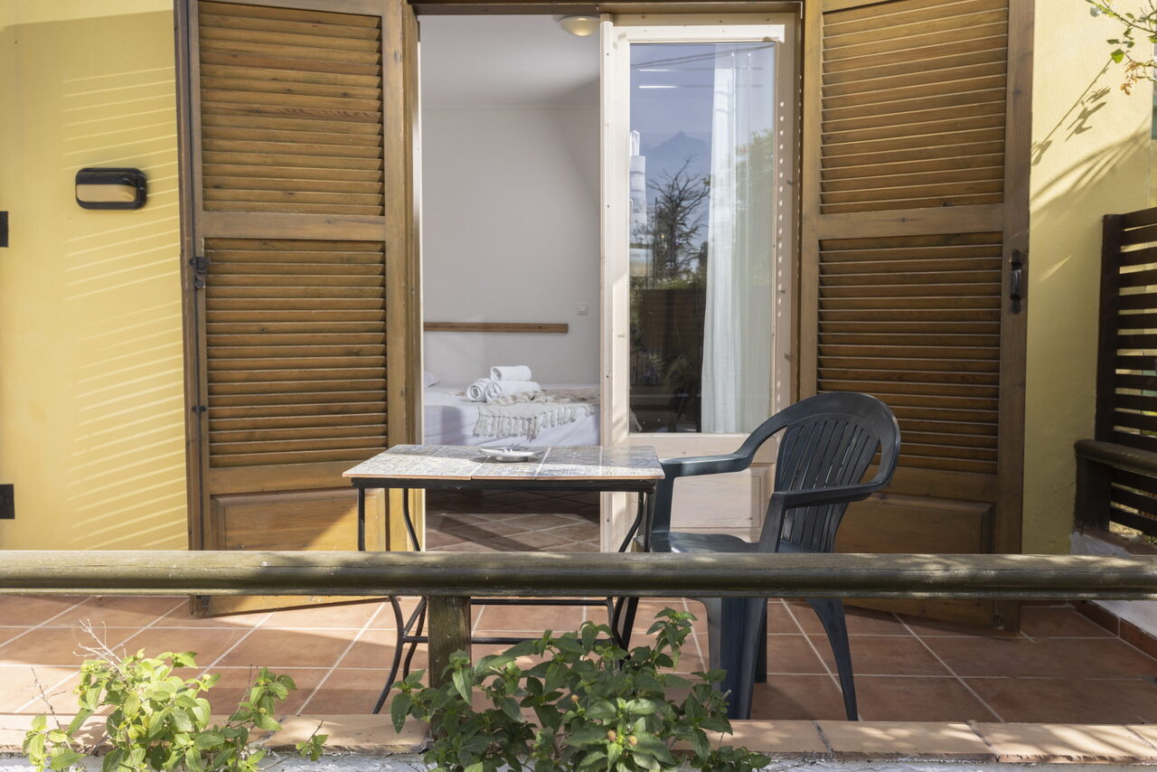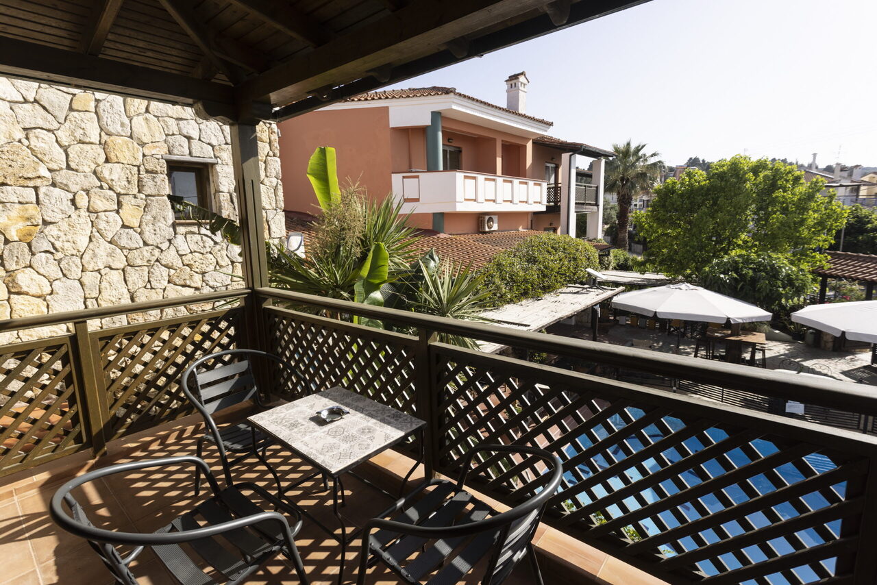 Ovaj studio na gornjem spratu ima 2 jednokrevetna kreveta i 1 bračni krevetima sa pogledom na bazen ili baštu sa svog privatnog balkona ili terase. Pod je od pločica/mermera. Dostupni su klima uređaj, frižider, TV, električno kuvalo, sušilica za odeću, peškiri, ormar ili plakari, spoljni nameštaj.