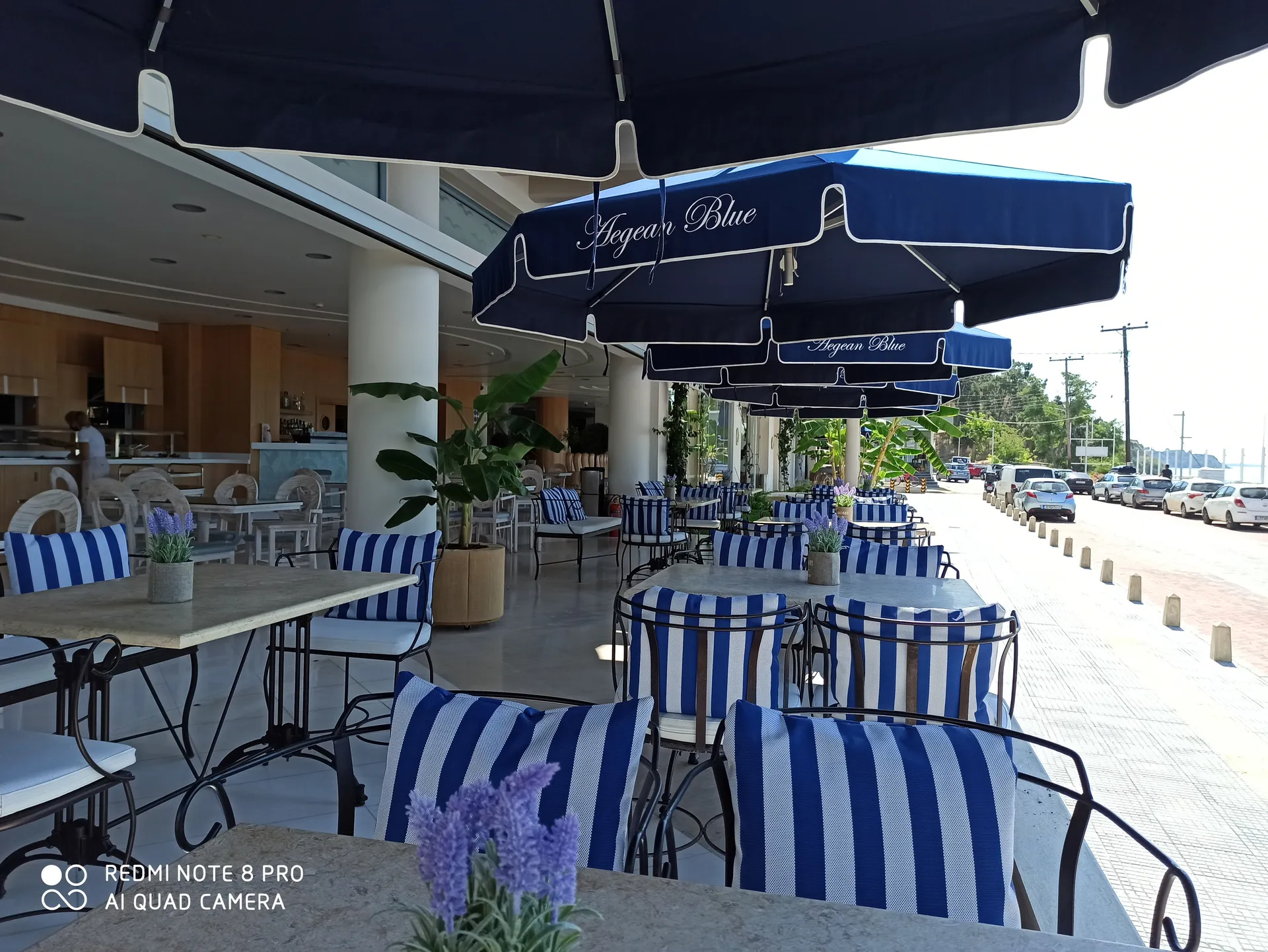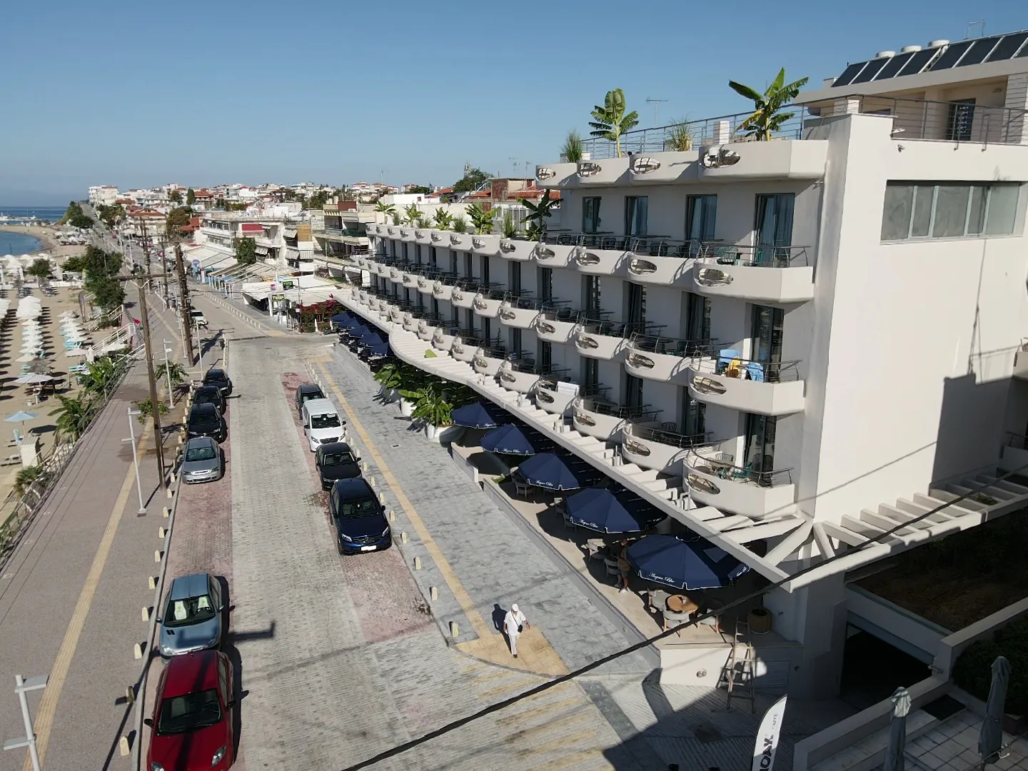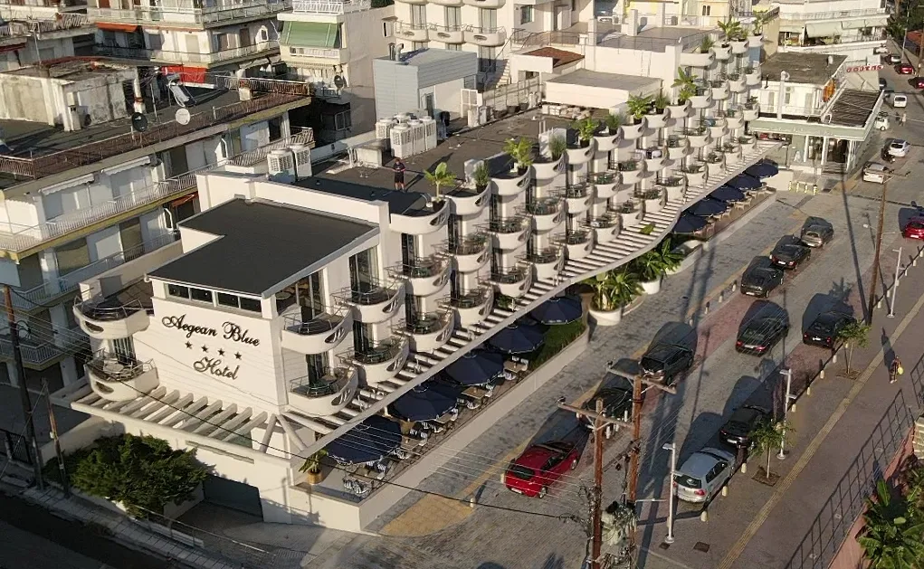 Aegean Blue Hotel se nalazi u centru Nea Kalikratije u severnoj Grčkoj. Izgrađen je na obali mora, na peščanoj plaži. U blizini se nalazi mnogo restorana, kafića, barova i dobar trgovački centar. Nudi 57 potpuno opremljenih soba sa pogledom na more ili bez. Za novu sezonu, samo hotelske sobe su u funkciji. U zgradu možete ući koristeći ključ karticu sobe. Kada osoblje nije prisutno na recepciji, možete se prijaviti uz lozinku za ulaz. Podzemni parking se dodatno naplaćuje. Sva plaćanja mogu biti izvršena putem vaše kreditne kartice.