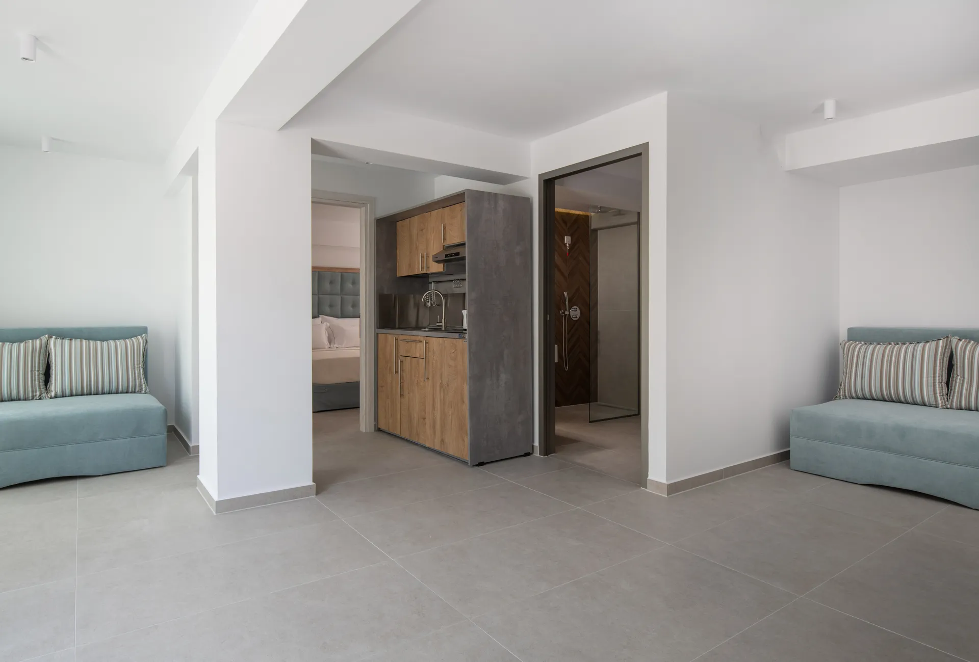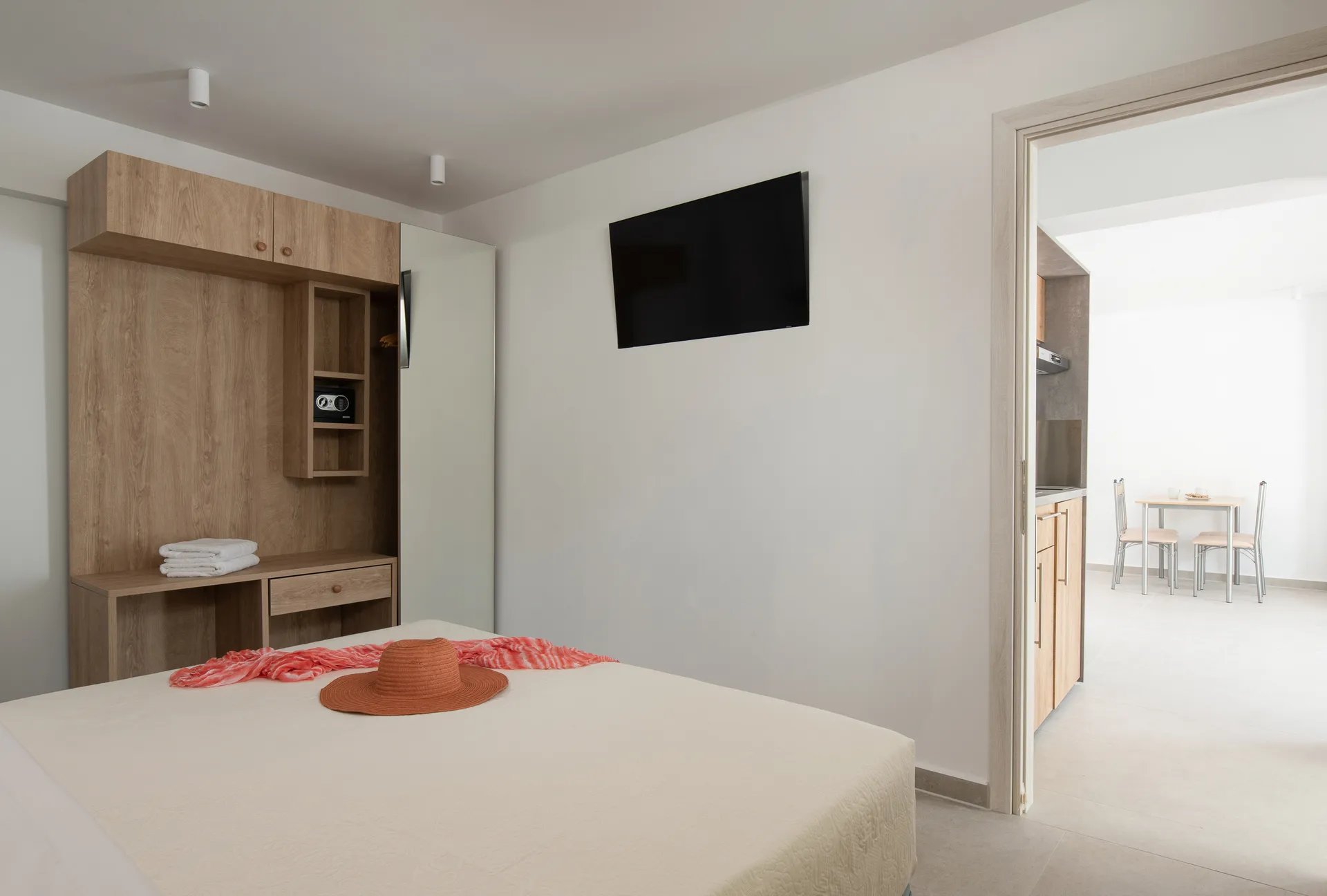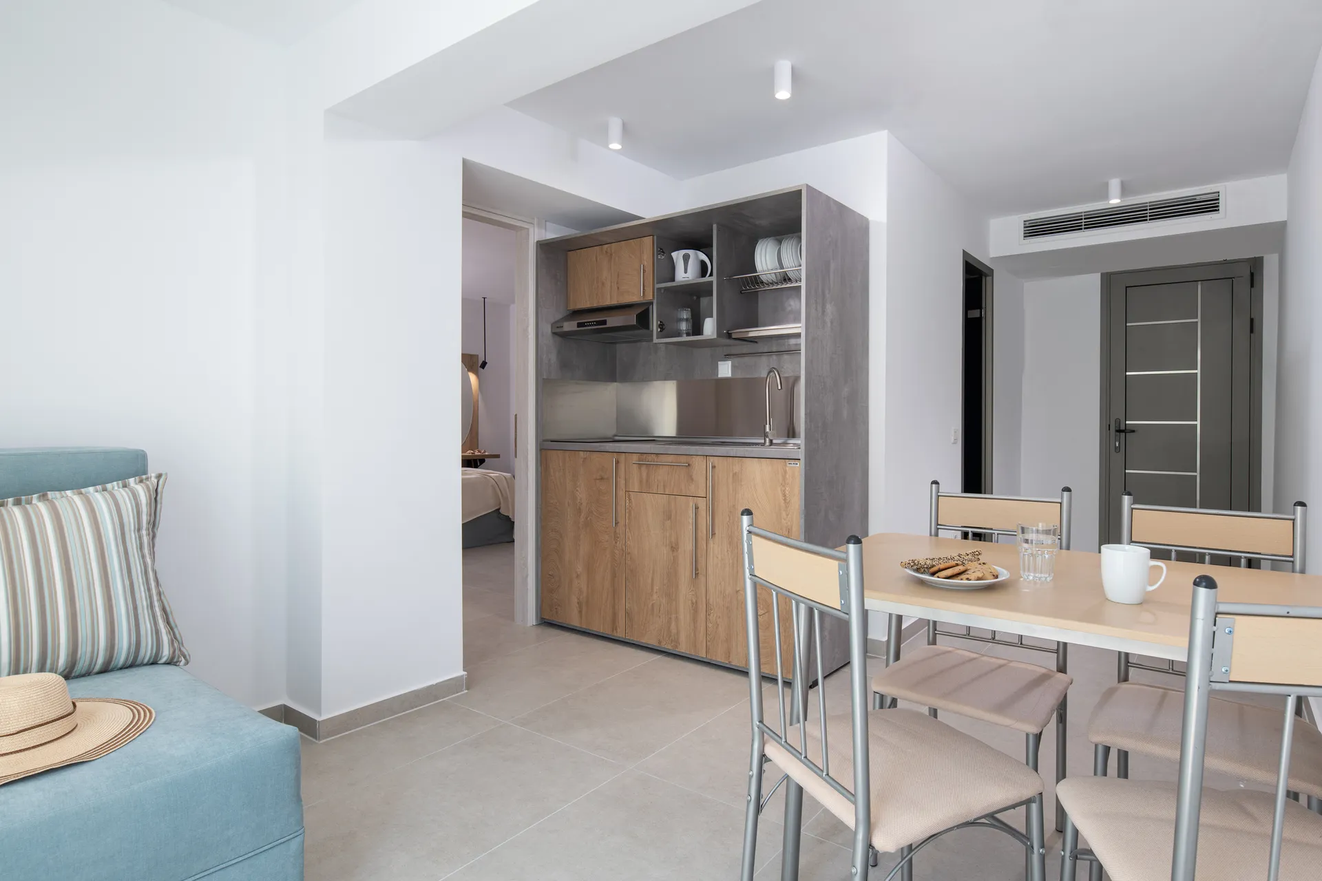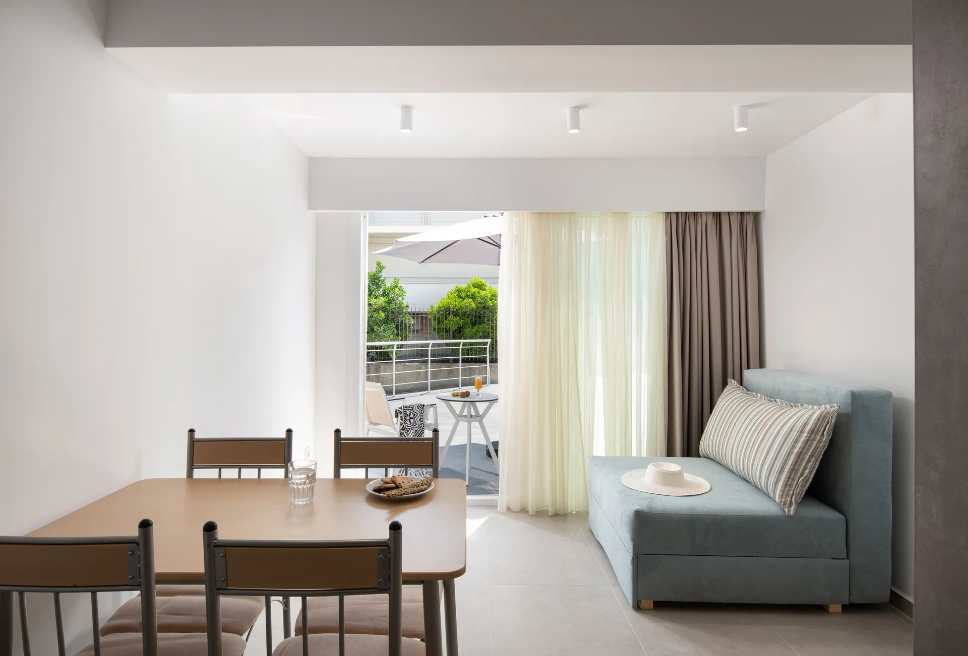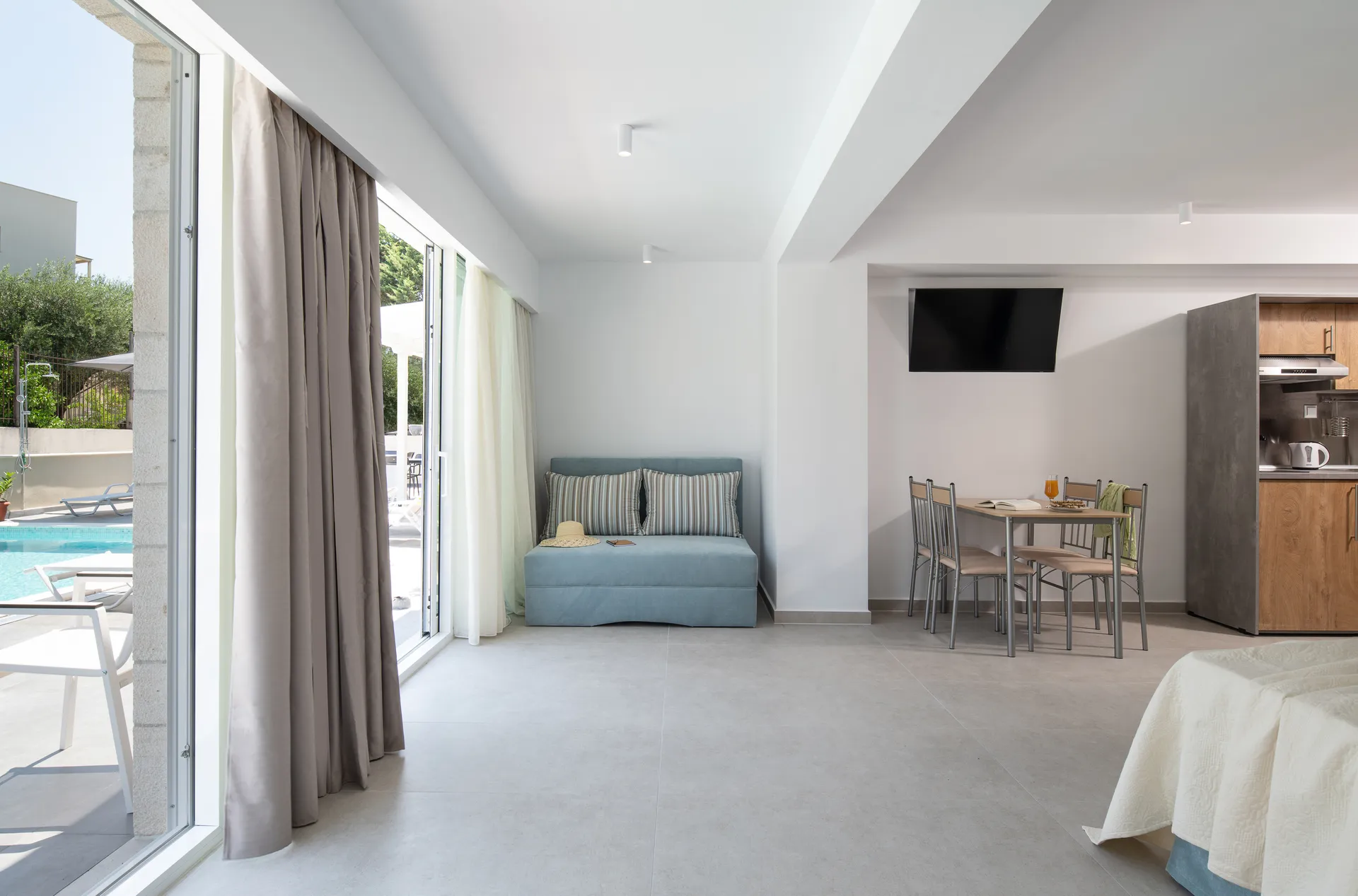 Porodični apartman Tanos od 27 m², idealan za porodice sa mlađom decom. Ima odvojenu spavaću sobu, dnevnu sobu sa trpezarijom, opremljenu kuhinju, udobno kupatilo i pristup bašti/bazenu.