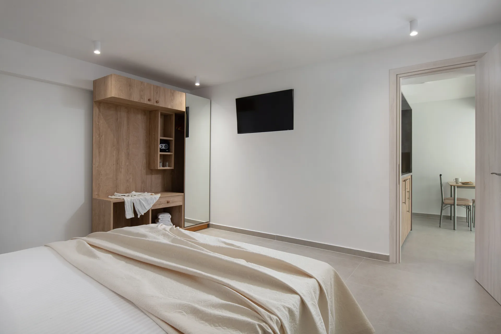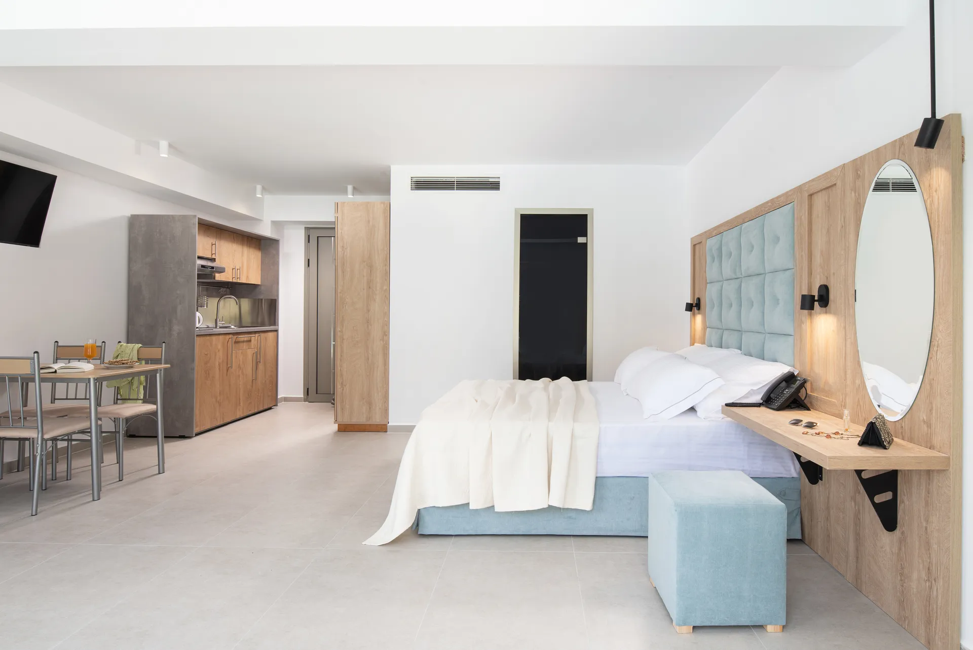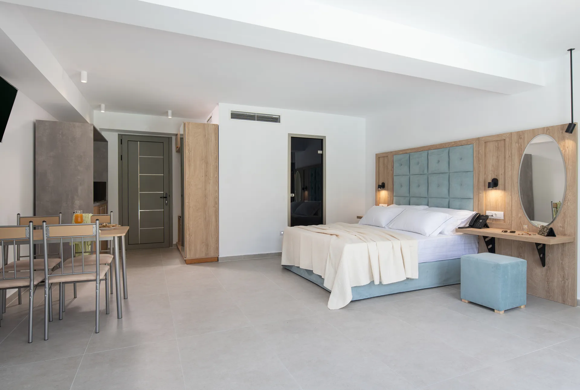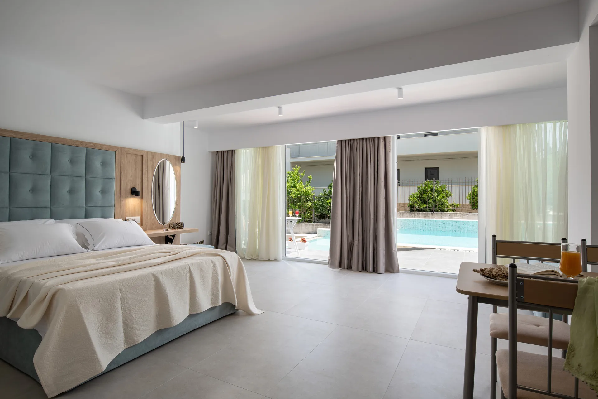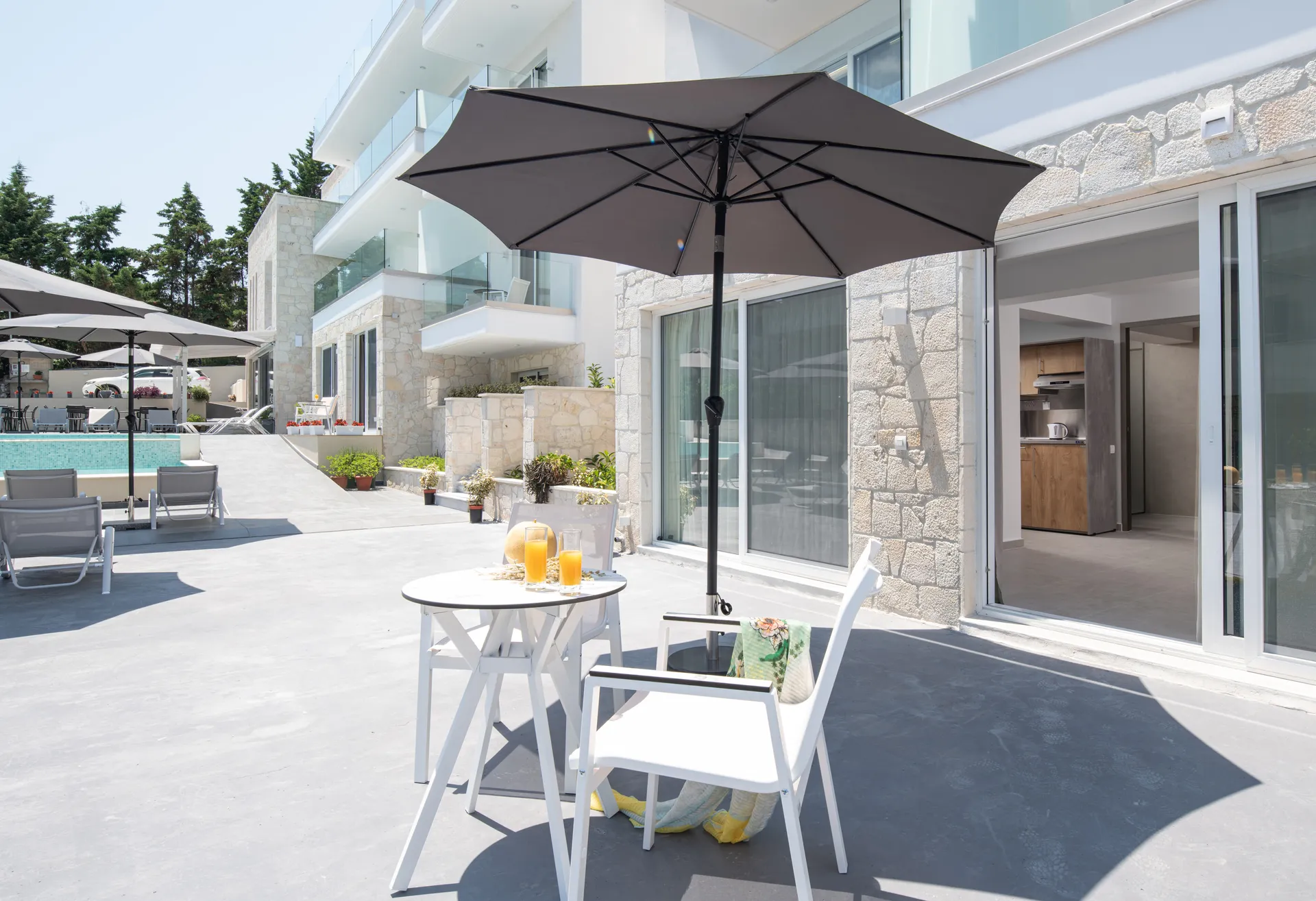Porodični apartman Tanos od 27 m², idealan za porodice sa mlađom decom. Ima odvojenu spavaću sobu, dnevnu sobu sa trpezarijom, opremljenu kuhinju, udobno kupatilo i pristup bašti/bazenu.