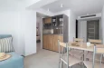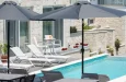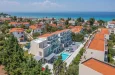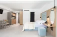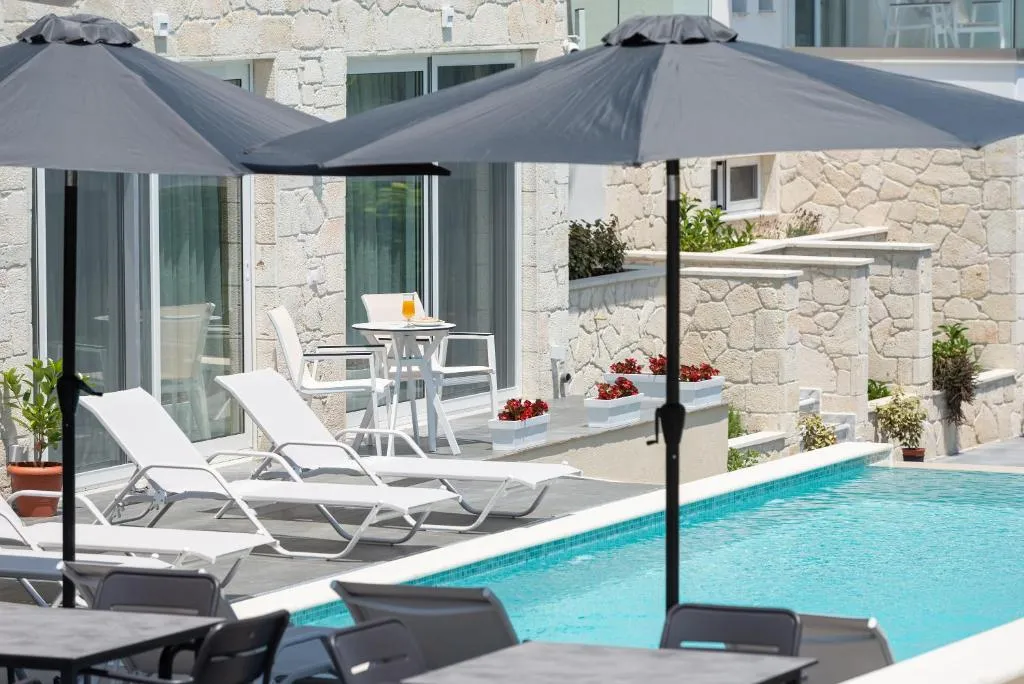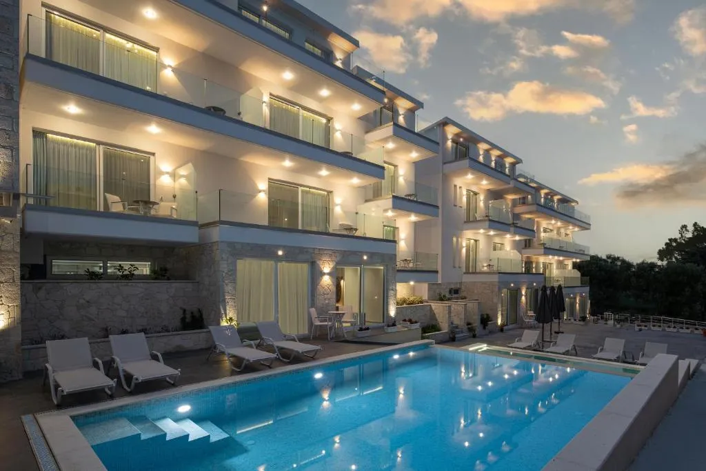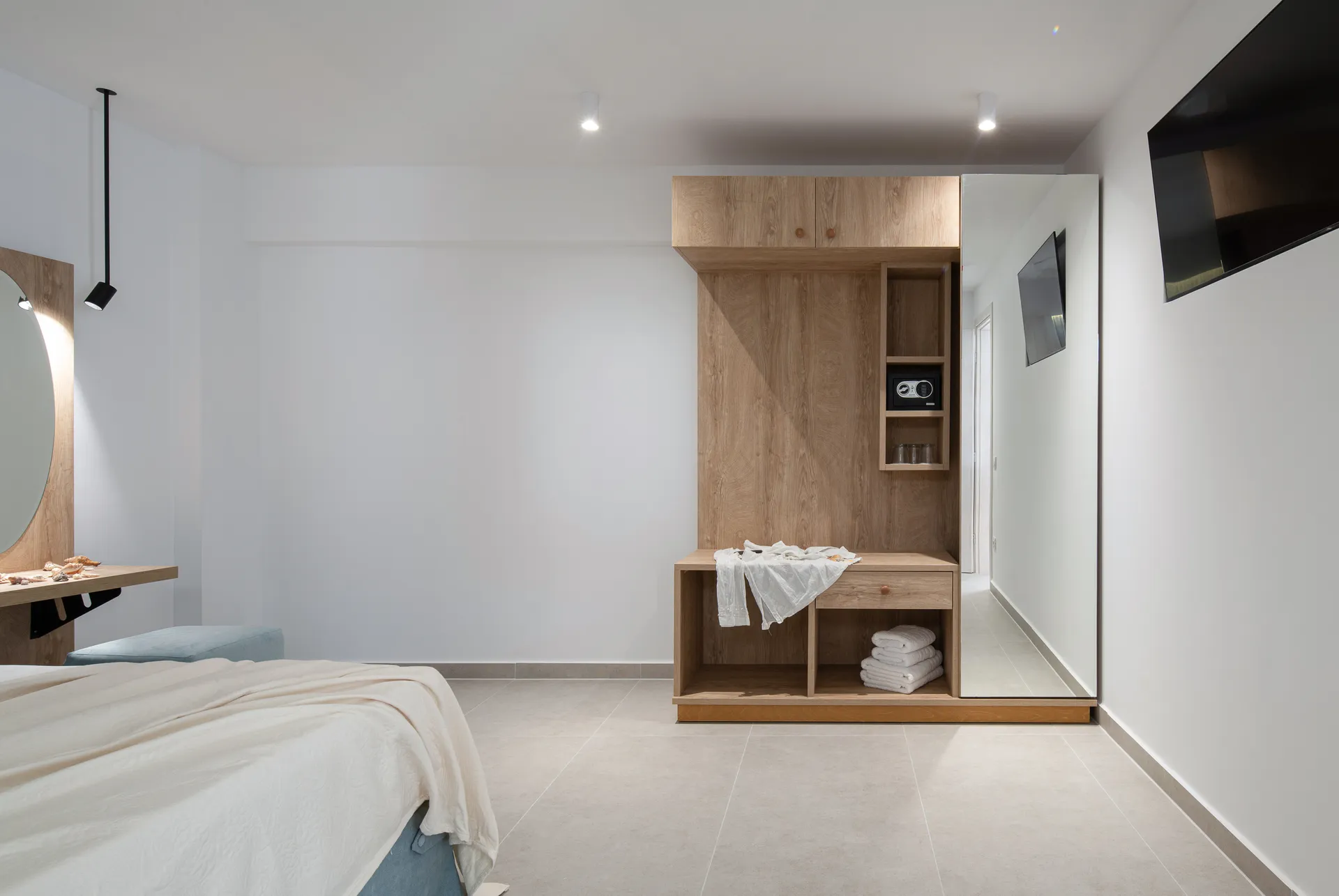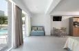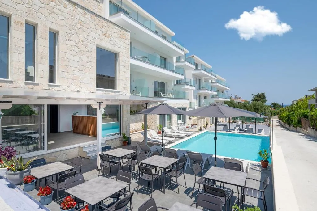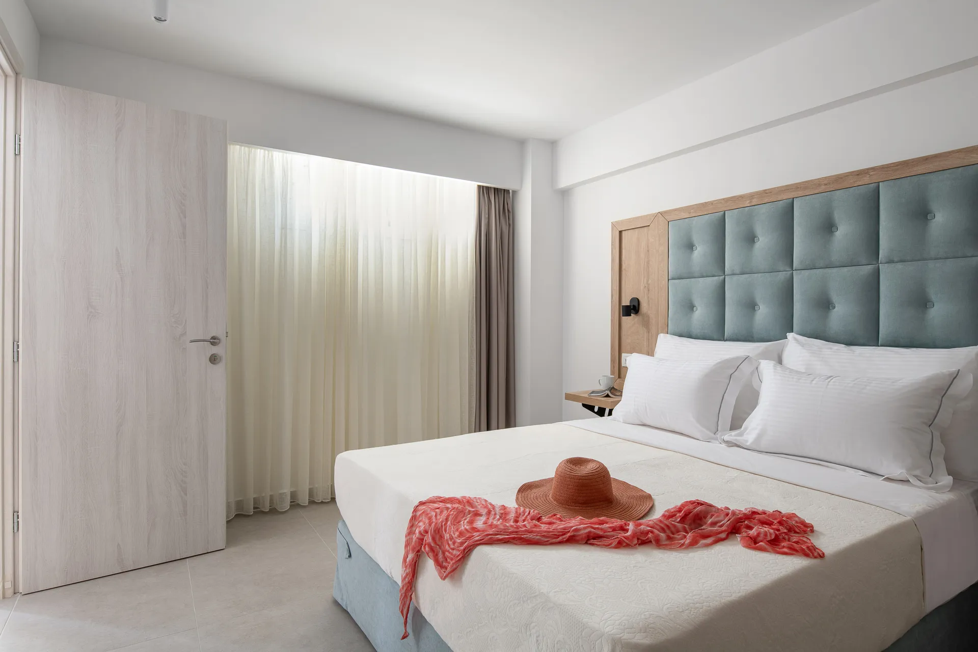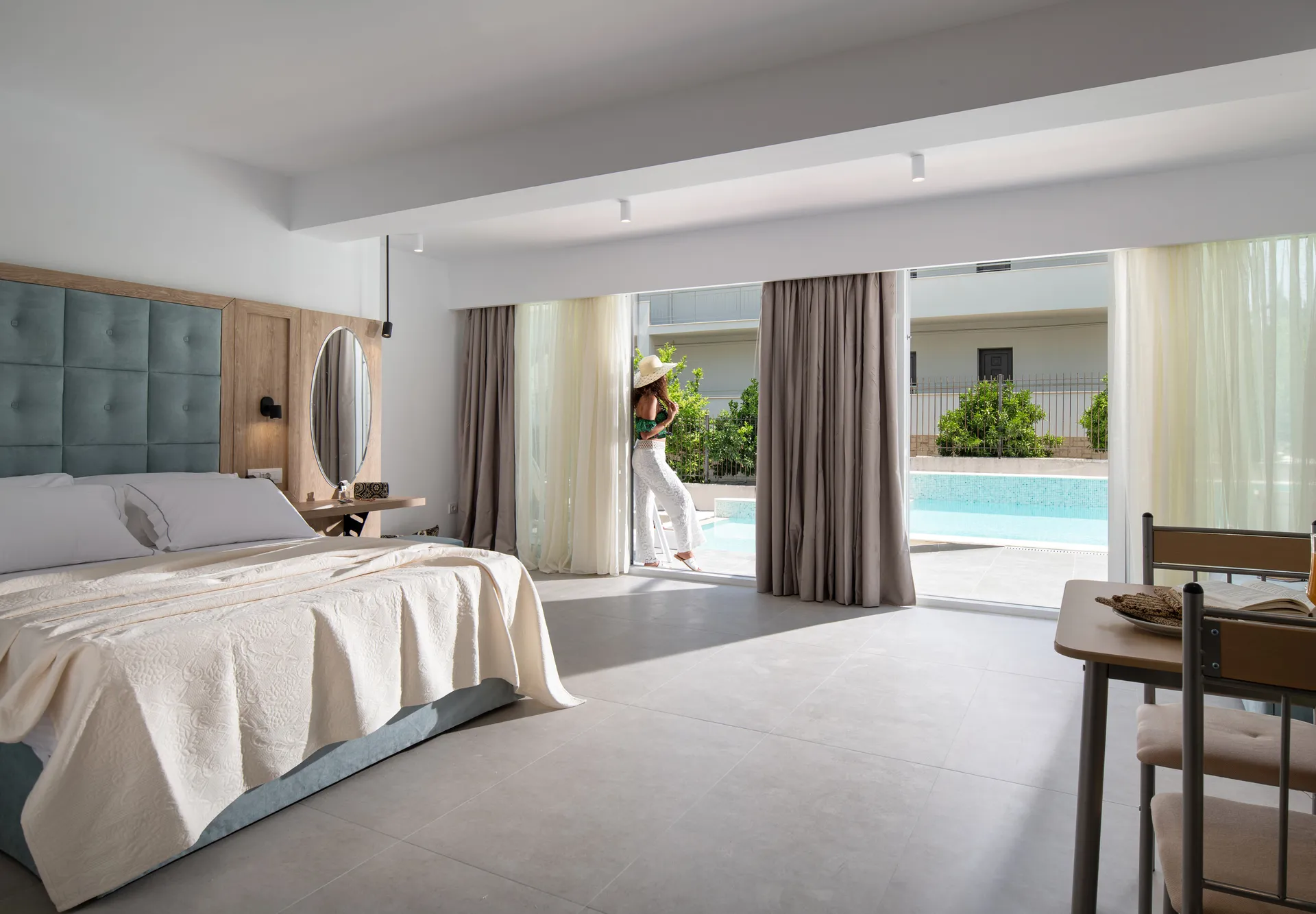 Porodični apartman Tanos od 27 m², idealan za porodice sa mlađom decom. Ima odvojenu spavaću sobu, dnevnu sobu sa trpezarijom, opremljenu kuhinju, udobno kupatilo i pristup bašti/bazenu.