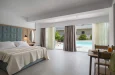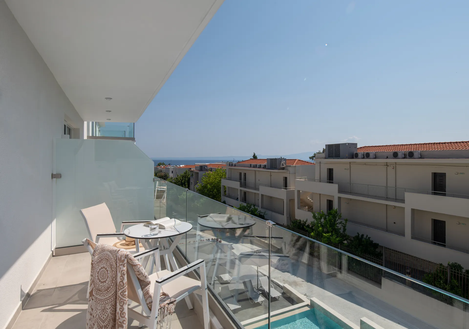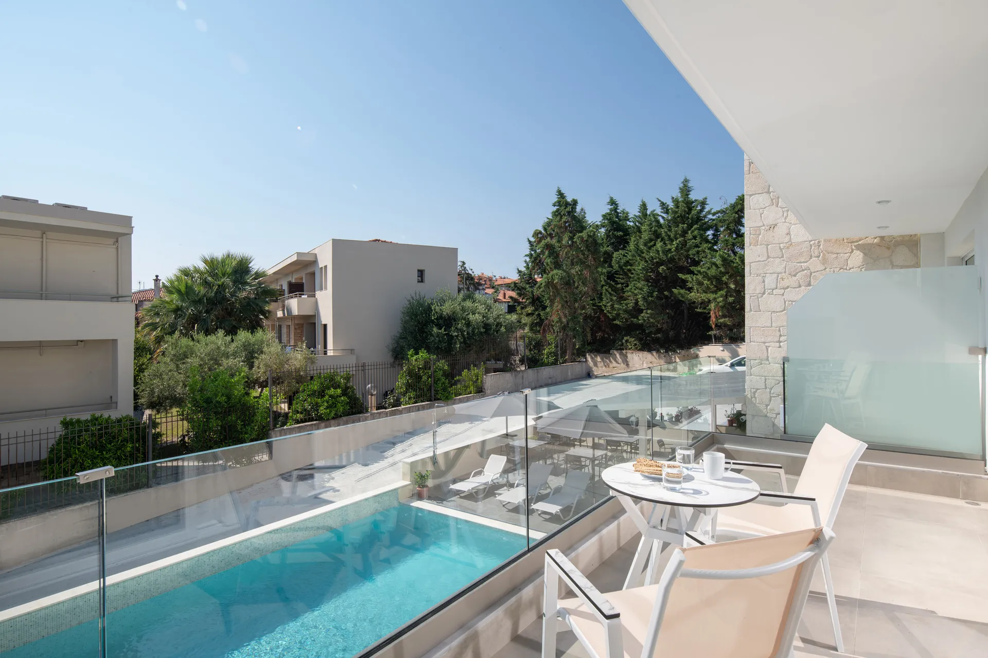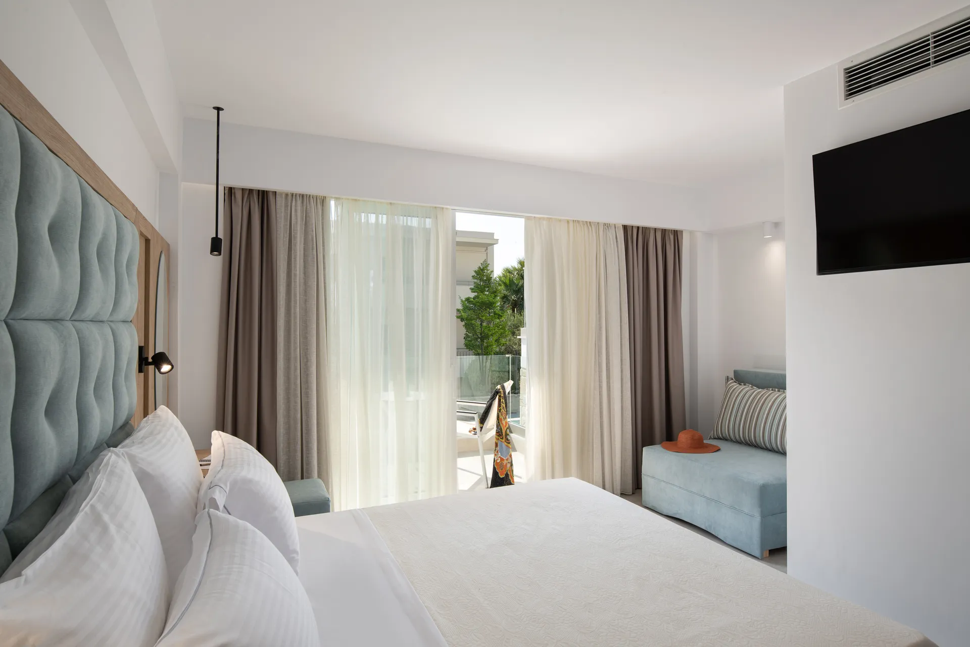 Dvokrevetna soba sa sofom na razvlačenje od 20 m² na prvom spratu, idealna za parove. Ima udobno kupatilo i privatni balkon sa pogledom na bazen.
