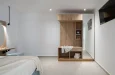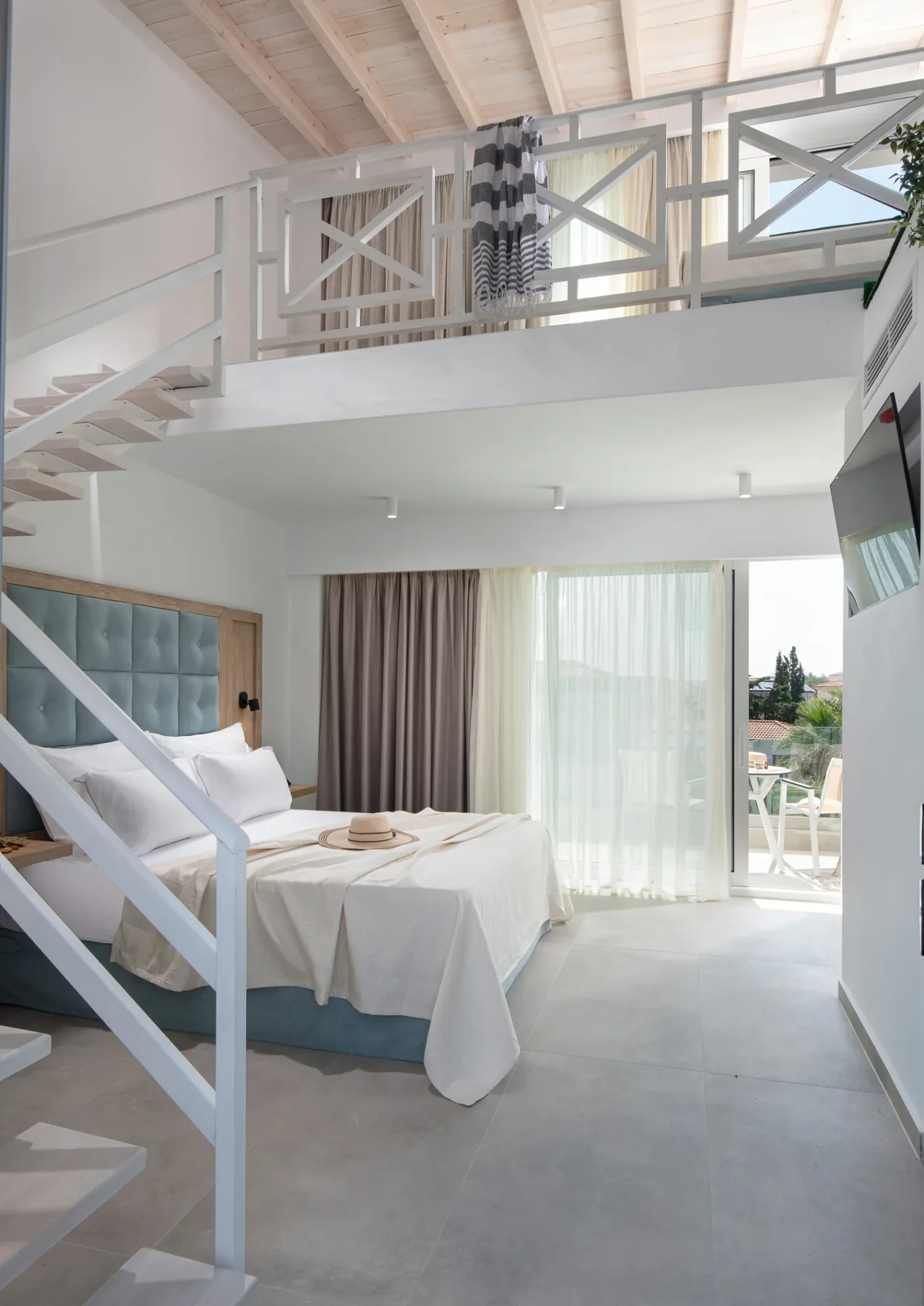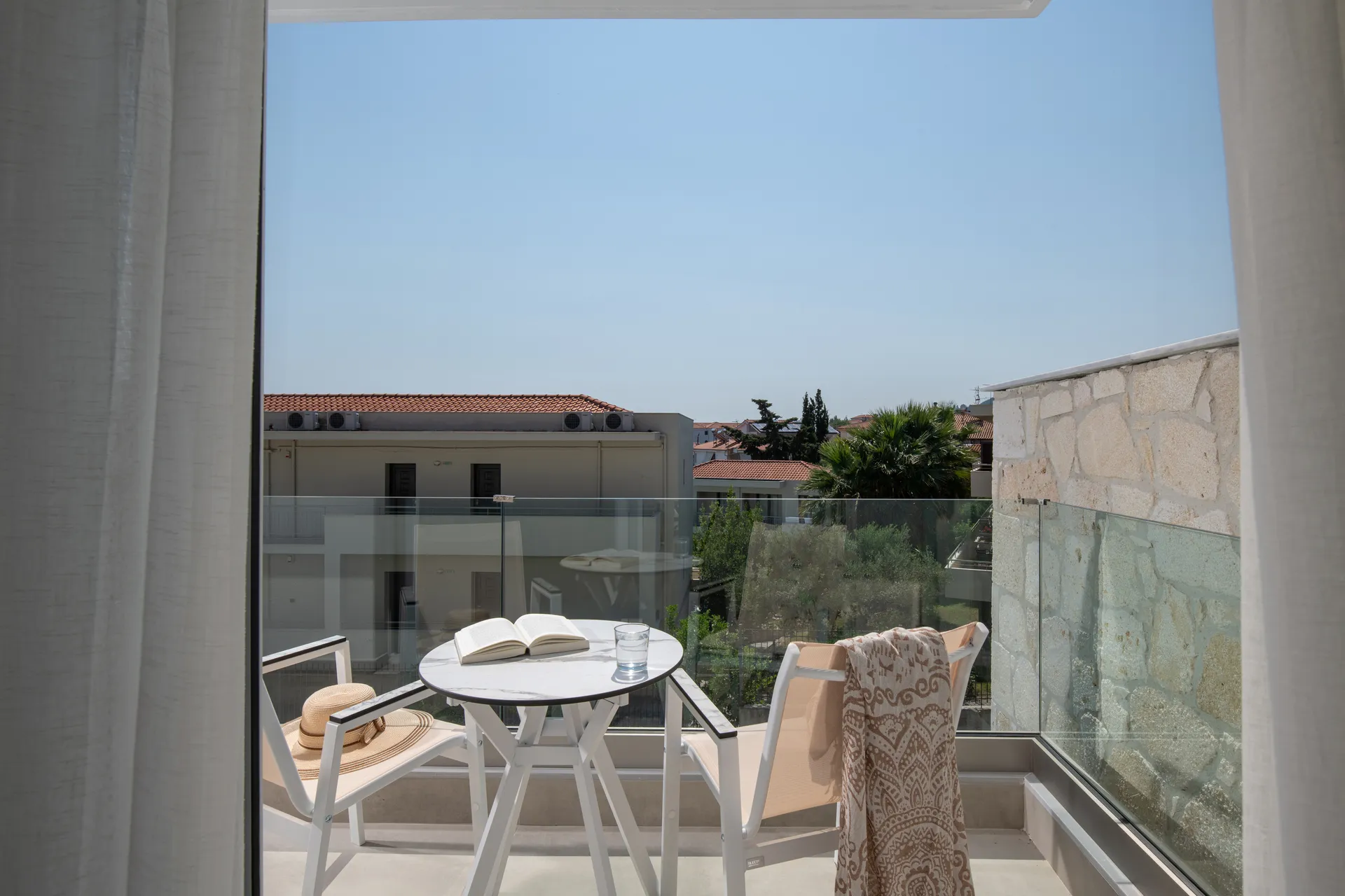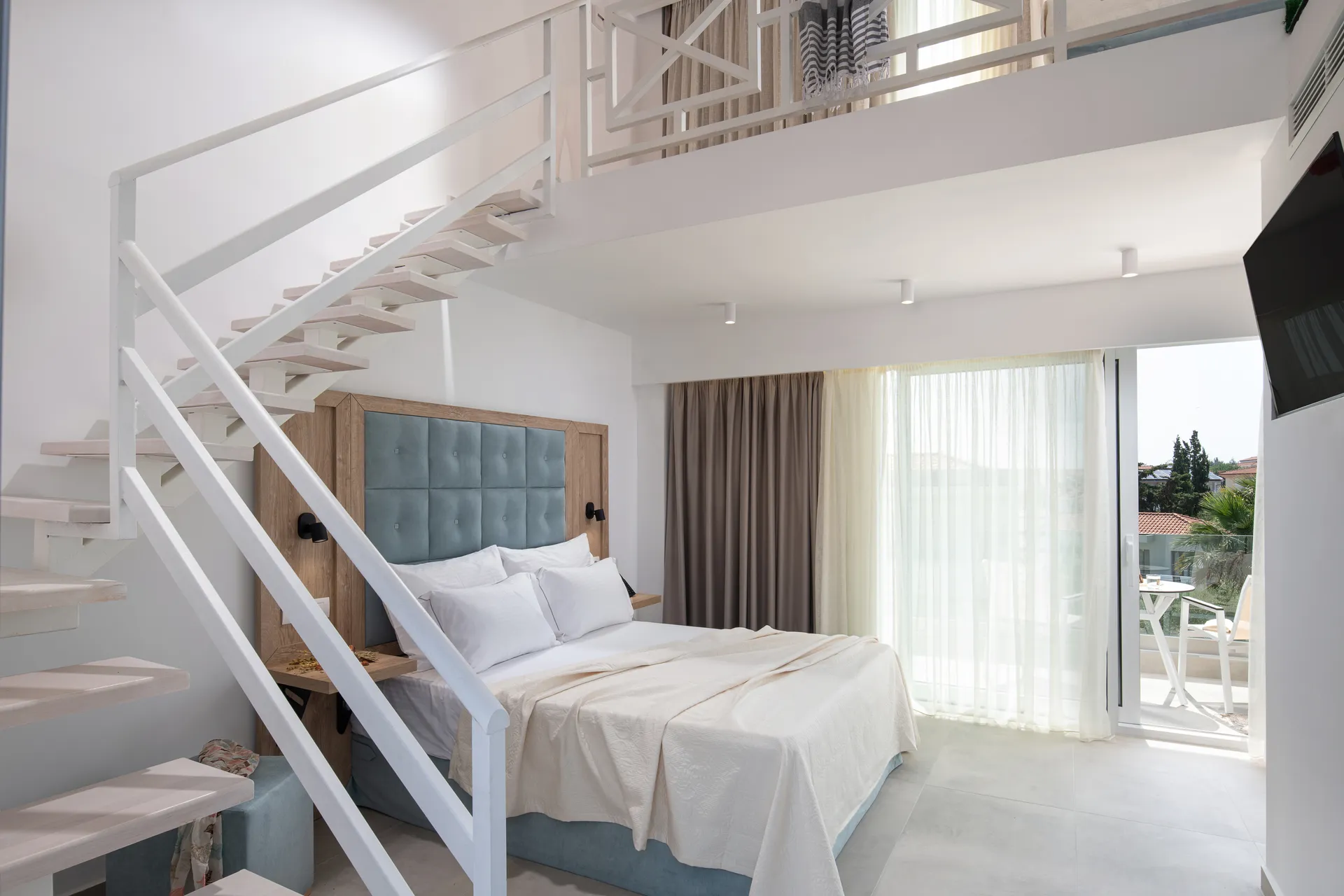 Dvokrevetna soba sa sofom na razvlačenje od 20 m² na prvom spratu, idealna za parove. Ima udobno kupatilo i privatni balkon sa pogledom na bazen.