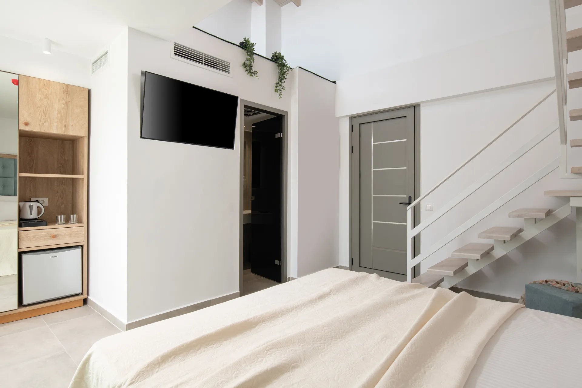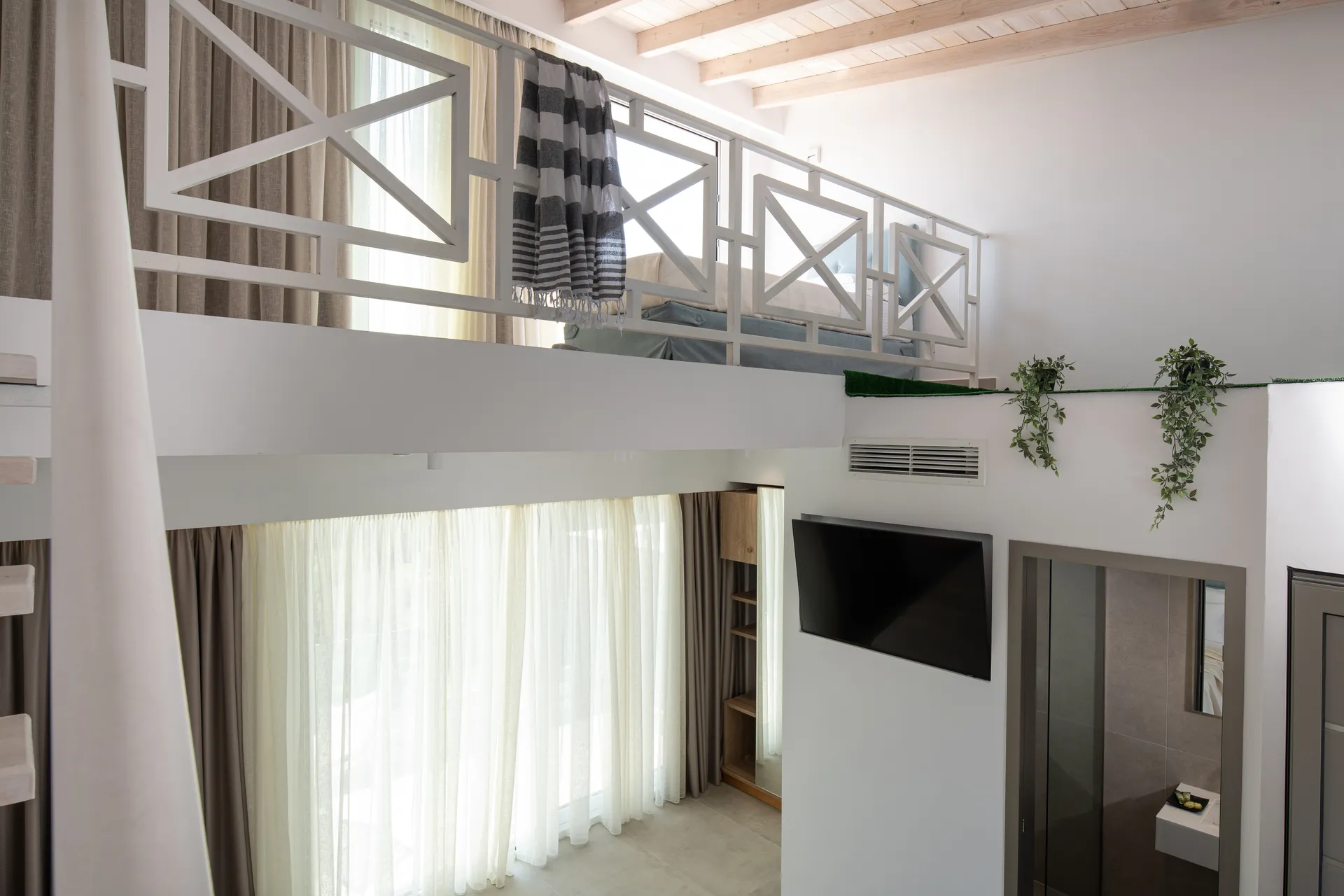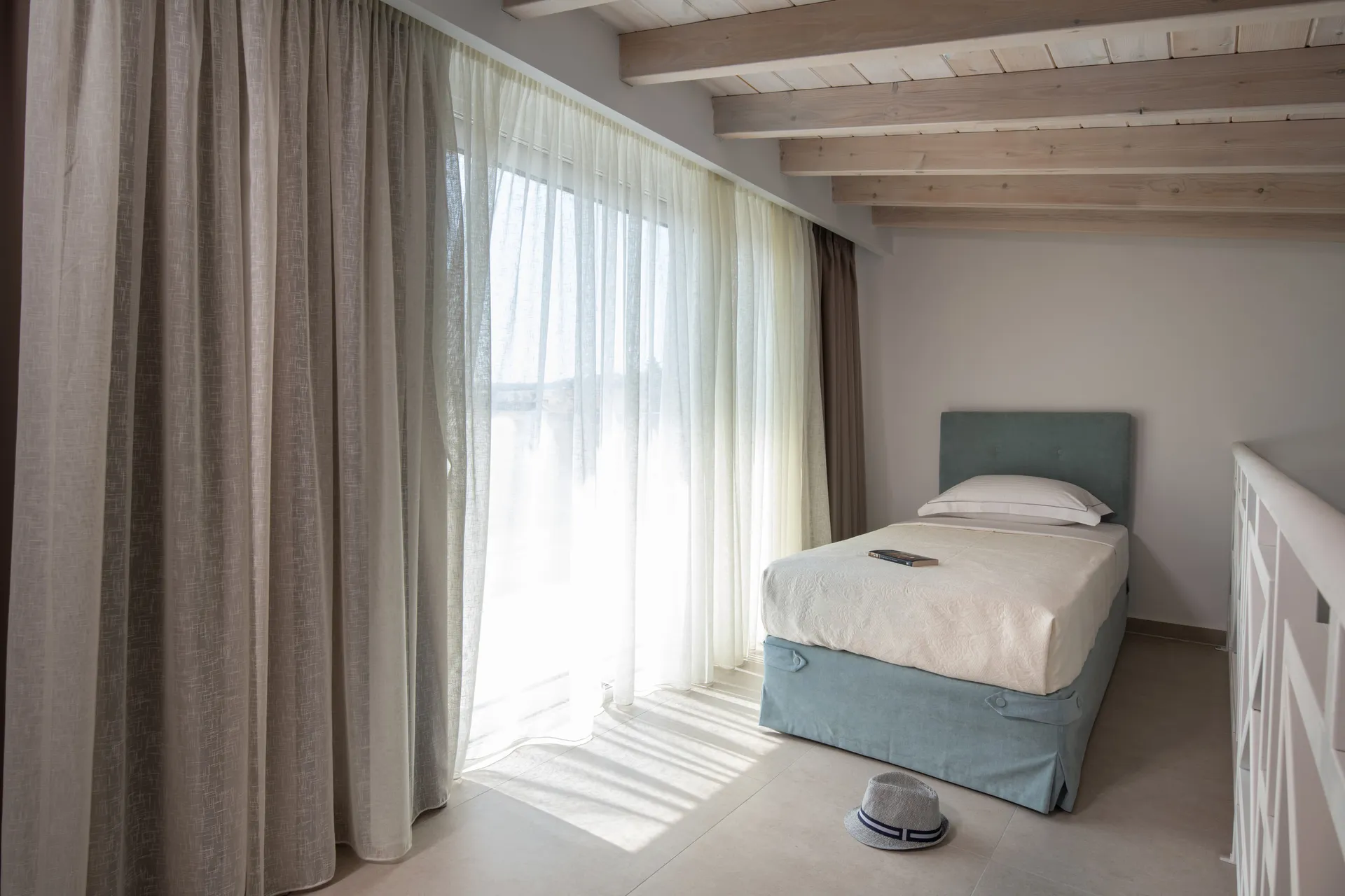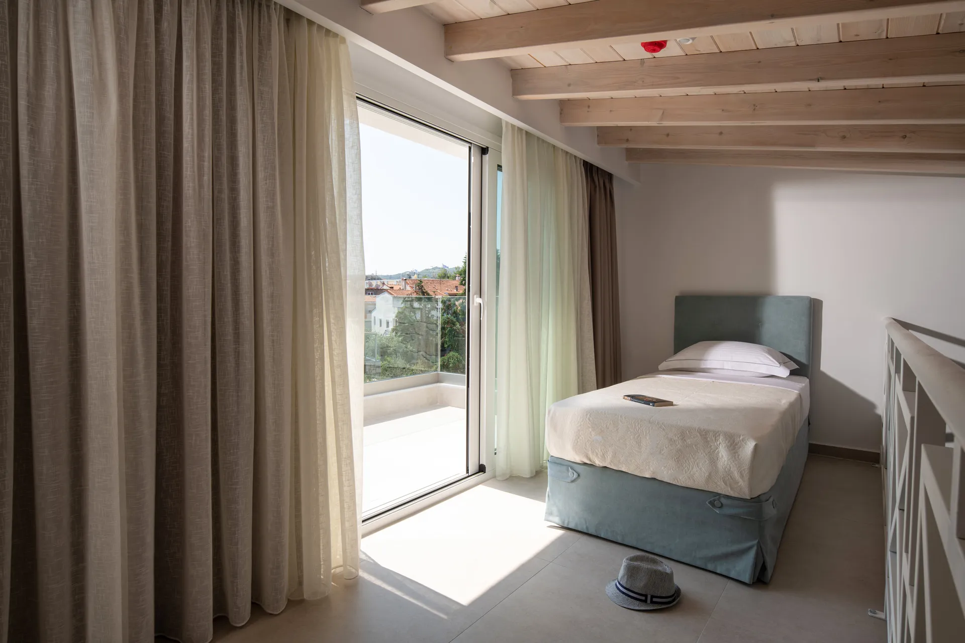 Prostrana trokrevetna soba od 25 m², sa potkrovljem, idealna za male porodice i parove. Ima udobno kupatilo, potkrovni prostor sa jednim krevetom i pristup terasi sa oba nivoa.