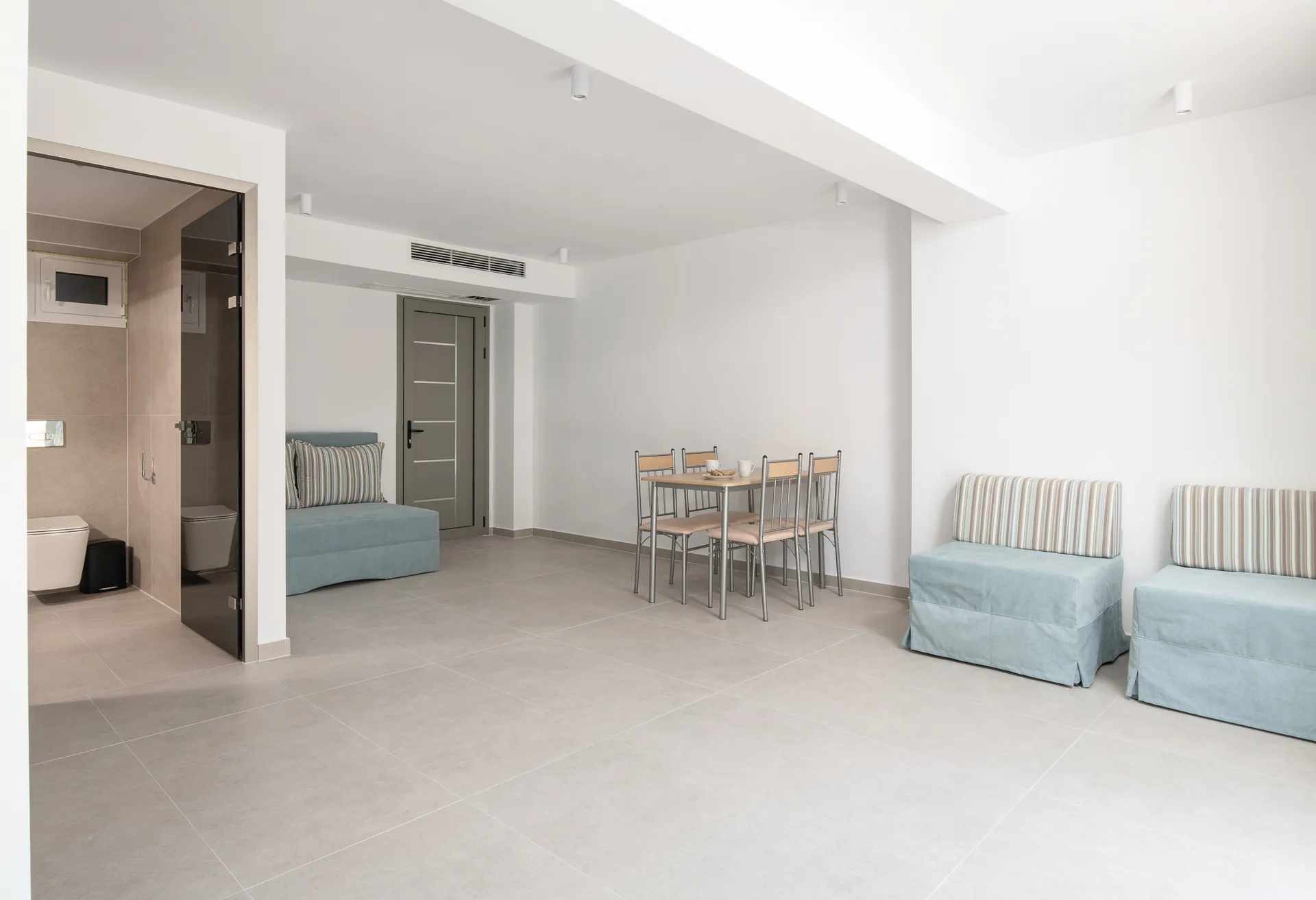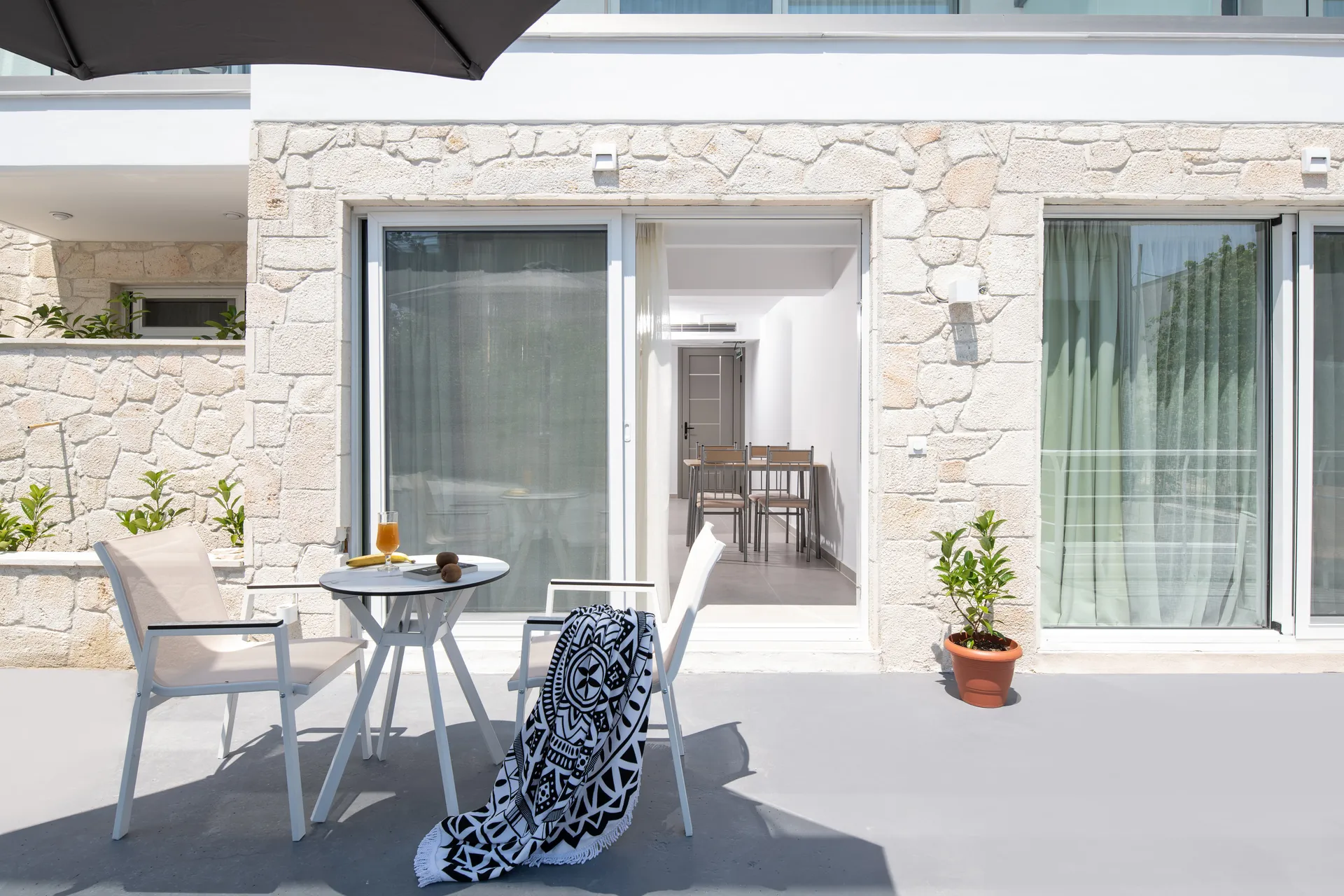 Veliki porodični apartman Mara od 37 m², idealan za porodice. Ima odvojenu spavaću sobu, prostranu dnevnu sobu sa dve dodatne sofe na razvlačenje, opremljenu kuhinju, udobno kupatilo i pristup bašti/bazenu.