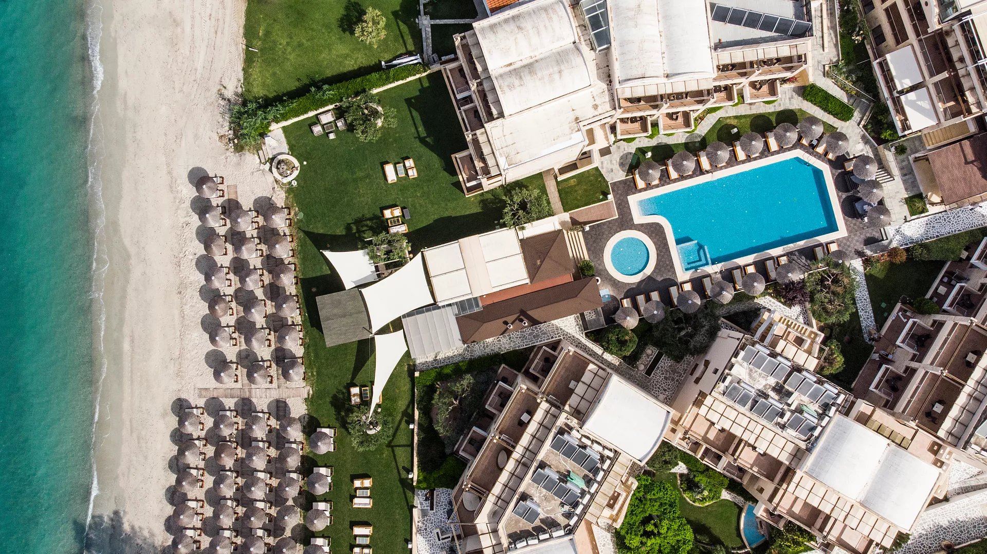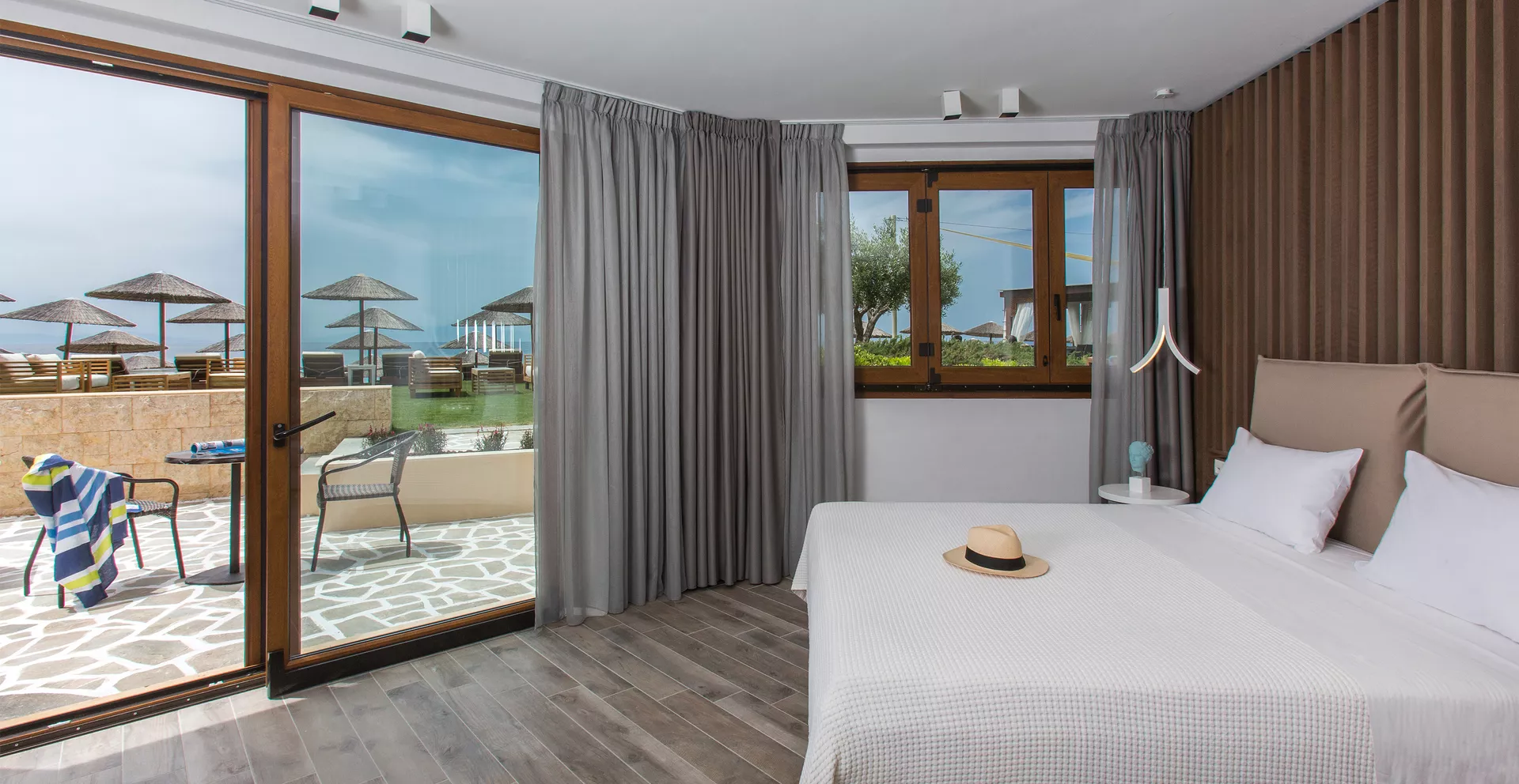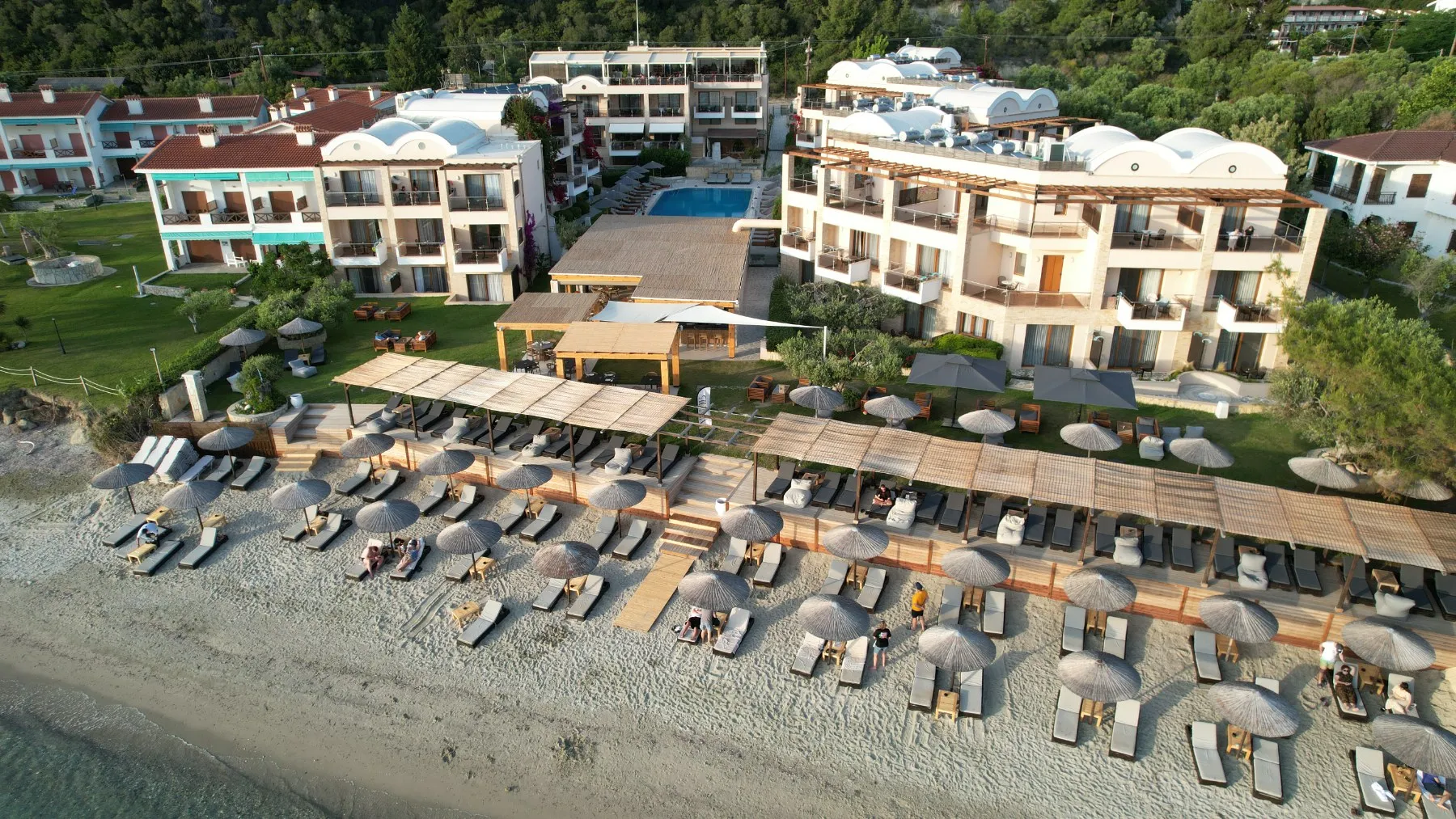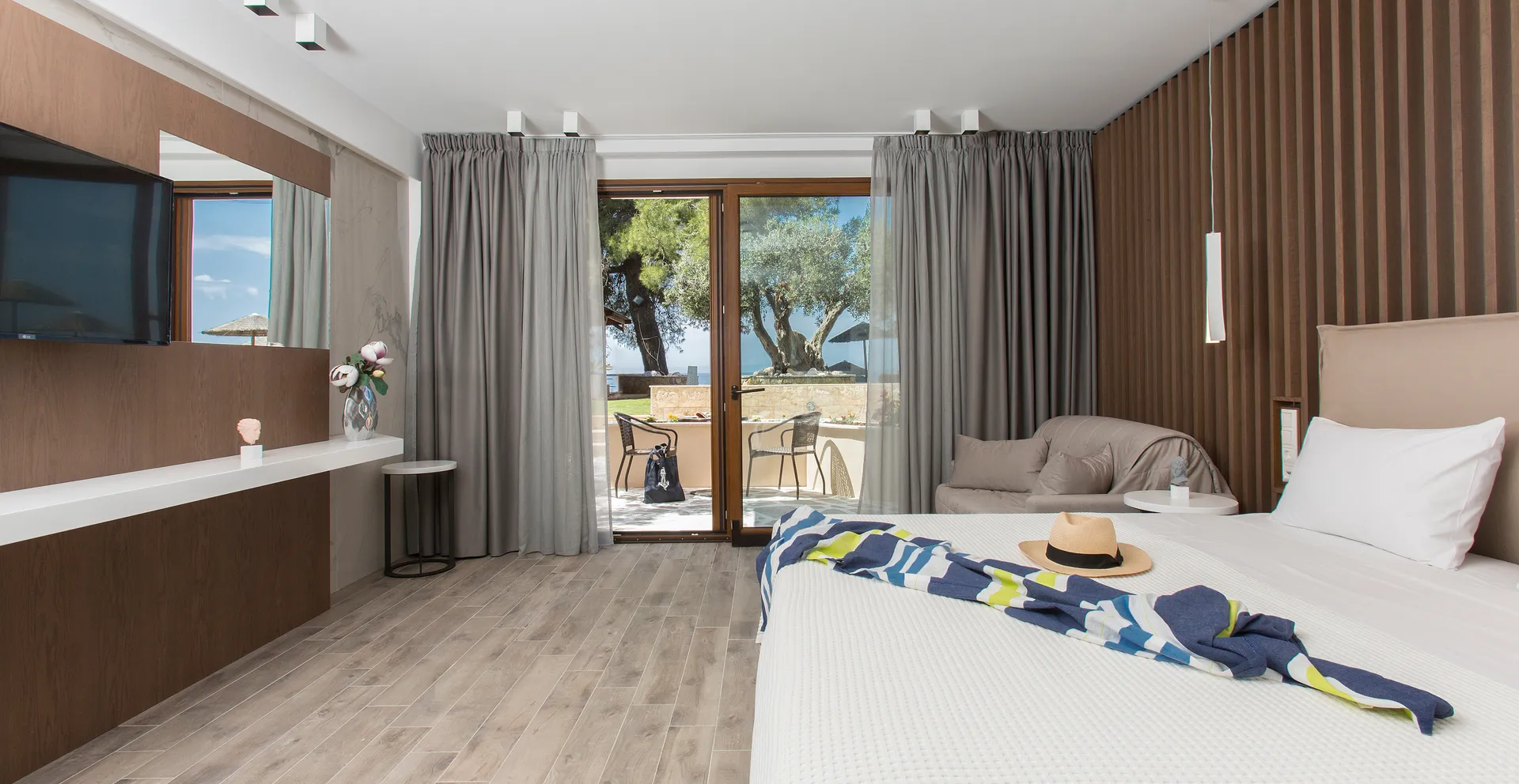 Zamislite sebe kako se opuštate na našoj netaknutoj plaži, istražujete kristalno čiste vode Halkidikija ili uživate u mediteranskim obrocima uz zvuk talasa kao muzičku podlogu. Naše luksuzne sobe i apartmani su dizajnirani da vam pruže maksimalnu udobnost, osiguravajući opuštajući boravak od početka do kraja.