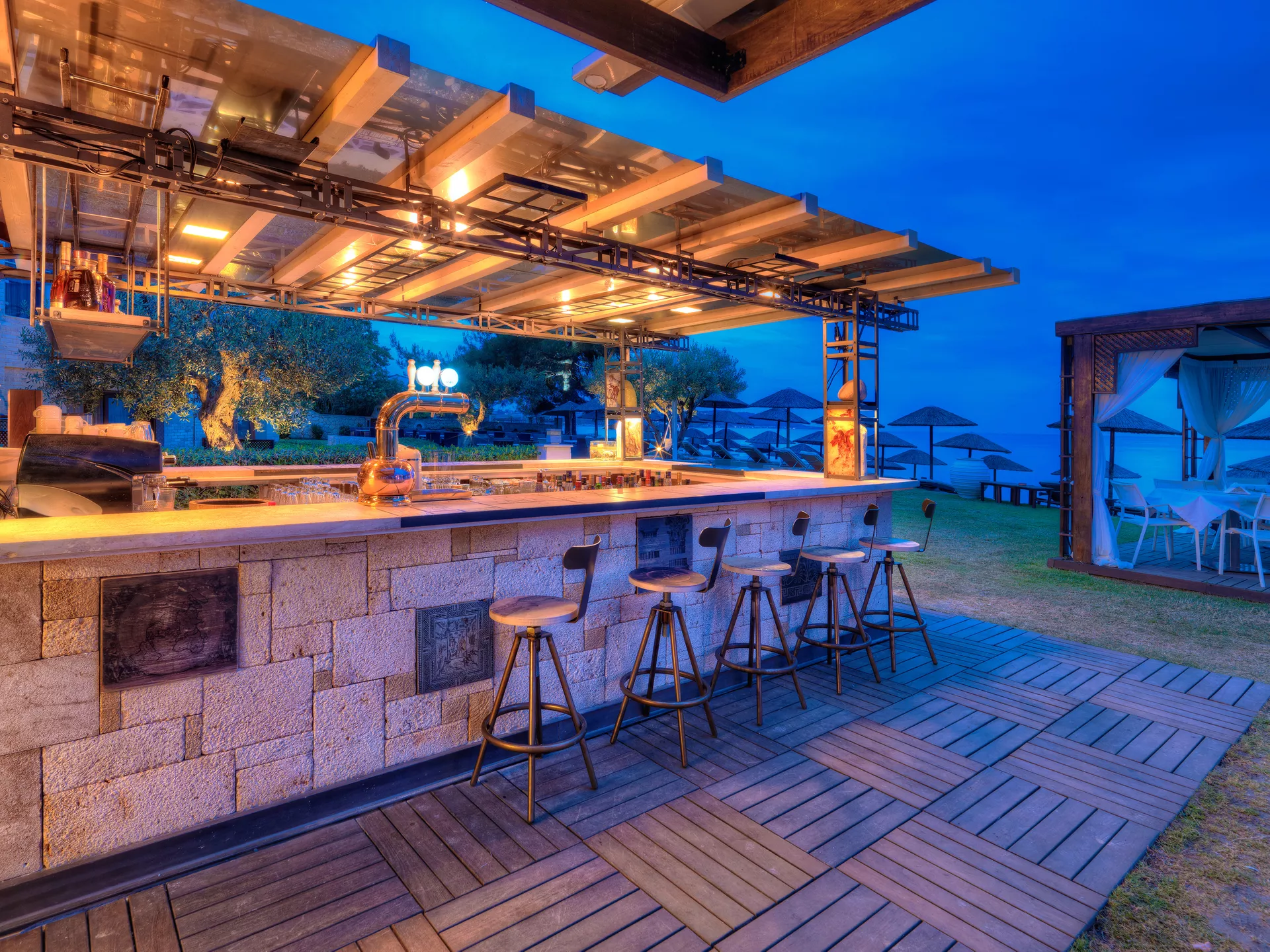Zamislite ovo: nebo obojeno u nijanse zlatne i ružičaste dok sunce zalazi ispod horizonta, bacajući svoj sjaj na Egejsko more. Uživajte u našoj mediteranskoj kuhinji, pijuckajte stručno pomešane koktele i nazdravite najboljim pogledima na Halkidikiju. Bilo da je u pitanju romantično veče ili proslava sa prijateljima, Olive obećava noći koje će vam ostati u sećanju.