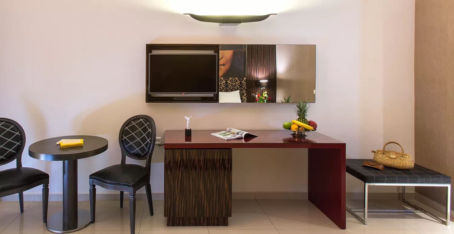 Deluks porodični apartman je jedini u hotelu. Ovaj tip sobe, na neverovatnoj lokaciji, idealan je za roditelje koji žele da podele kvalitetno vreme sa porodicom i opuštanje. Njegovih 55 m² osigurava da će cela vaša porodica uživati u ovom neverovatnom odmoru u hotelu Olimpion Sanset.