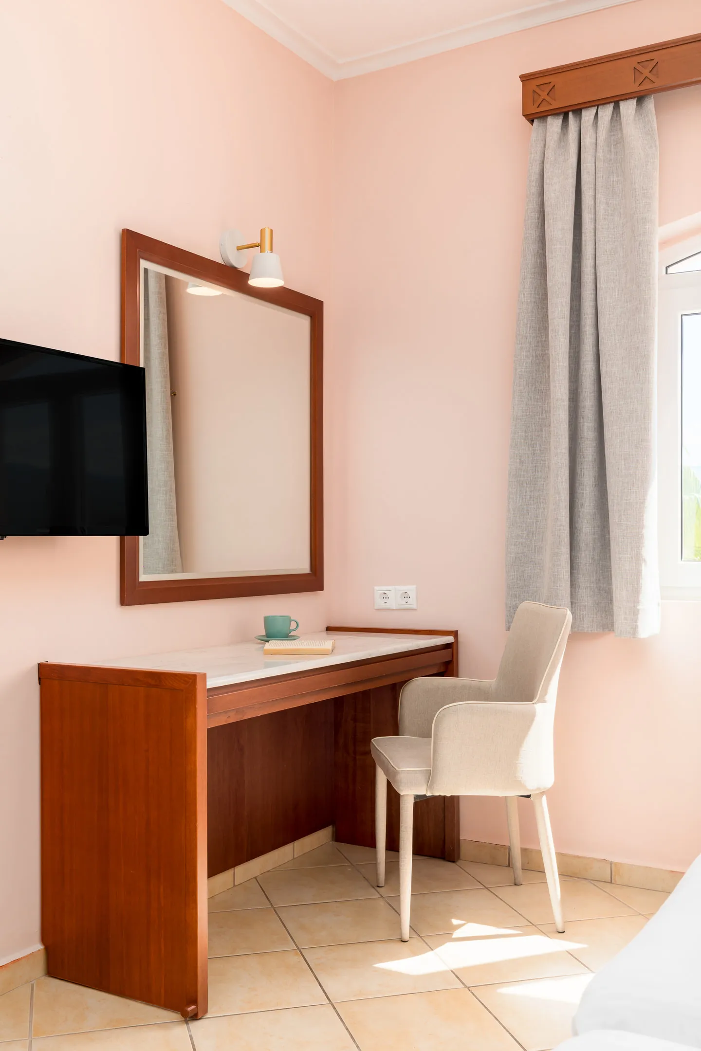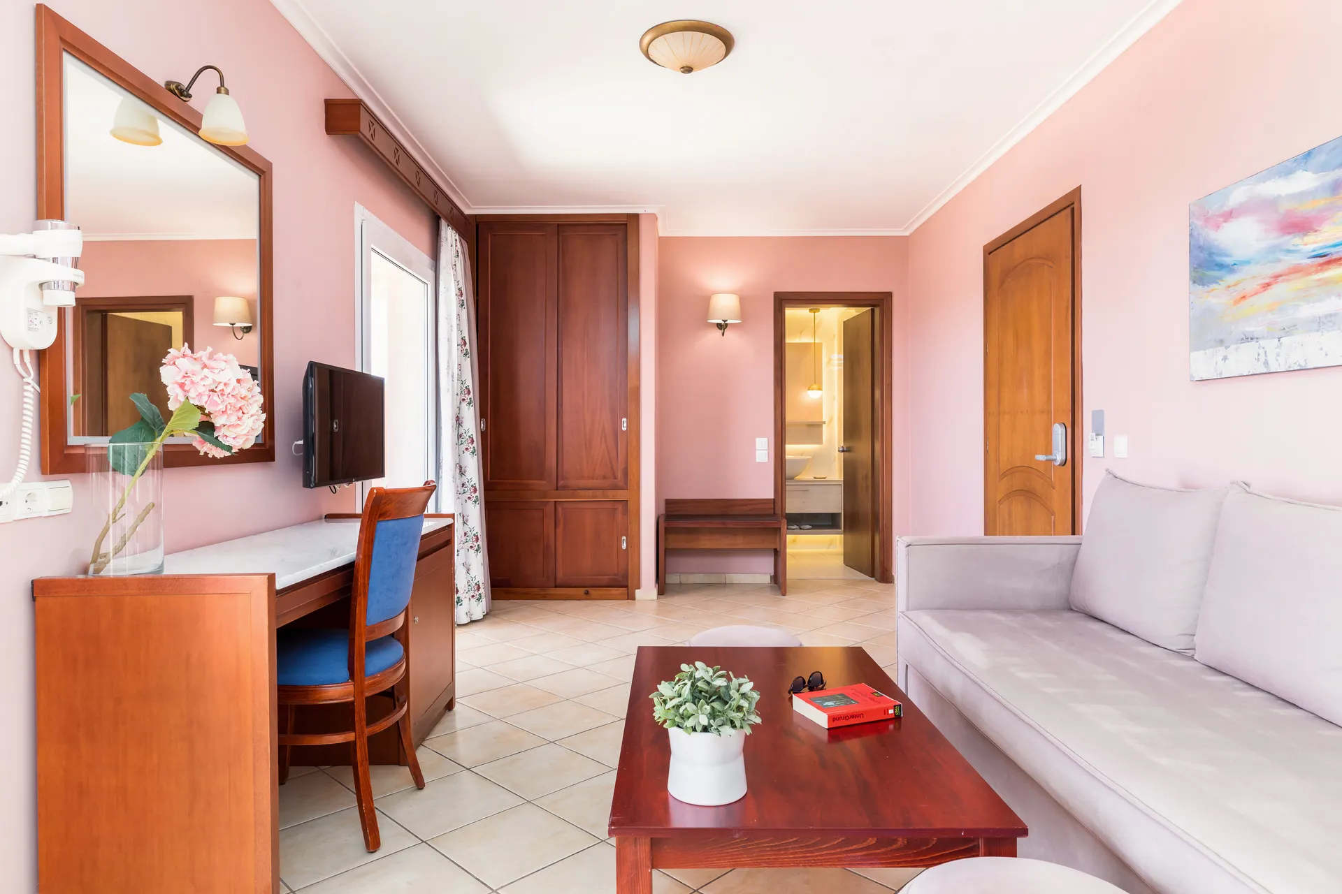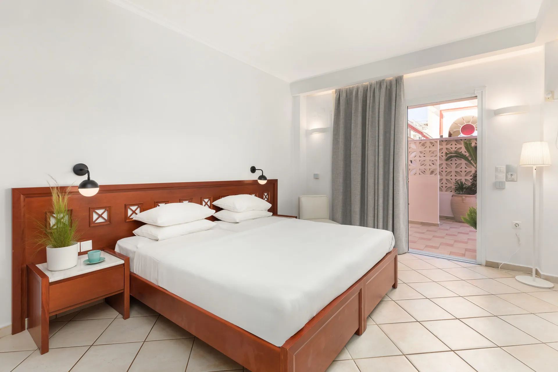 Prelepa dvokrevetna soba smeštena u prizemlju hotela, nudi iste sadržaje i inventar kao i klasične dvokrevetne sobe i prelepu terasu pored bazena. Ova soba ima prelepo kupatilo sa tuš kabinom i atmosferskim osvetljenjem. Idealna za one koji traže apsolutnu privatnost u luksuzu hotela sa bazenom u Nei Poriju, Olimpska rivijera!