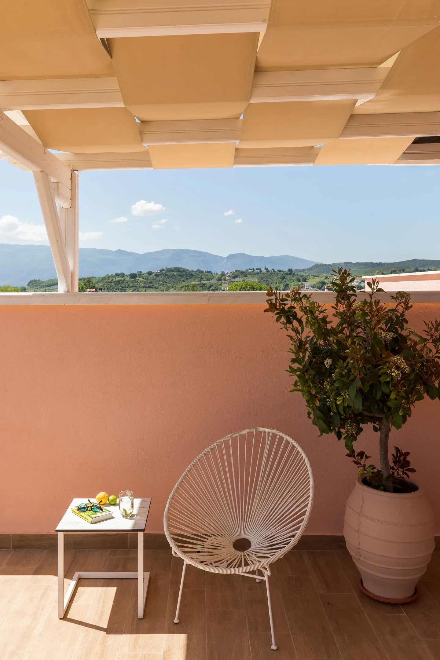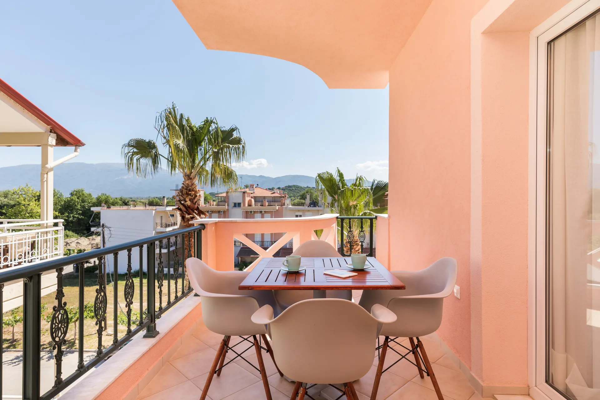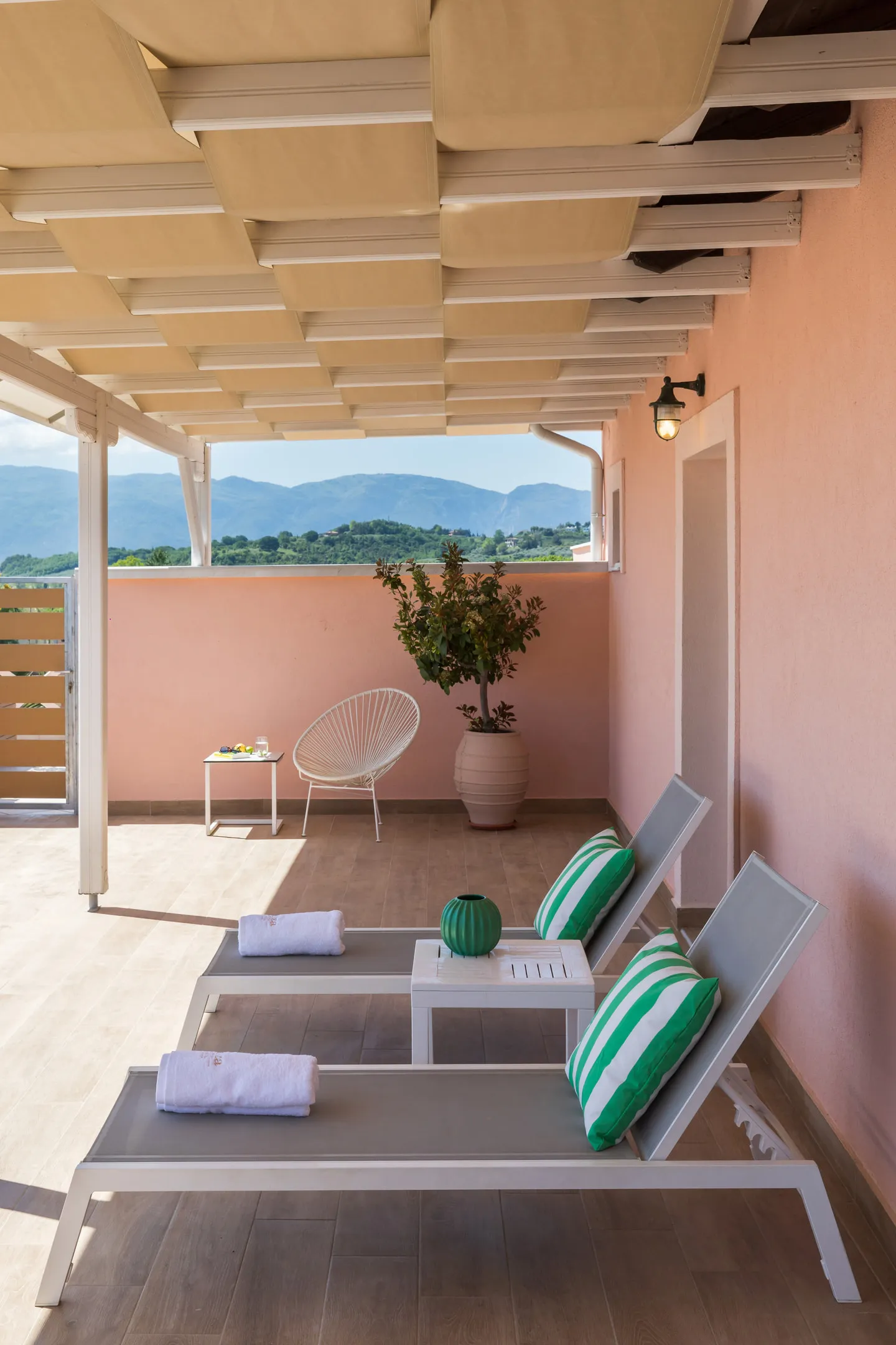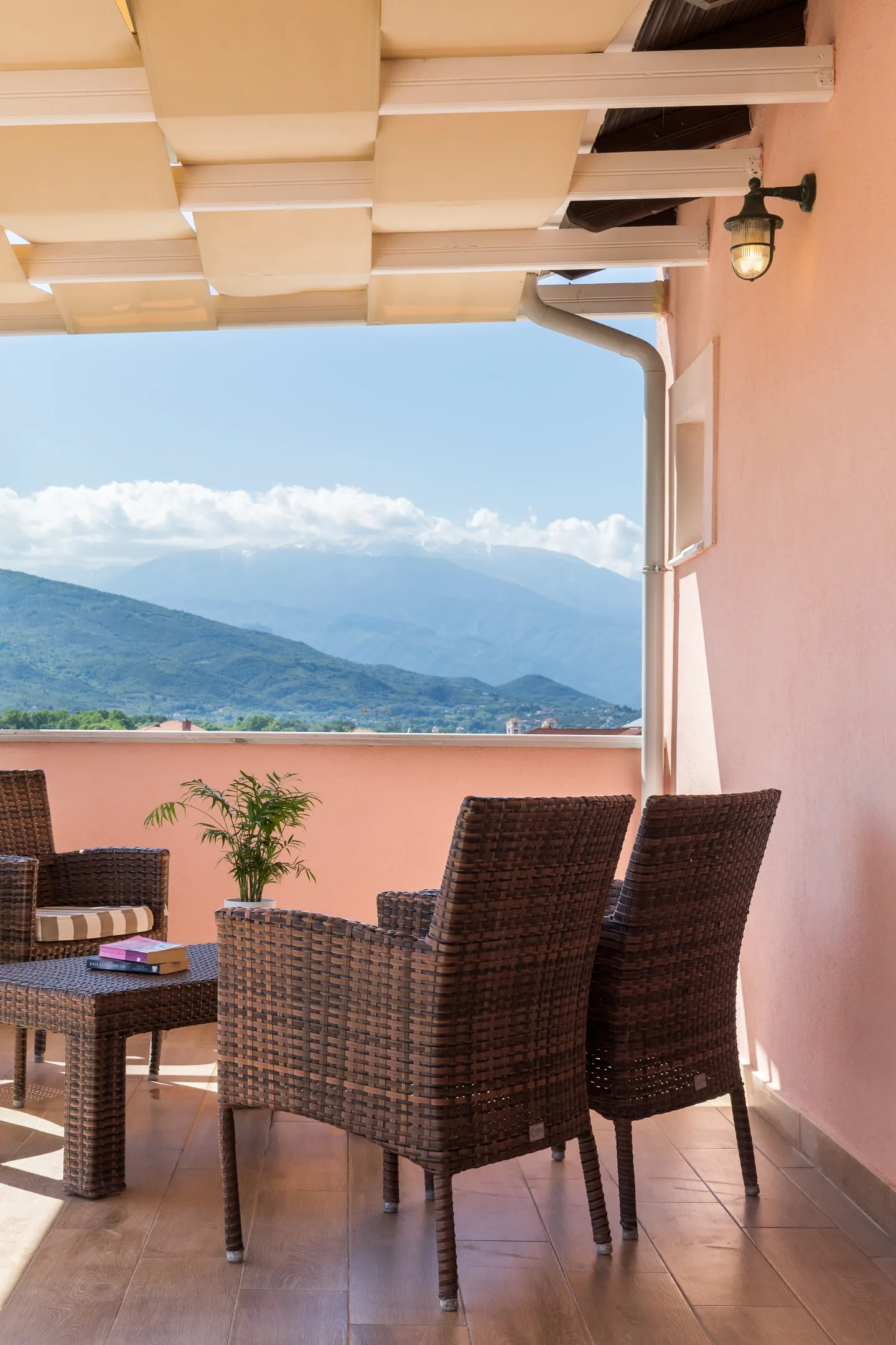 Nalazi se na 4. spratu i ima verandu od 35m² sa zapadnom orijentacijom, panoramskim pogledom na planine (Olimp i Osa), sofom i ležaljkama. Takođe ima neverovatno atmosfersko novo i prostrano kupatilo. Sanjarski izbor za vrhunsko opuštanje, privatnost tokom vašeg boravka i neverovatne zalaske sunca.