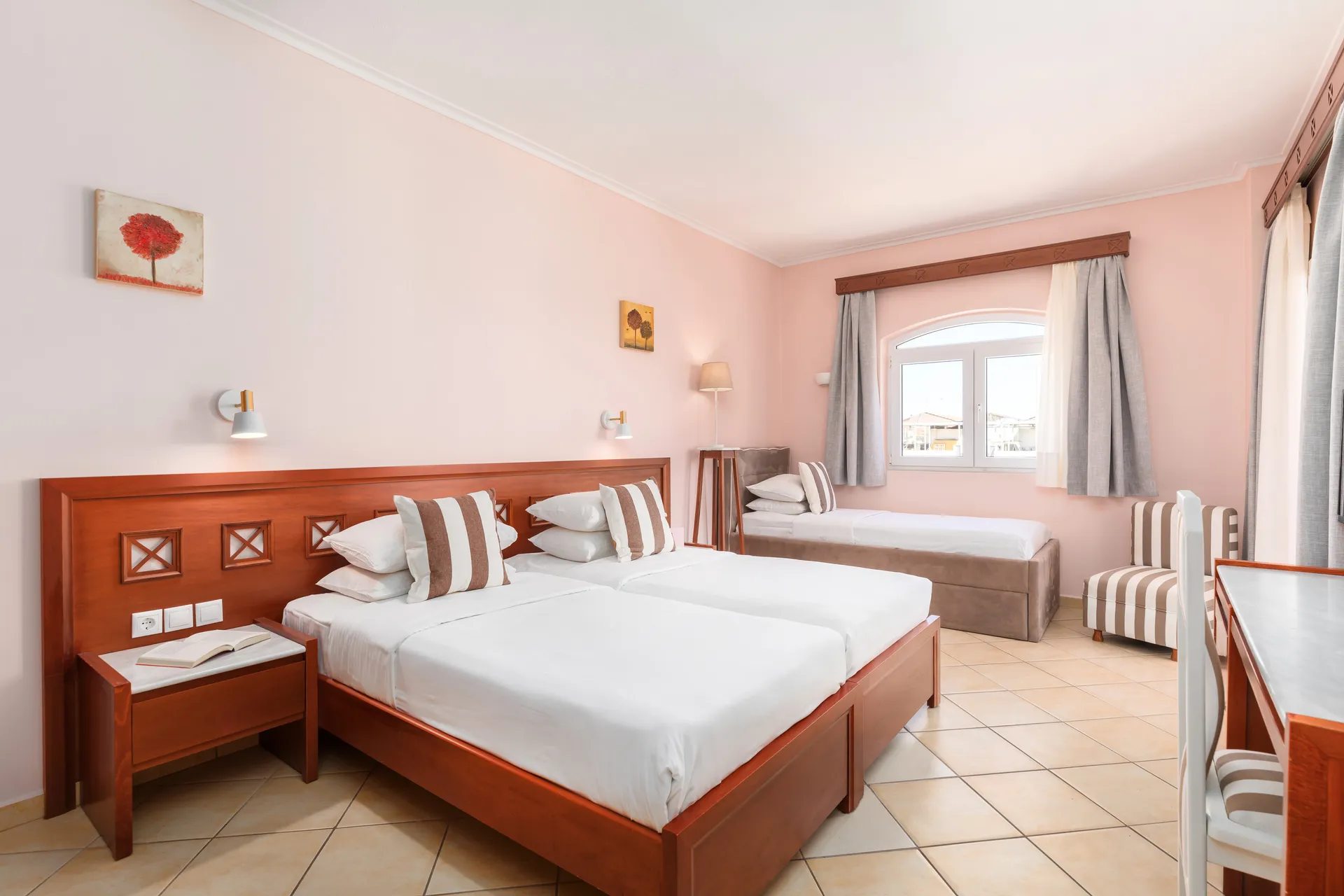 Trokrevetna soba sa dva jednokrevetna kreveta (spojena kao bračni krevet ili odvojeno) i jednim jednokrevetnim krevetom.