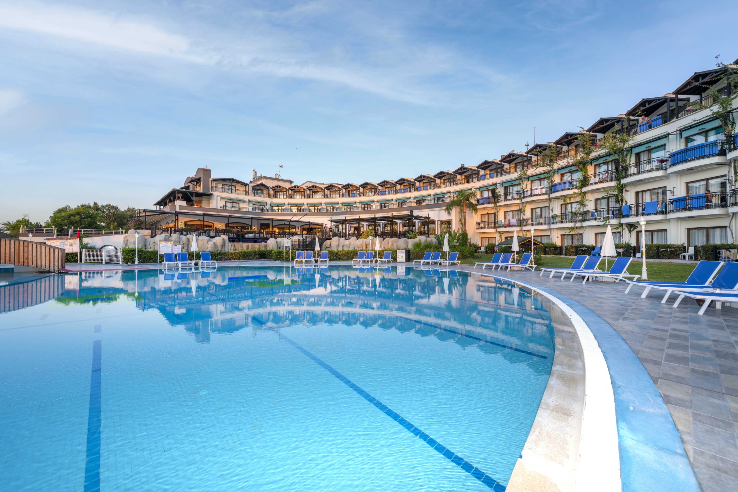 Sadržaj hotela: U sklopu hotela nalazi se glavni restoran kao i riblji a la carte restoran u kome možete probati odlične morske specijalitete, bazeni na otvorenom i zatvorenom za decu i odrasle, akvapark sa tri vodena tobogana, Wellne, Spa i fitness centar, više barova u okviru hotelskog kompleksa, poslastičara. Kids club, mini disko, igraonica, dnevne sportske aktivnosti organizovane od strane animacionog tima, uživo muzika određenim danima u toku nedelje, sportovi na vodi, bilijar, stoni tenis, aerobik, odbojka na plaži, teniski tereni.