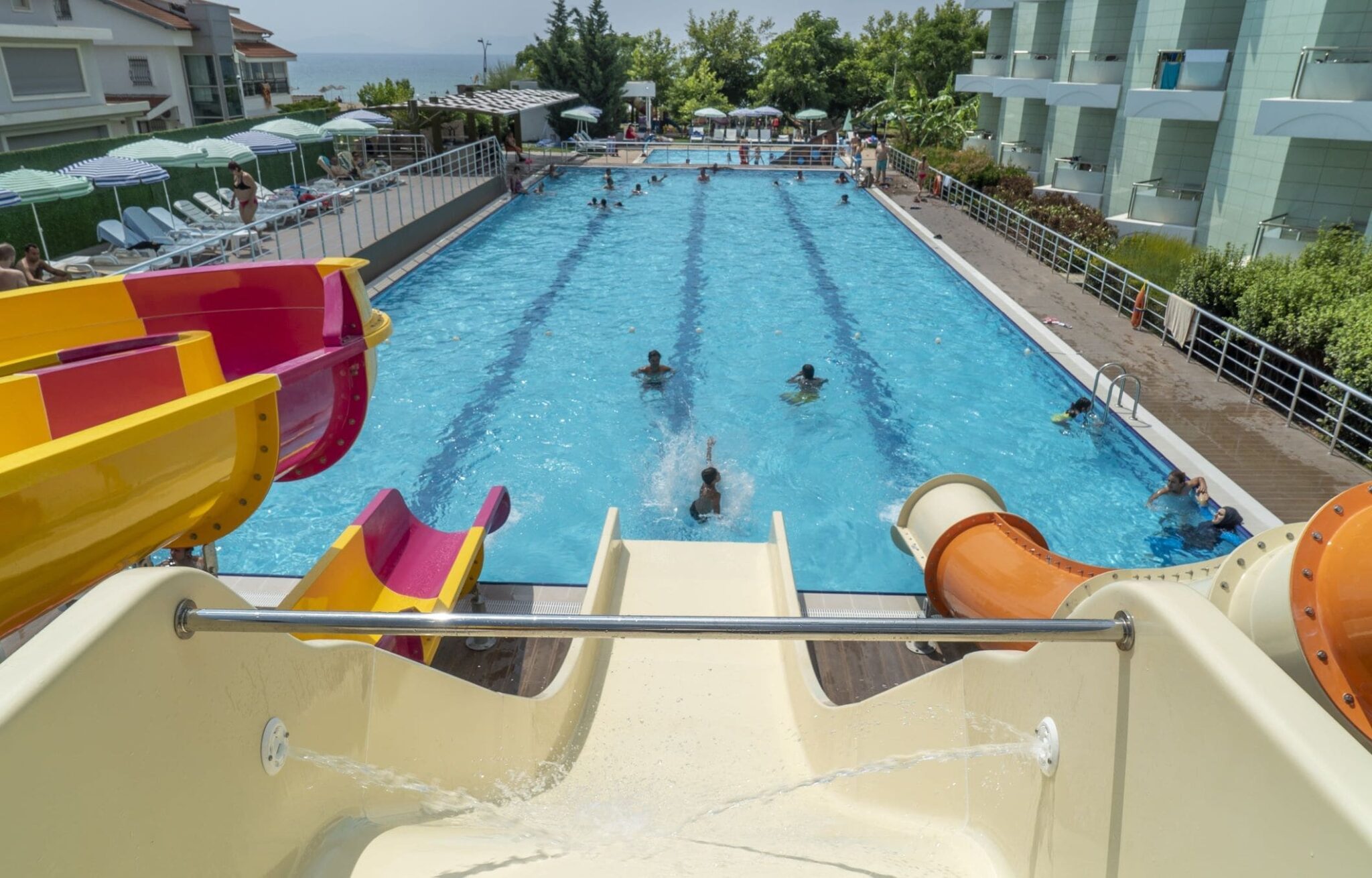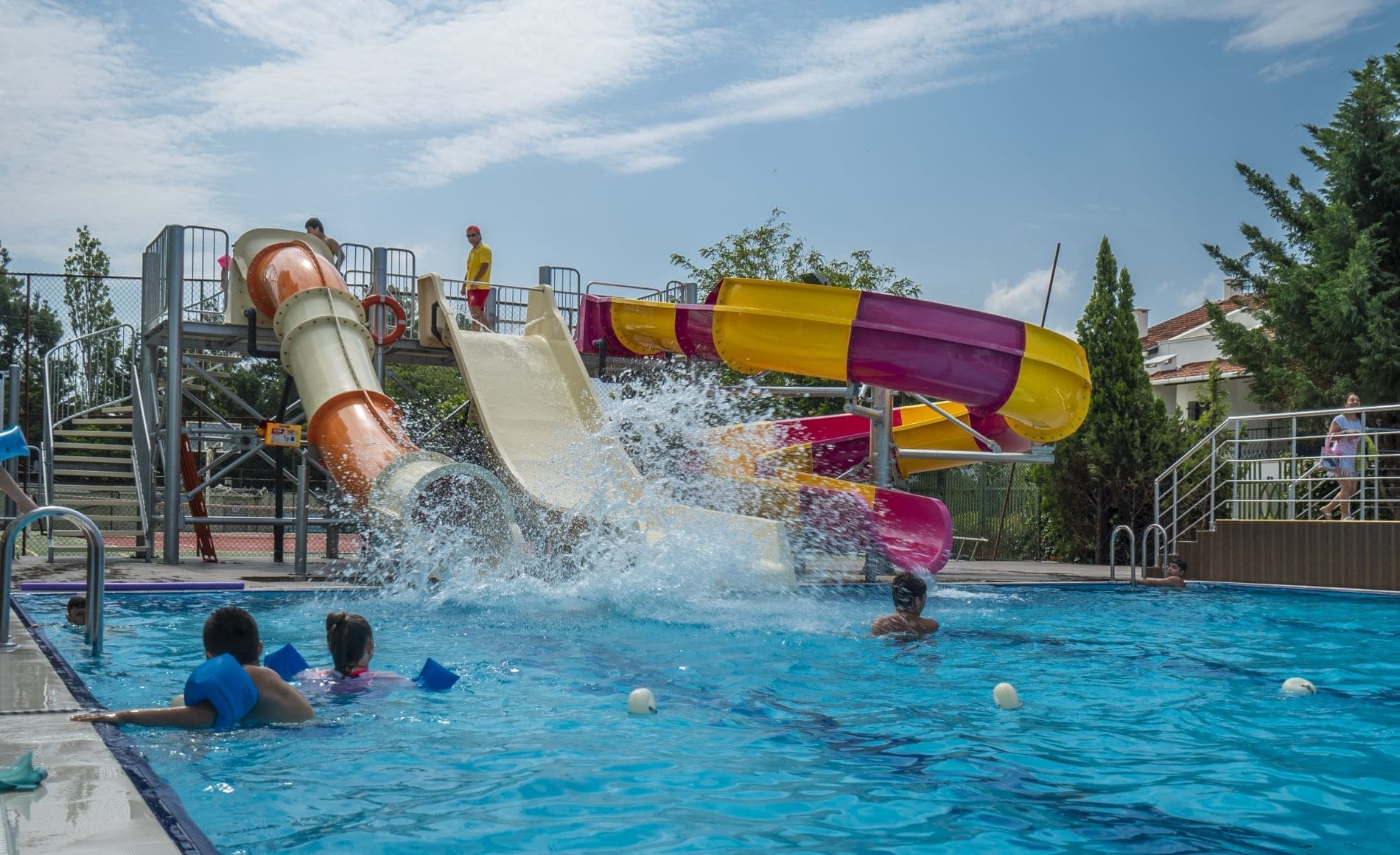 Zabavite se i osvežite u našem bazenu od 450 m², dubine 140 cm u akvaparku sa toboganima.