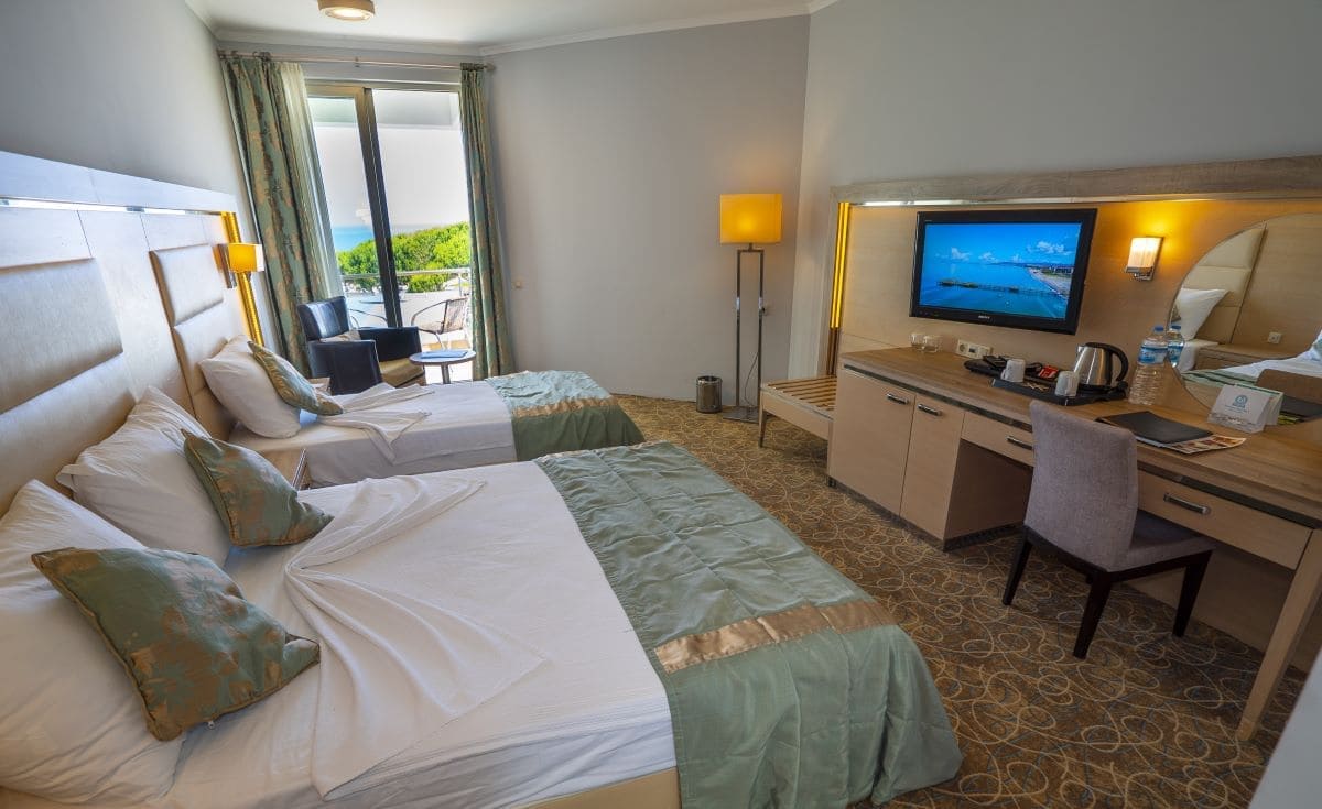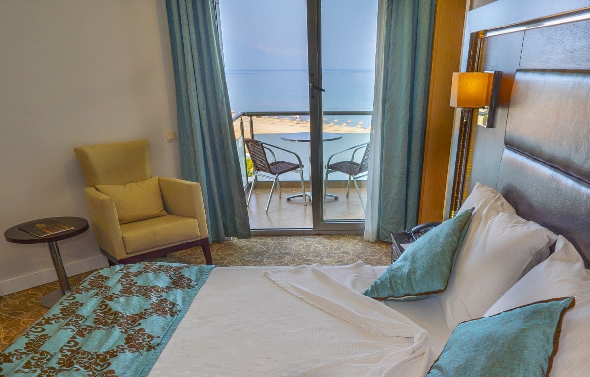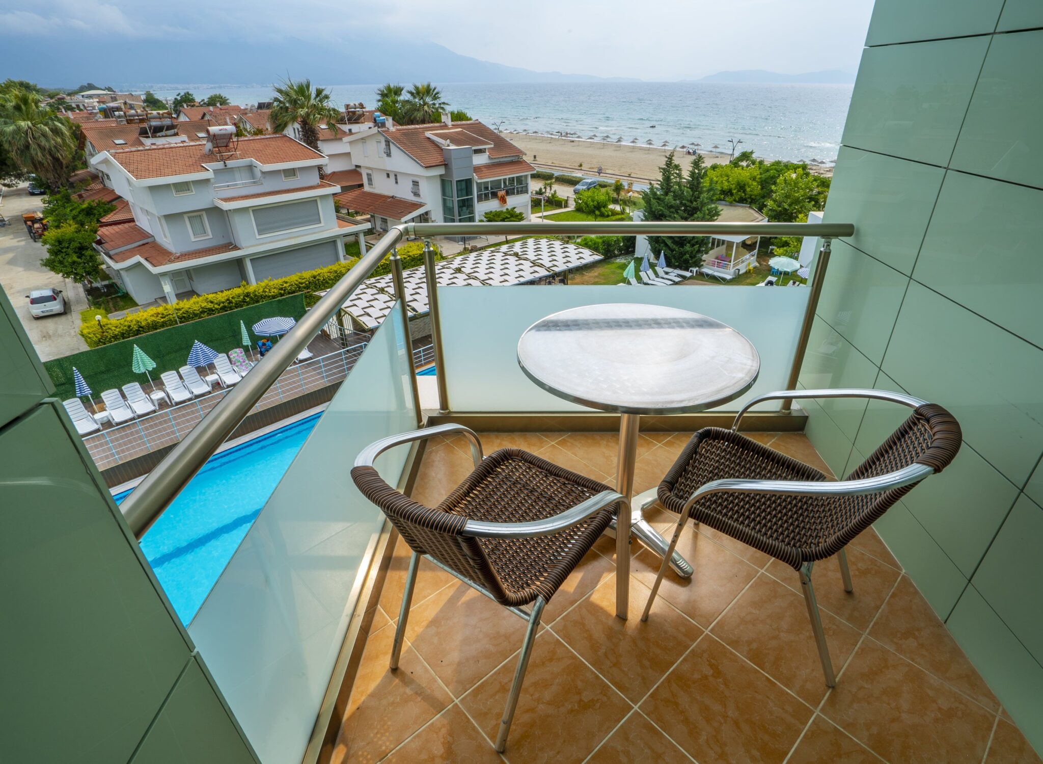 Naše sobe sa pogledom na more, koje kombinuju jedinstveno plavetnilo Egejskog mora sa mirom, dizajnirane su za vašu udobnost kao kod kuće. Pozivamo vas da se odmorite u ovim sobama koje su dizajnirane sa modernim dizajnom i šik dekoracijom.