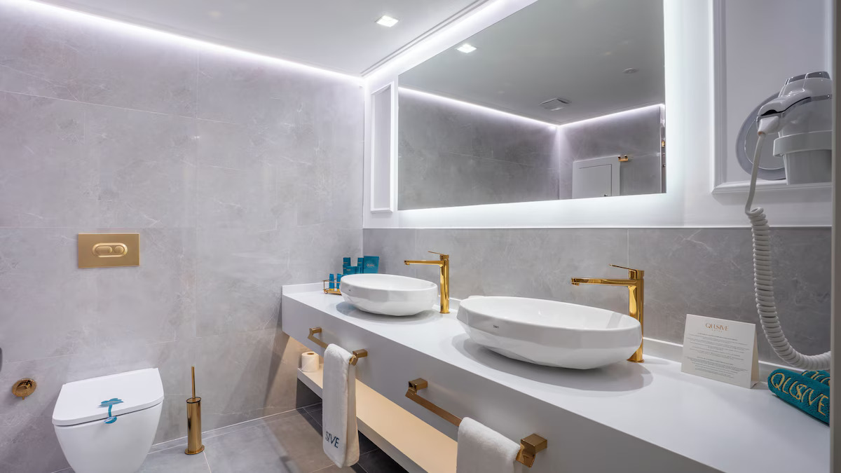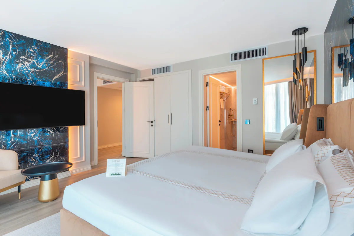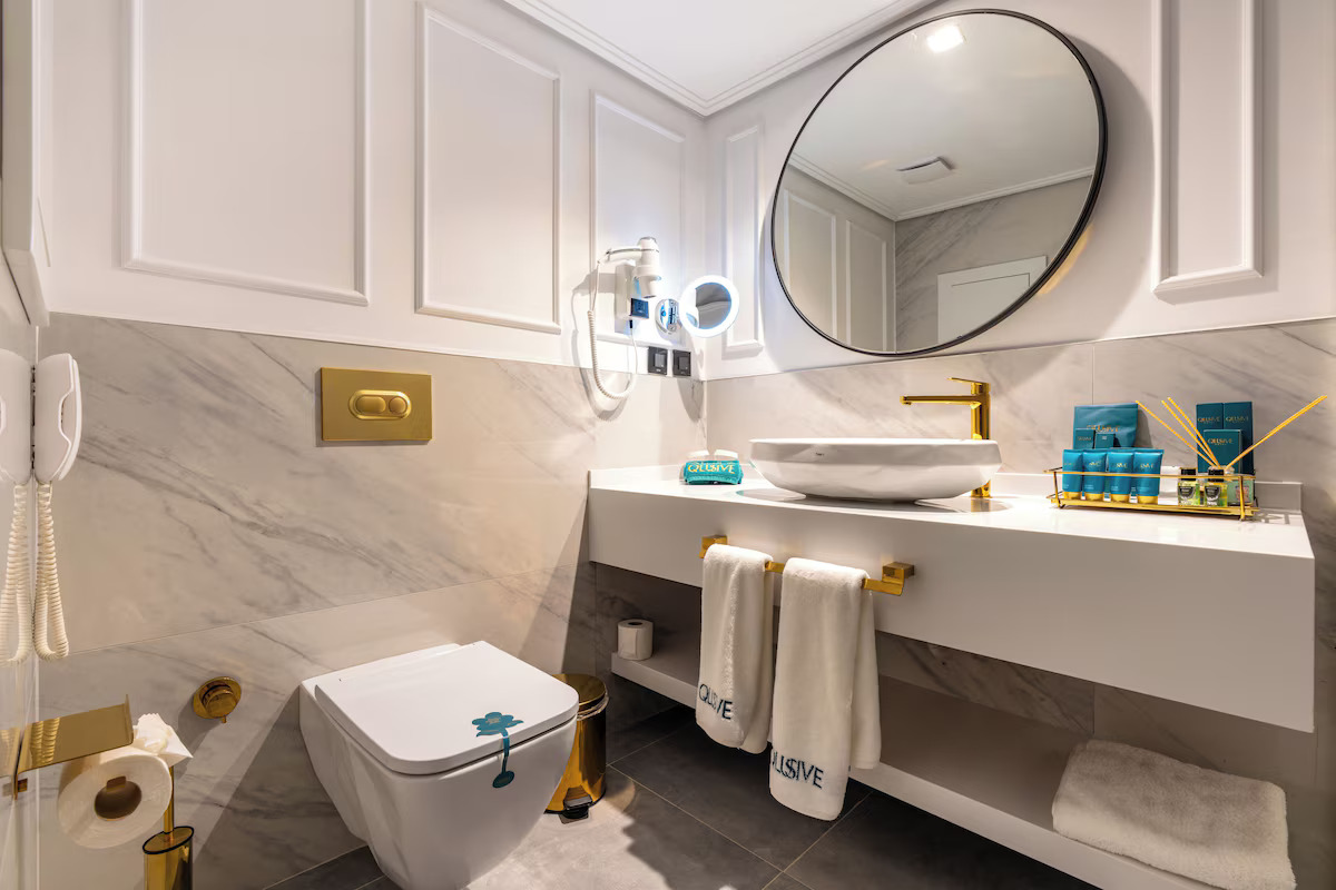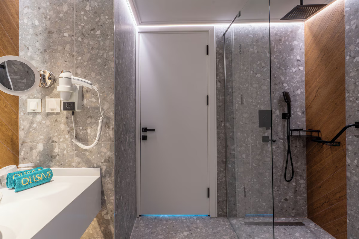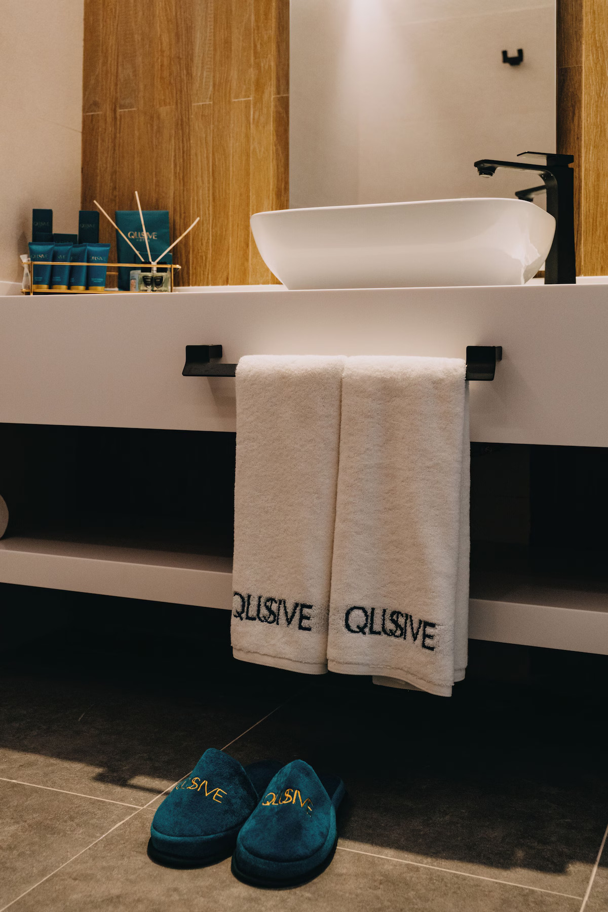 U objektu Qlusive Hotel sve jedinice sadrže ormar. Sve sobe za goste u objektu Qlusive Hotel imaju flat-screen televizor, klima-uređaj, kao i sopstveno kupatilo sa tušem i besplatnim toaletnim priborom, dok neke smeštajne jedinice uključuju i terasu. U objektu Qlusive Hotel sve smeštajne jedinice uključuju posteljinu i peškire. Većina soba ima balkon sa pogledom za uživanje gostiju. Neke smeštajne jedinice imaju bočni pogled na more. Smeštajne jedinice sa tepihom imaju bračni krevet. Takođe su dostupne odvojene spavaće sobe.